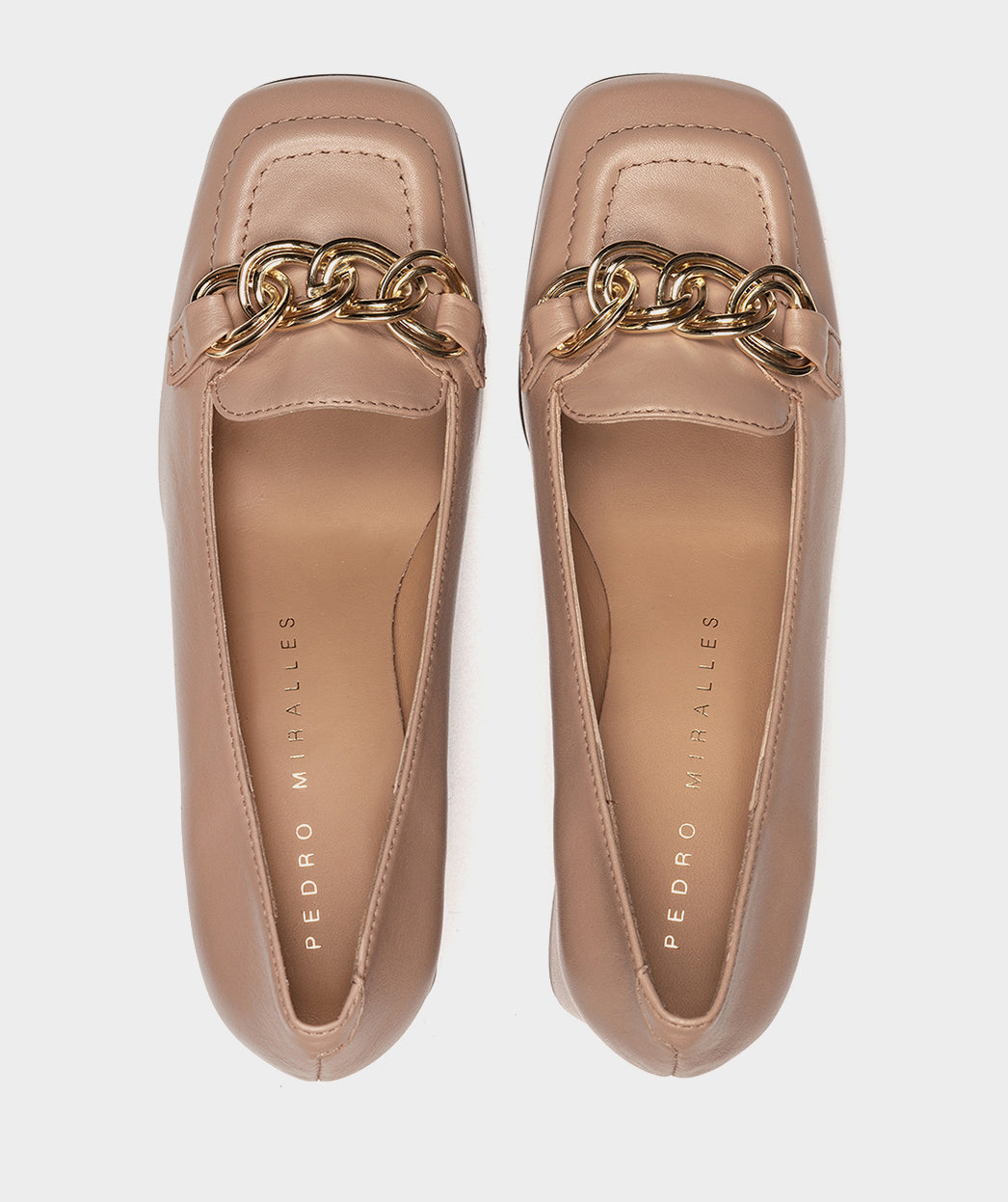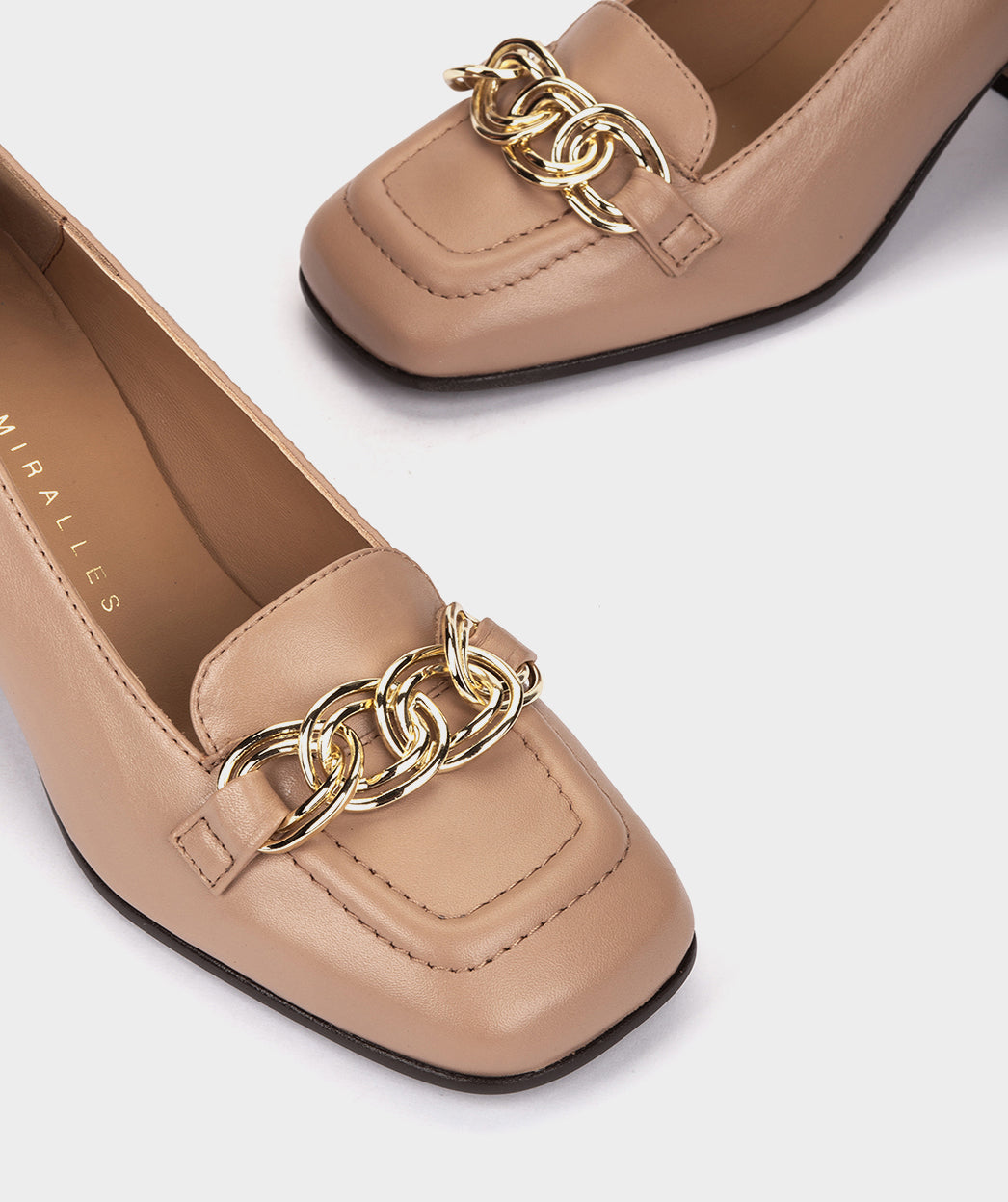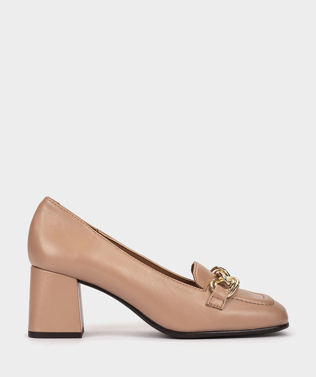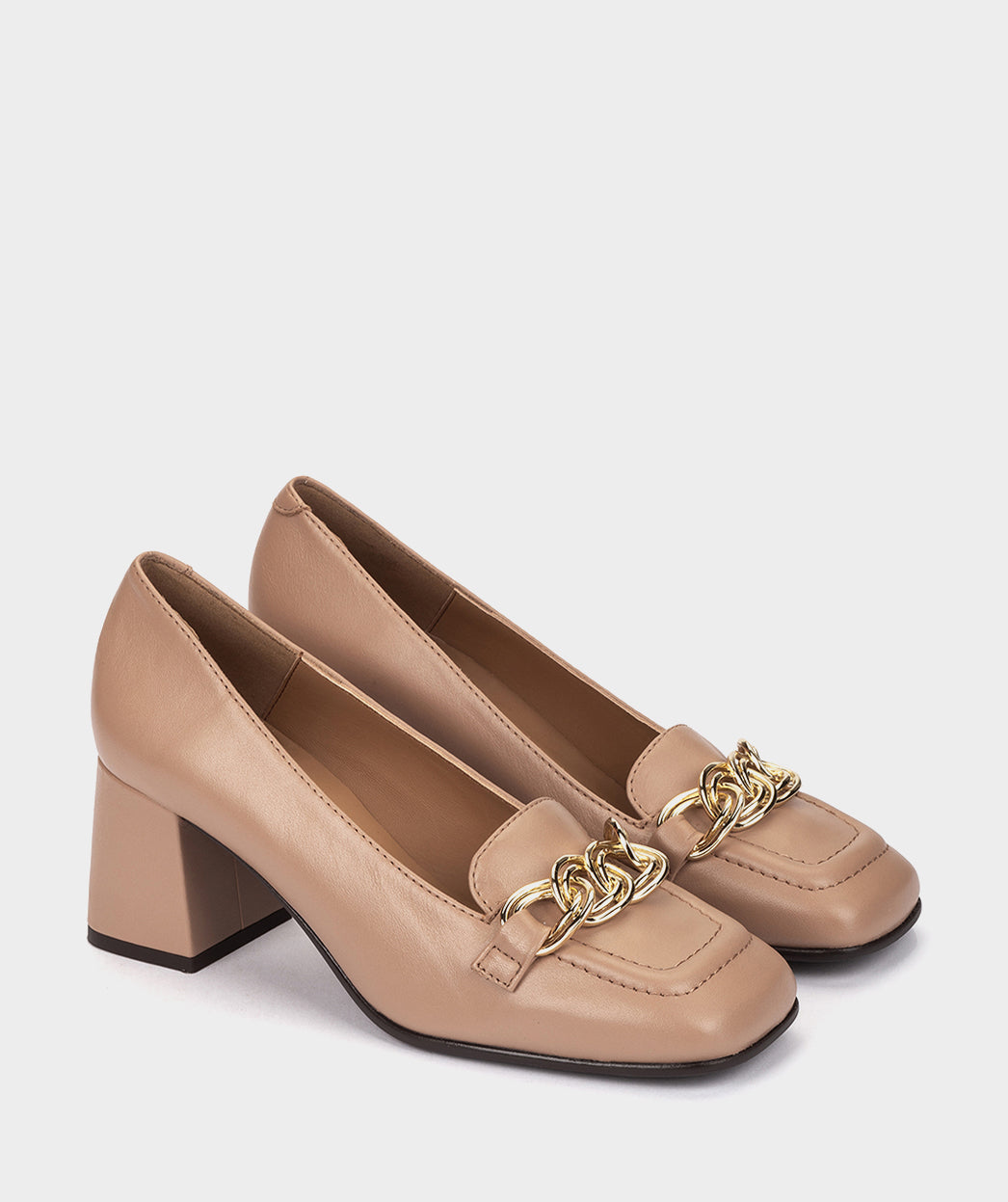 Zapatos de tacón de piel de color beige. Este modelo es un clásico que se convertirá en tu imprescindible de la temporada. La hebilla frontal colocada sobre el empeine le aporta un toque sofisticado.