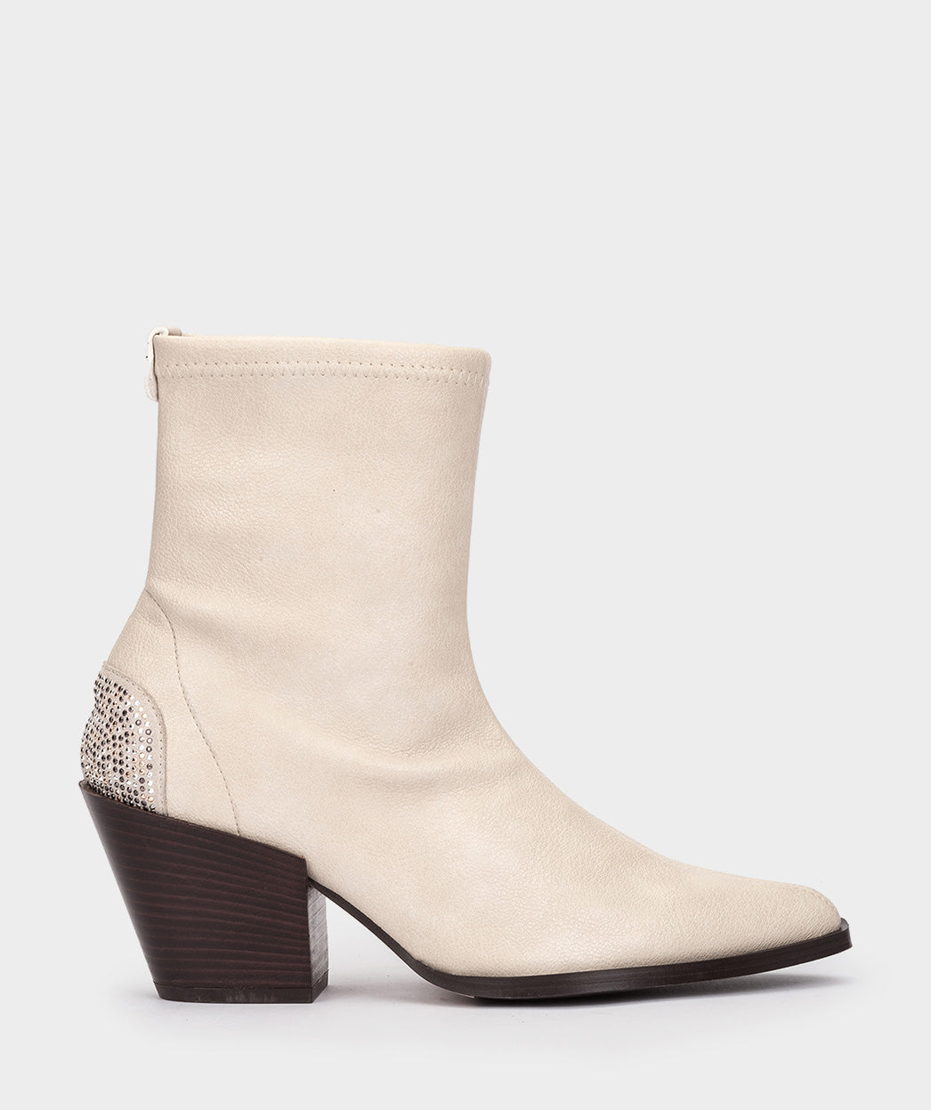 Botines estilo cowboy de tejido elástico de color blanco. Un modelo que destaca por el detalle de los brillos en el talón. Sofisticción y estilo se unen para crear el modelo REZNOS.