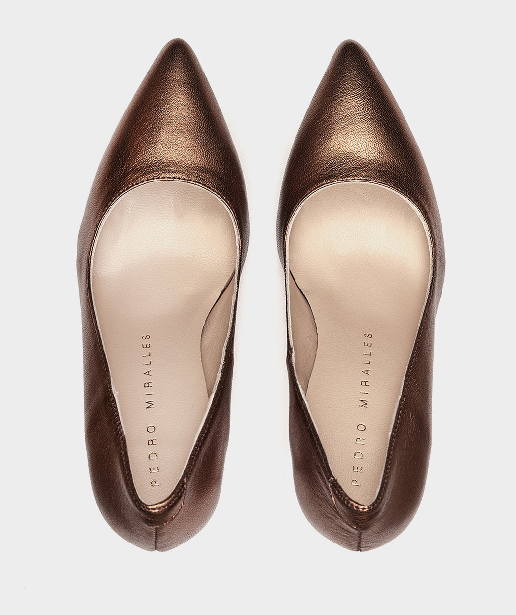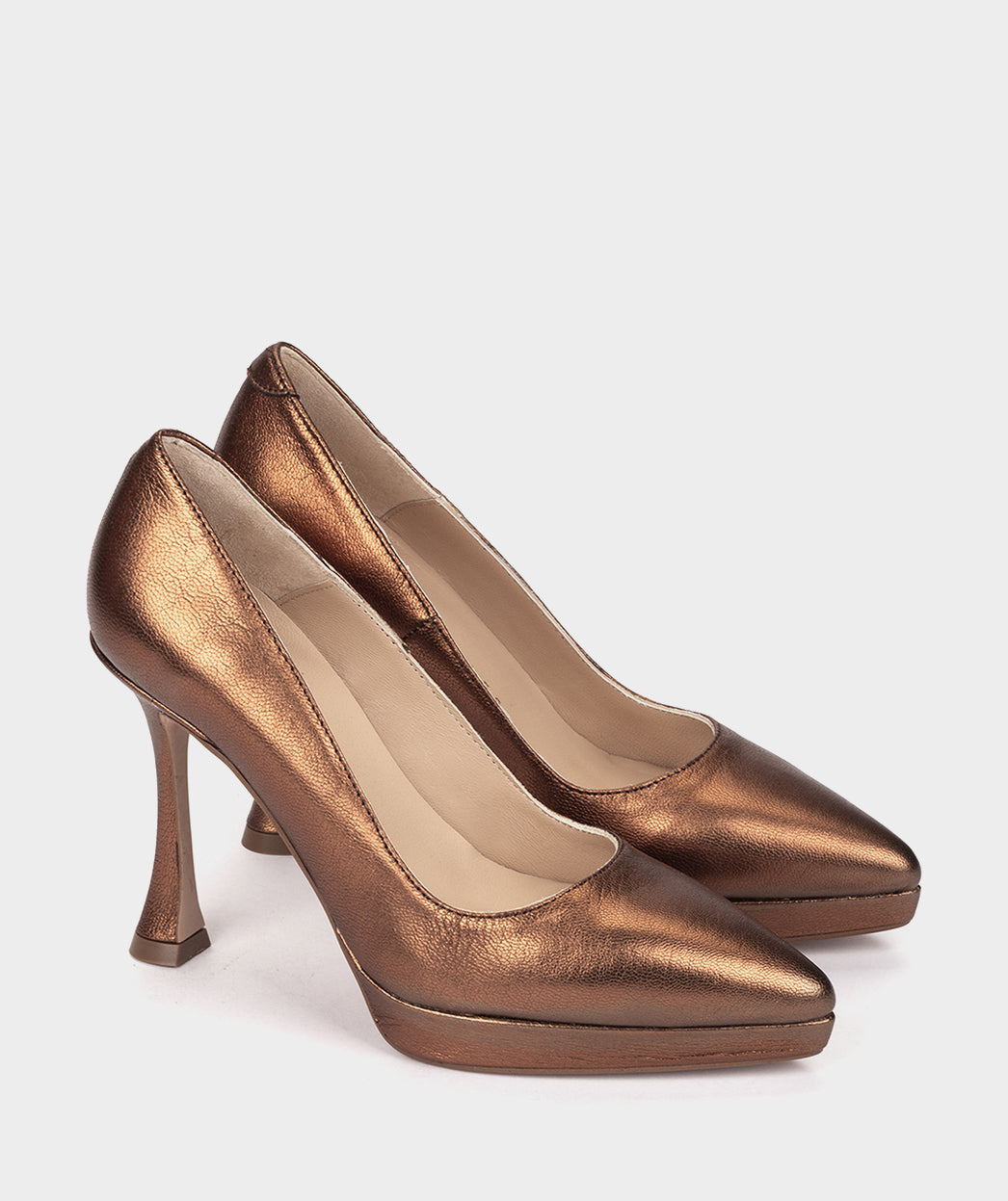 Zapatos de tacón de metalizada de color bronce. Este modelo de punta redonda es ideal por sus detalles originales, como la forma del tacón, y por su cómoda plataforma.