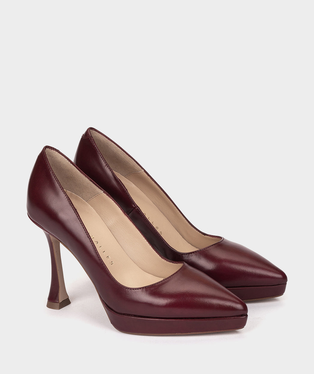 Zapatos de tacón de piel de color burdeos. Este modelo de punta redonda es ideal por sus detalles originales, como la forma del tacón, y por su cómoda plataforma.