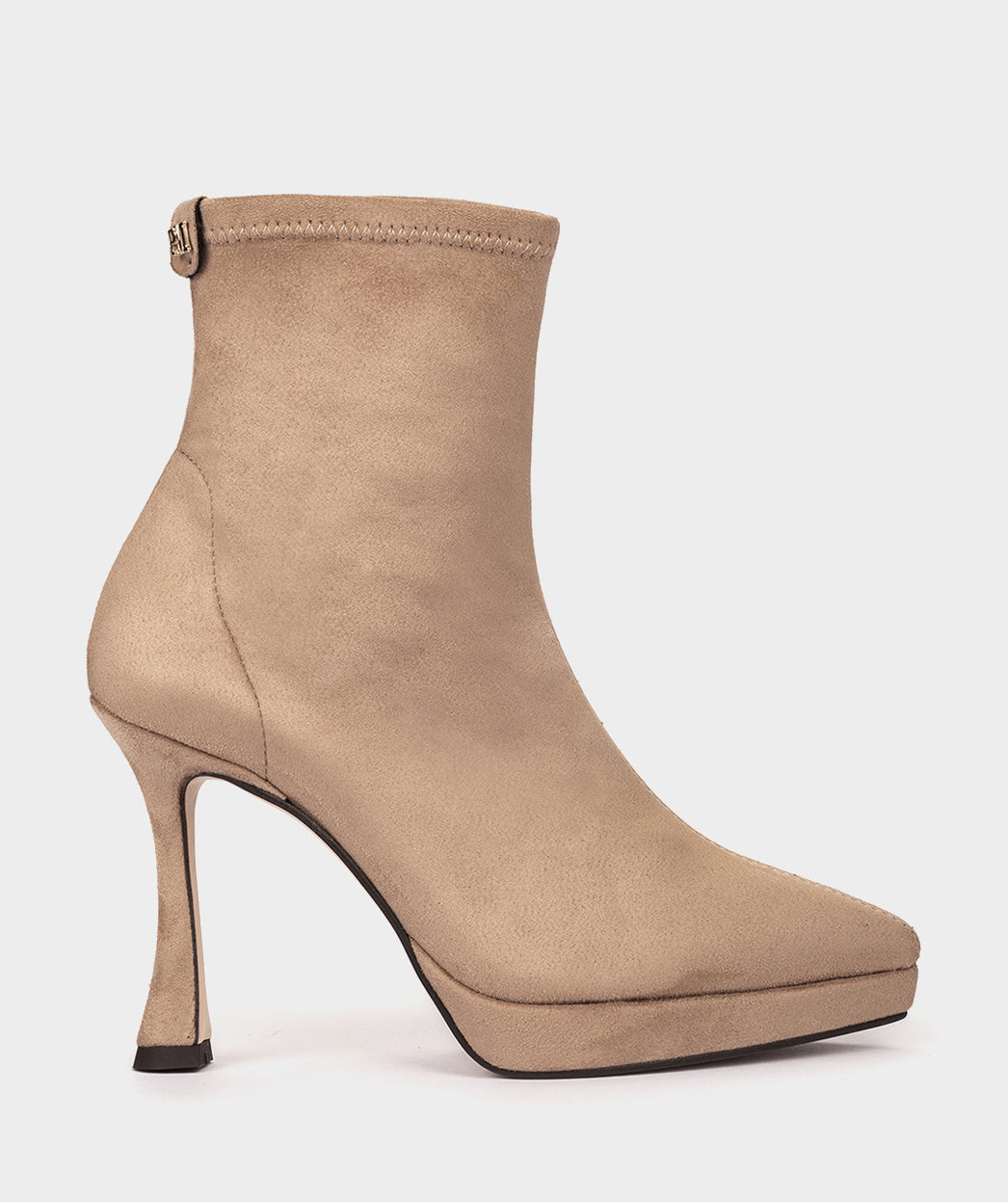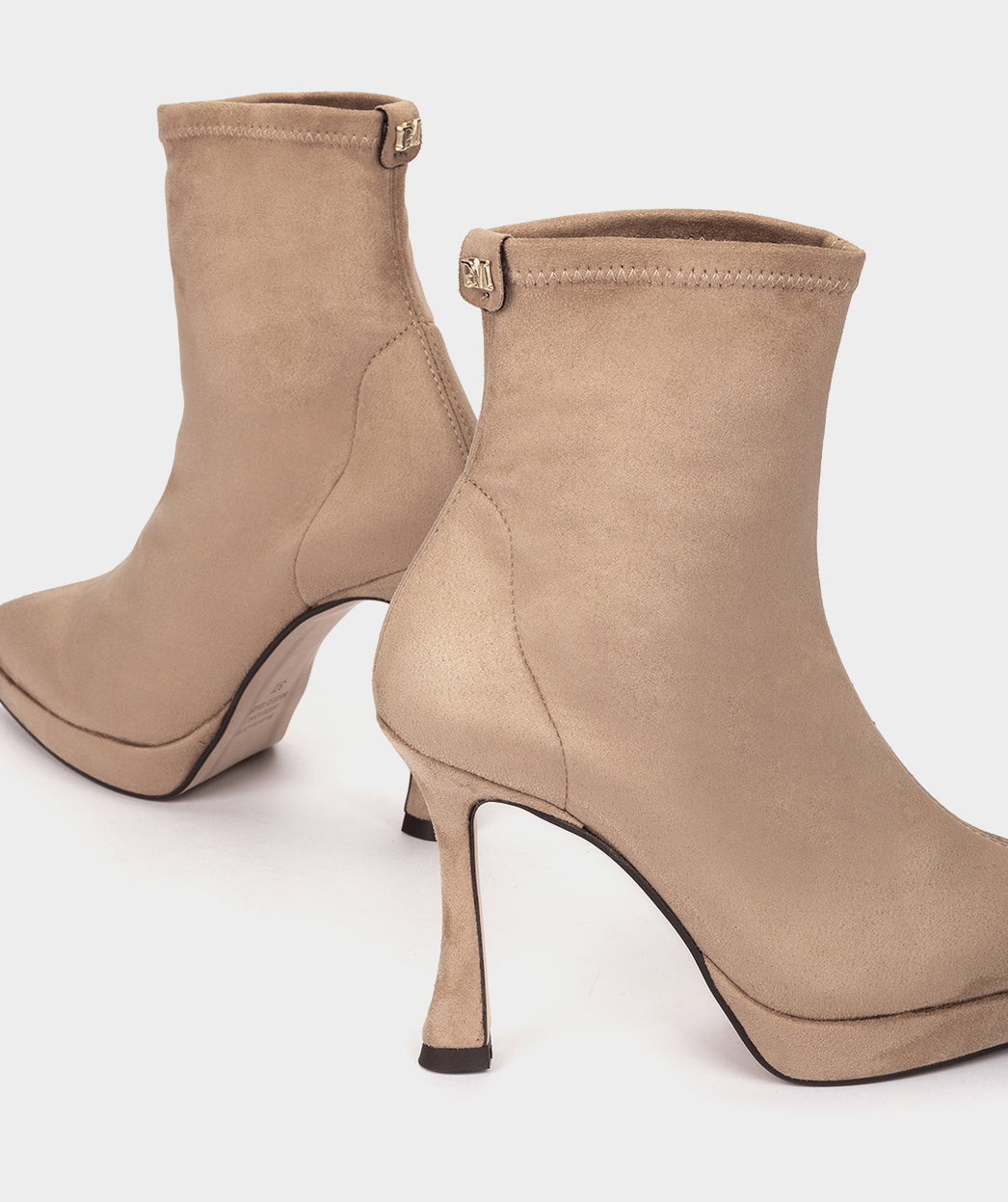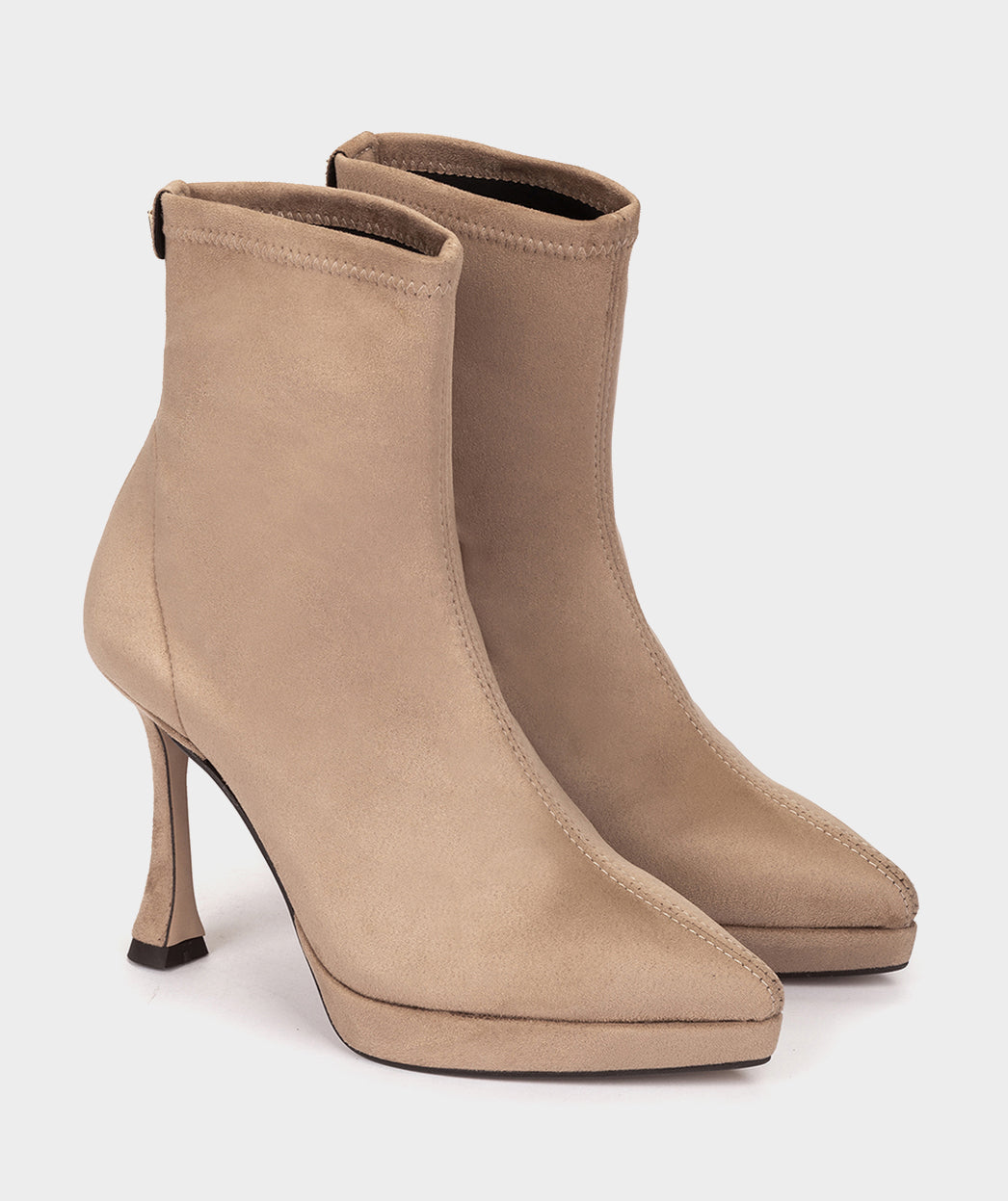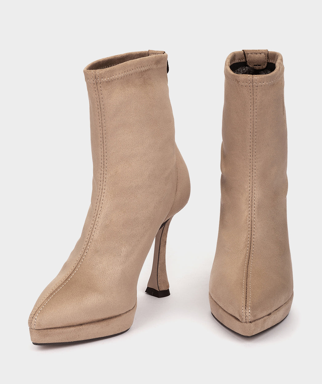 Botines de tacón confeccionados en tejido elástico efecto ante de color beige. Los botines SUNNE con tacón curvo y plataforma, presentan un diseño único y llamativo que proporciona altura sin sacrificar la comodida y estiliza la figura.