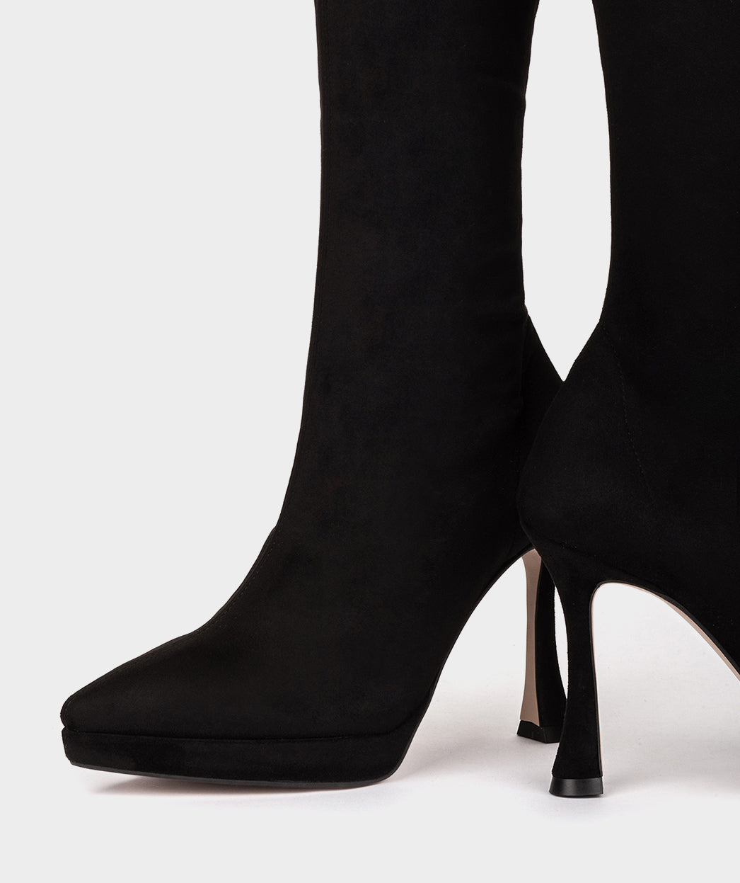 Botas altas de tacón confeccionadas en tejido elástico efecto ante de color negro. Las botas INGELS con tacón curvo y plataforma, presentan un diseño único y llamativo que proporciona altura sin sacrificar la comodida. Proporciona un ajuste perfecto que estiliza la figura.