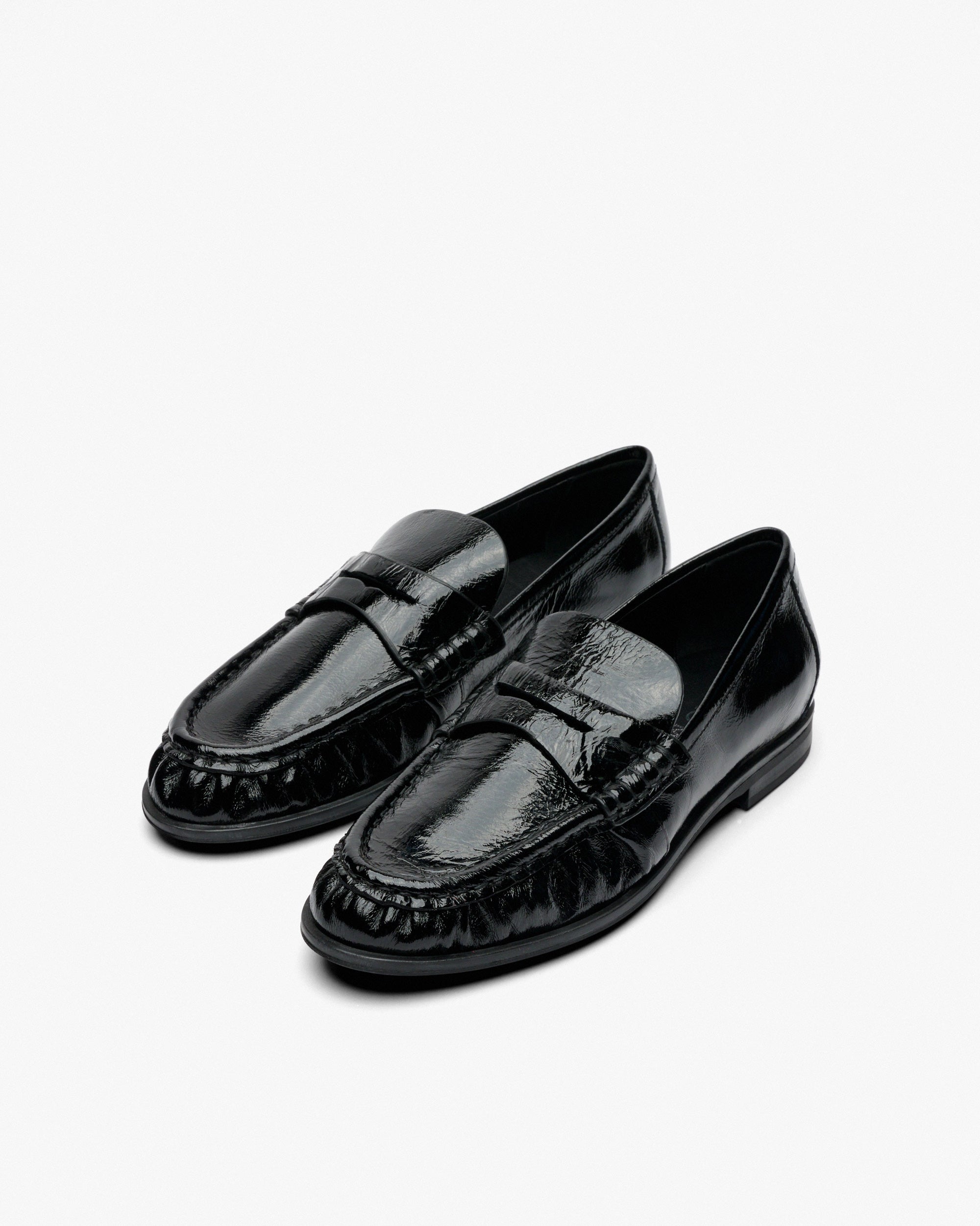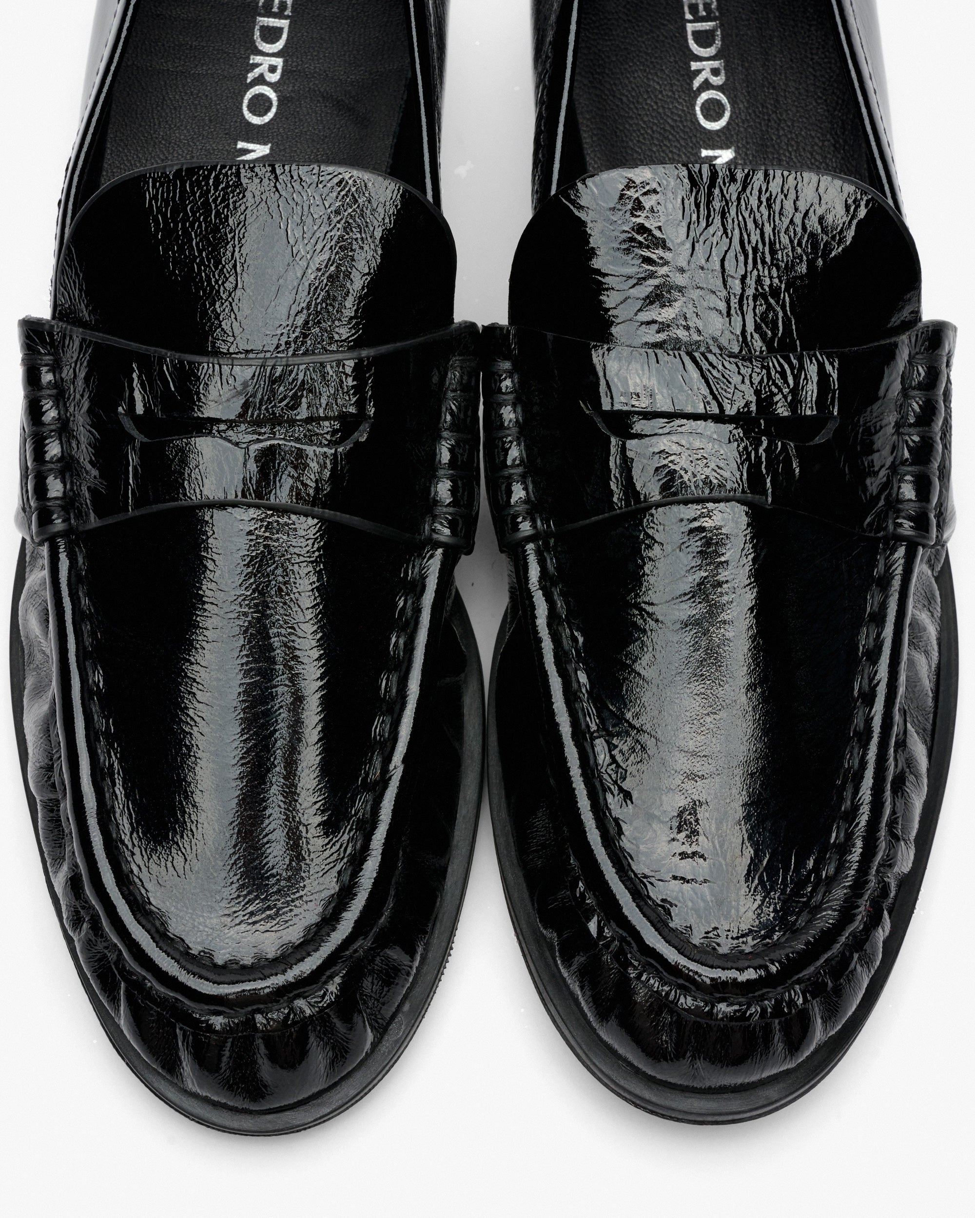 Mocasines de charol de color negro. Un modelo que combina sofisticación y comodidad. La combianción del fruncido de la pala y el antifaz sobre el empeine aportan originaldiad al modelo. Su suela flexible ofrece mayor comodidad en la pisada.