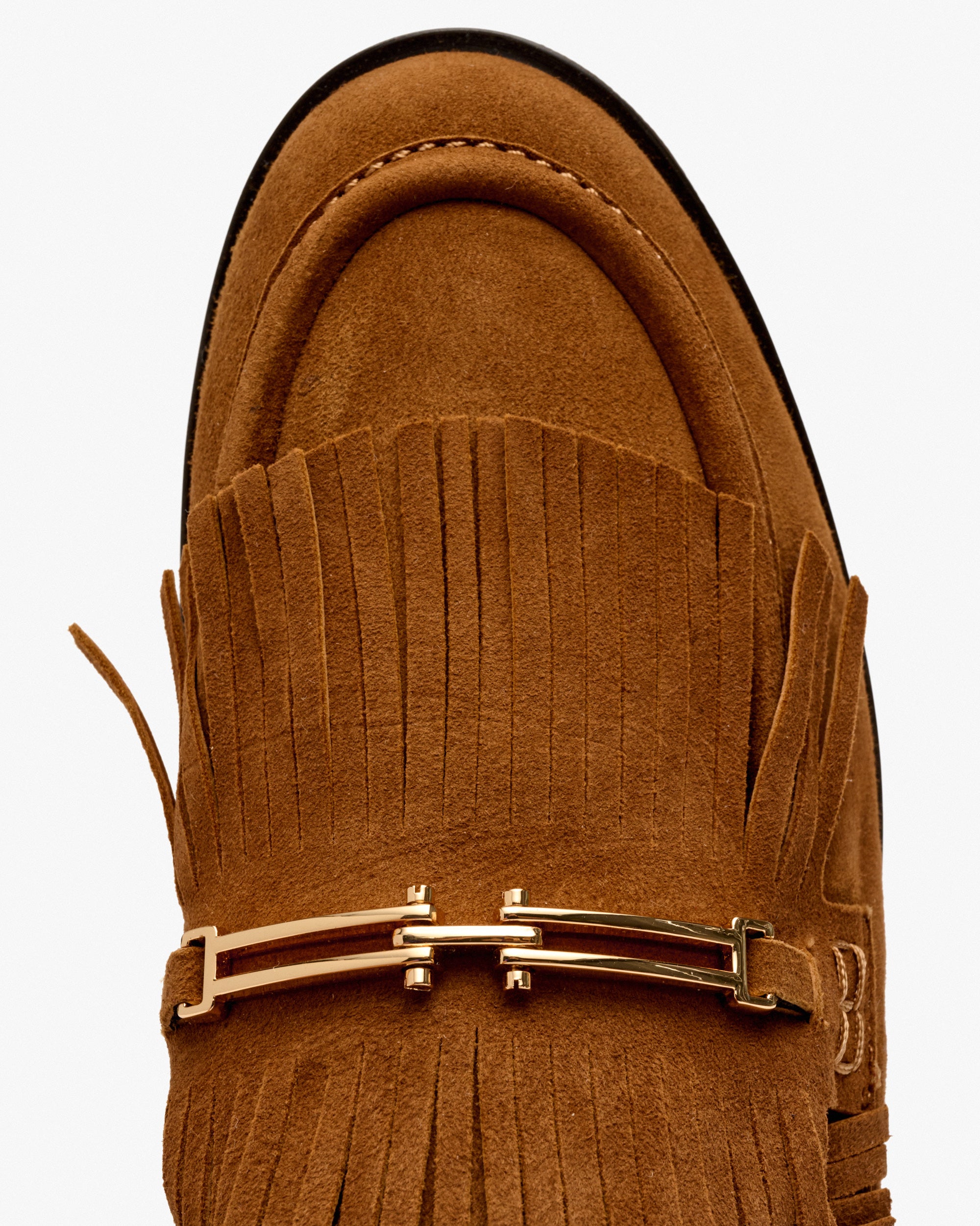 Mocasines de ante de color marrón. Estos mocasines se distinguen por su sobria elegancia y comodidad. Su tono cálido y su diseño refinado se realzan con detalles sutiles de estilo boho, que añaden un toque de carácter al zapato.