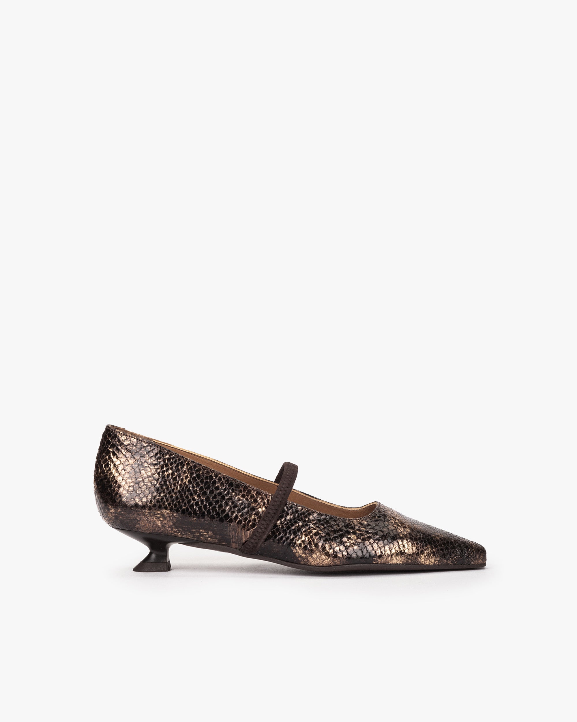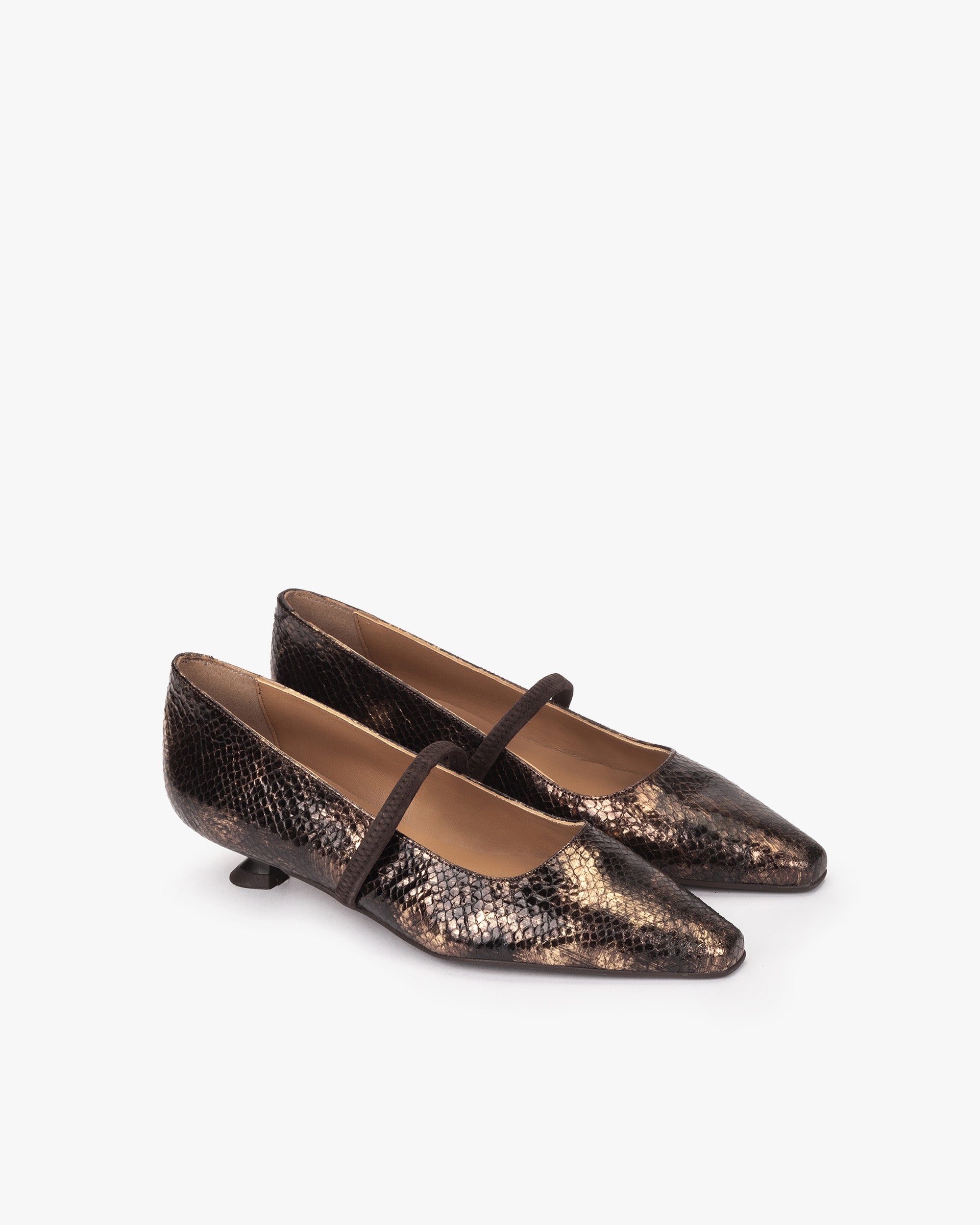 Zapatos de tacón de piel efecto serpiente metalizada. Un modelo que destaca por su versatilidad, apto tanto para eventos como para un día de oficina o una cita especial. El detalle de la cinta elástica sobre el empeine es la clave del éxito del modelo. La altura del tacón es perfecta para llevarlo cómodamente durante horas.