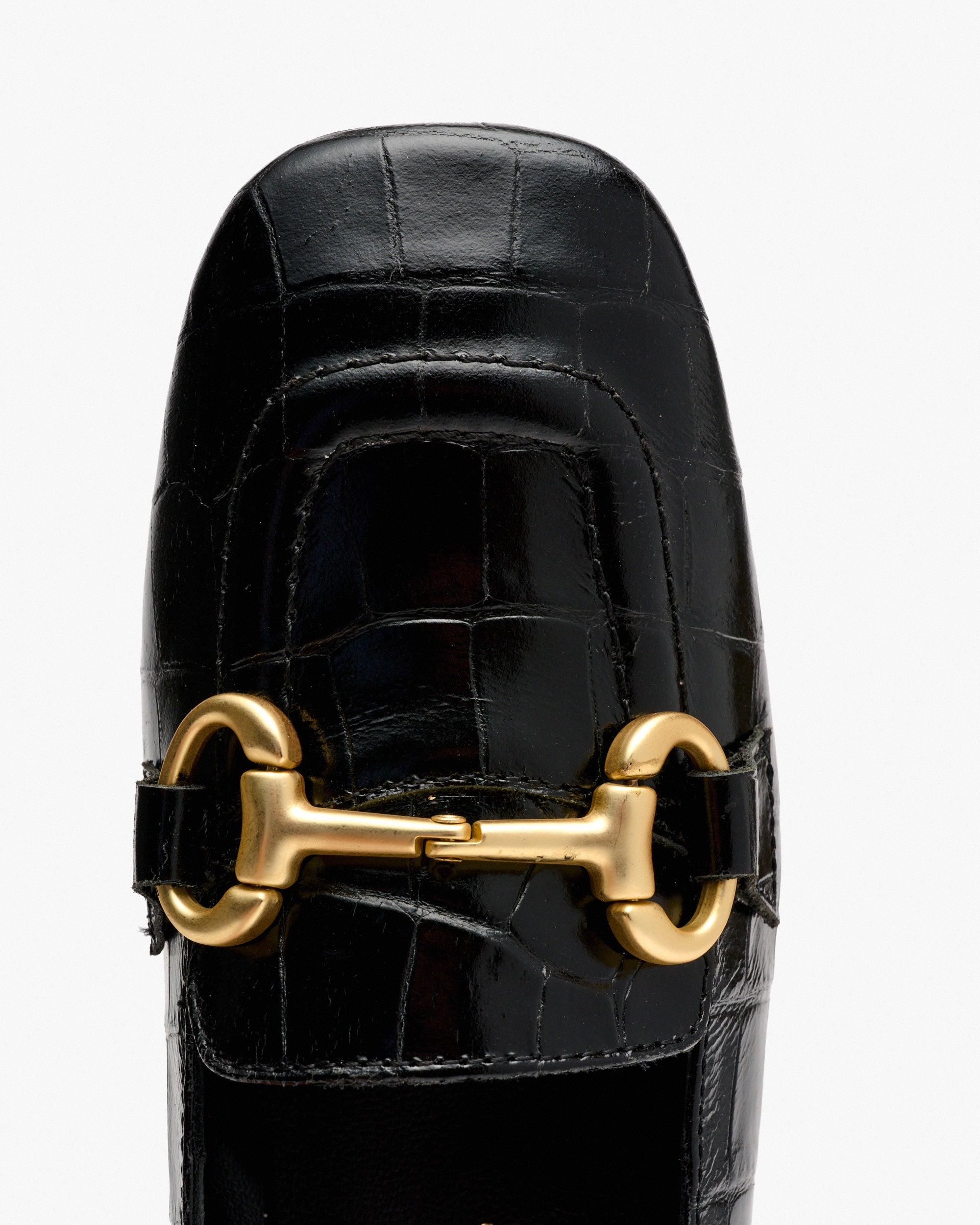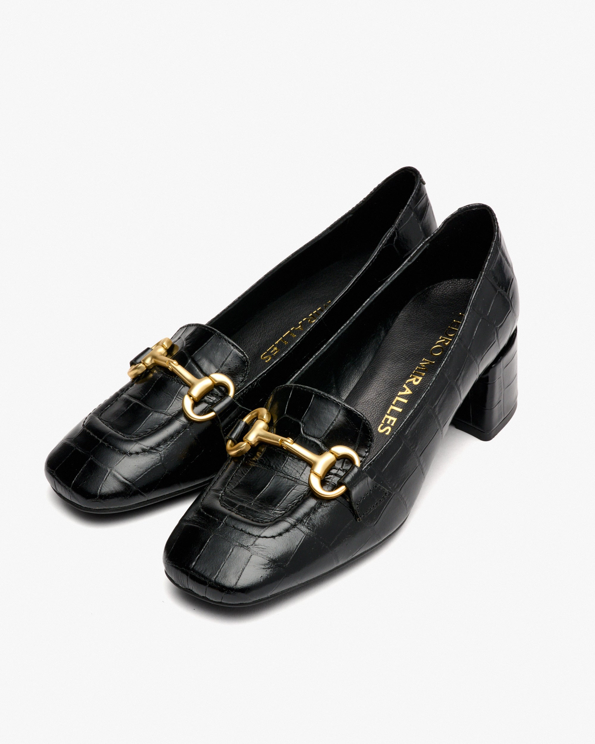 Zapatos de tacón de piel grabada de color negro. Añade un toque de originalidad a tu estilo con estos tacones de piel efecto cocodrilo. Su textura única hace de cada par una pieza distintiva. Un diseño que combina elegancia y comodidad. Una elección perfecta para añadir un toque original y refinado a todos tus outfits de la temporada.
