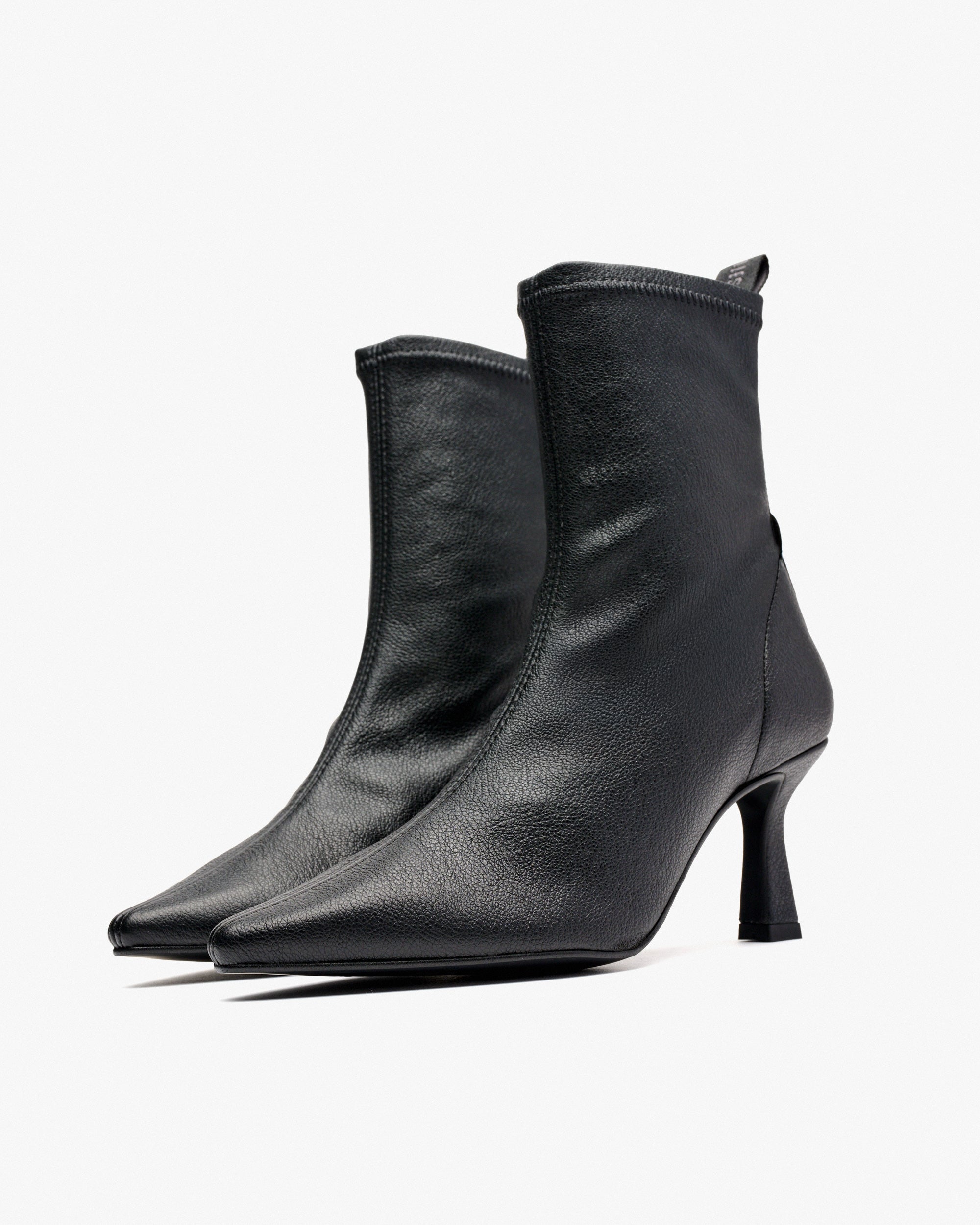 Botines de tejido elástico efecto piel de color negro. El icónico tejido elástico de Pedro Miralles se convierte en el protagonista de un nuevo modelo que combina estilo casual y modernidad. Un modelo que estiliza la silueta y resulta muy favorecedor para lucir con faldas o pantalones wide leg.
