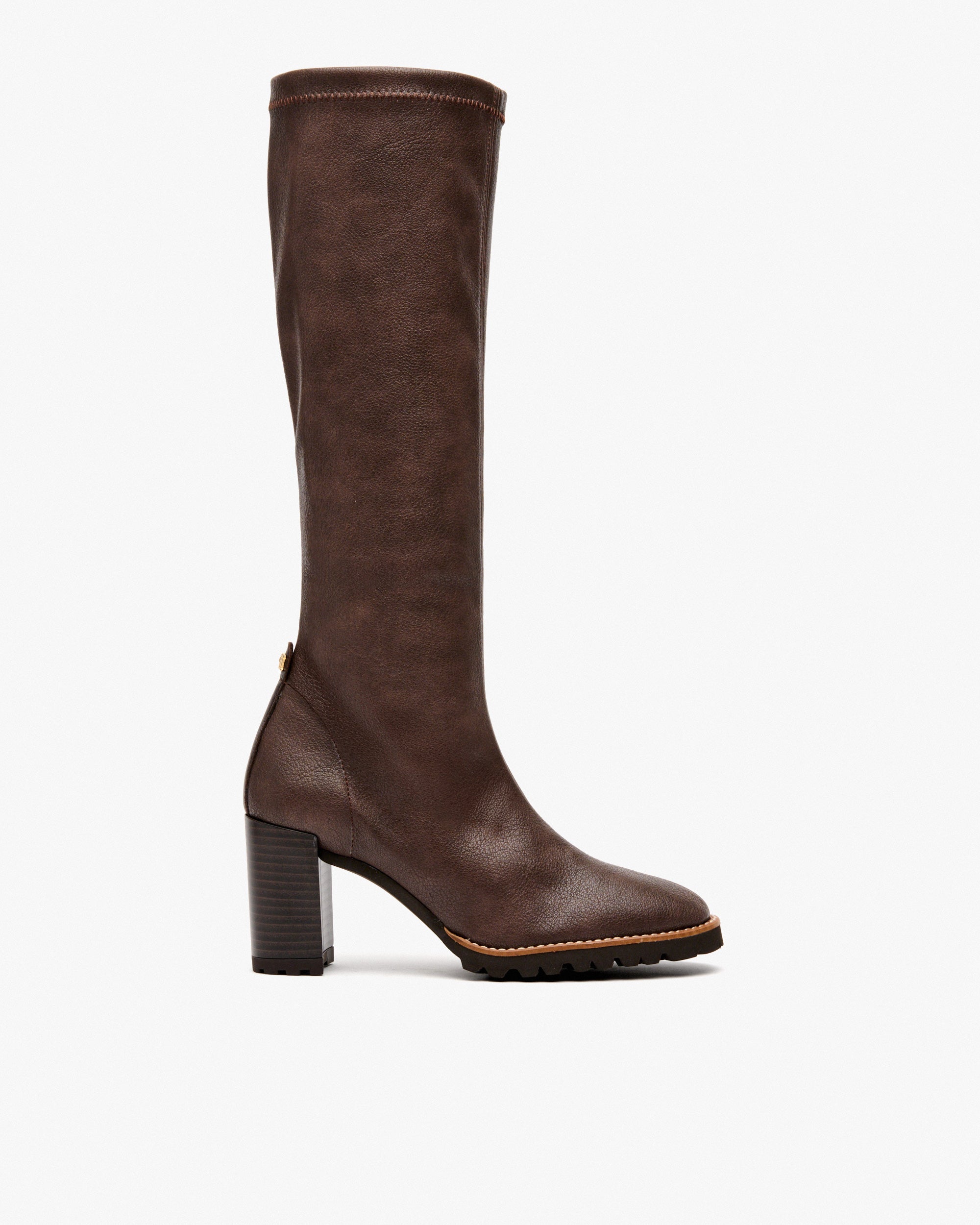 Botas de tejido elástico efecto piel de color marrón. El modelo ALPENA destaca por su material suave, que abraza perfectamente la pierna y ofrece un ajuste óptimo, mientras que su tacón agrega un toque de elegancia y altura. Una silueta moderna y femenina, ideal para realzar tus looks.