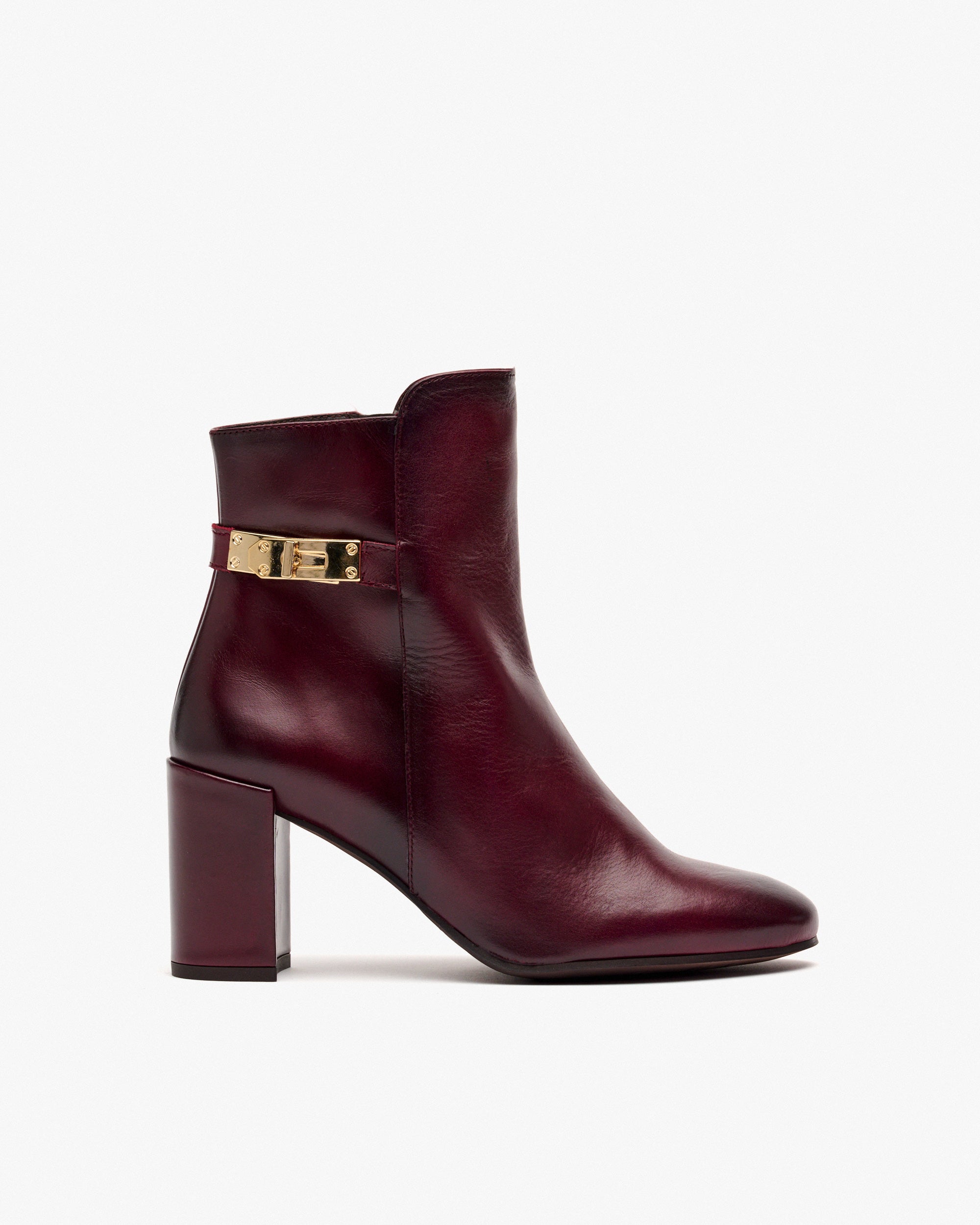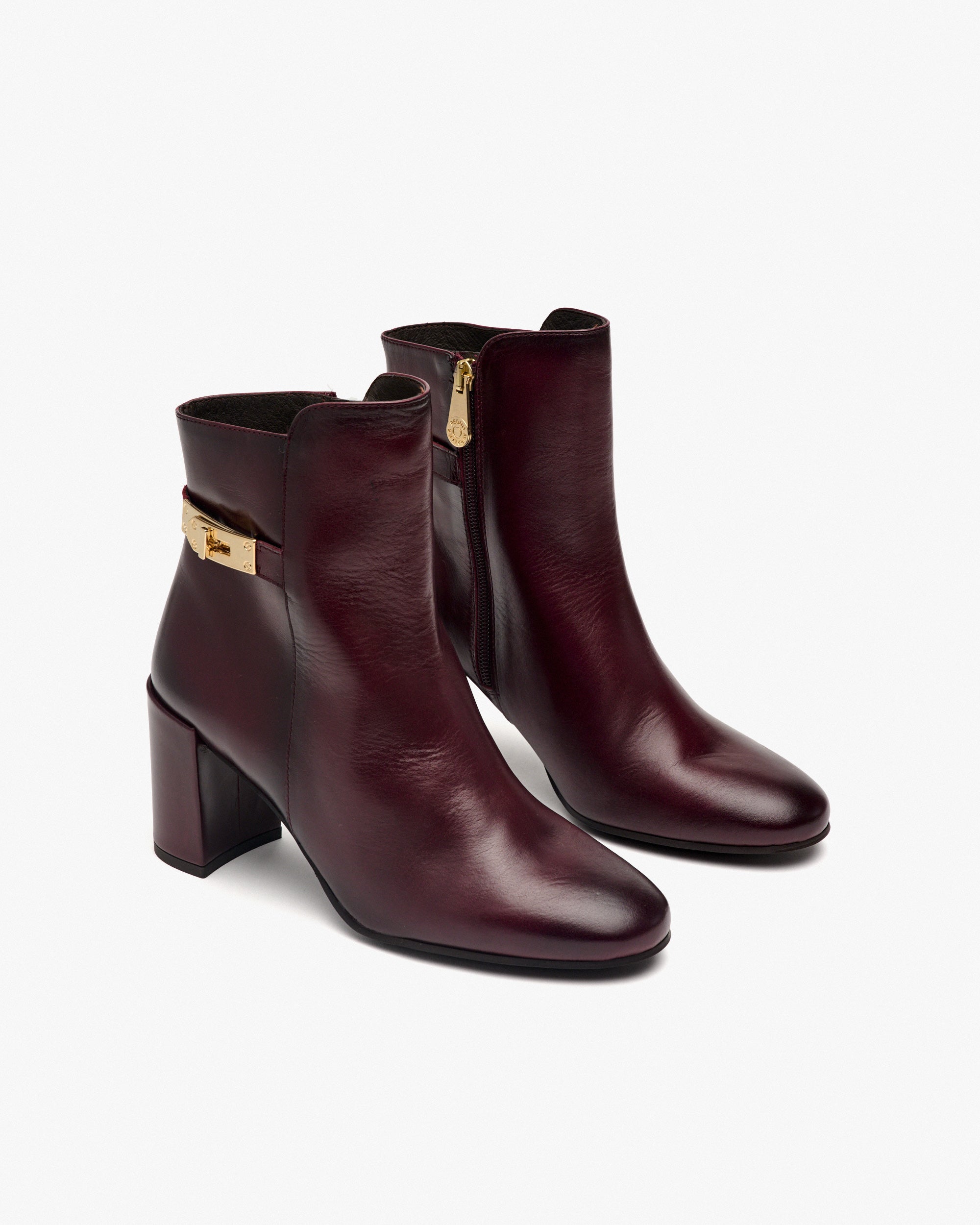 Botines de piel de color burdeos con adorno. Este diseño elegante y moderno agrega un toque sofisticado a tus estilismos. El detalle de la hebilla colocada en el lateral del botín marca la diferencia, al igual que la caña asimétrica, que favorece la silueta. Perfectas para cualquier ocasión.