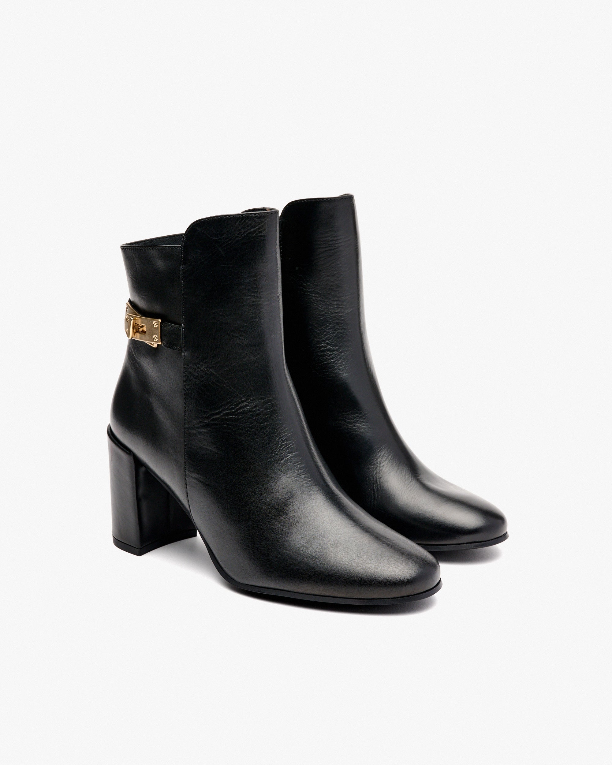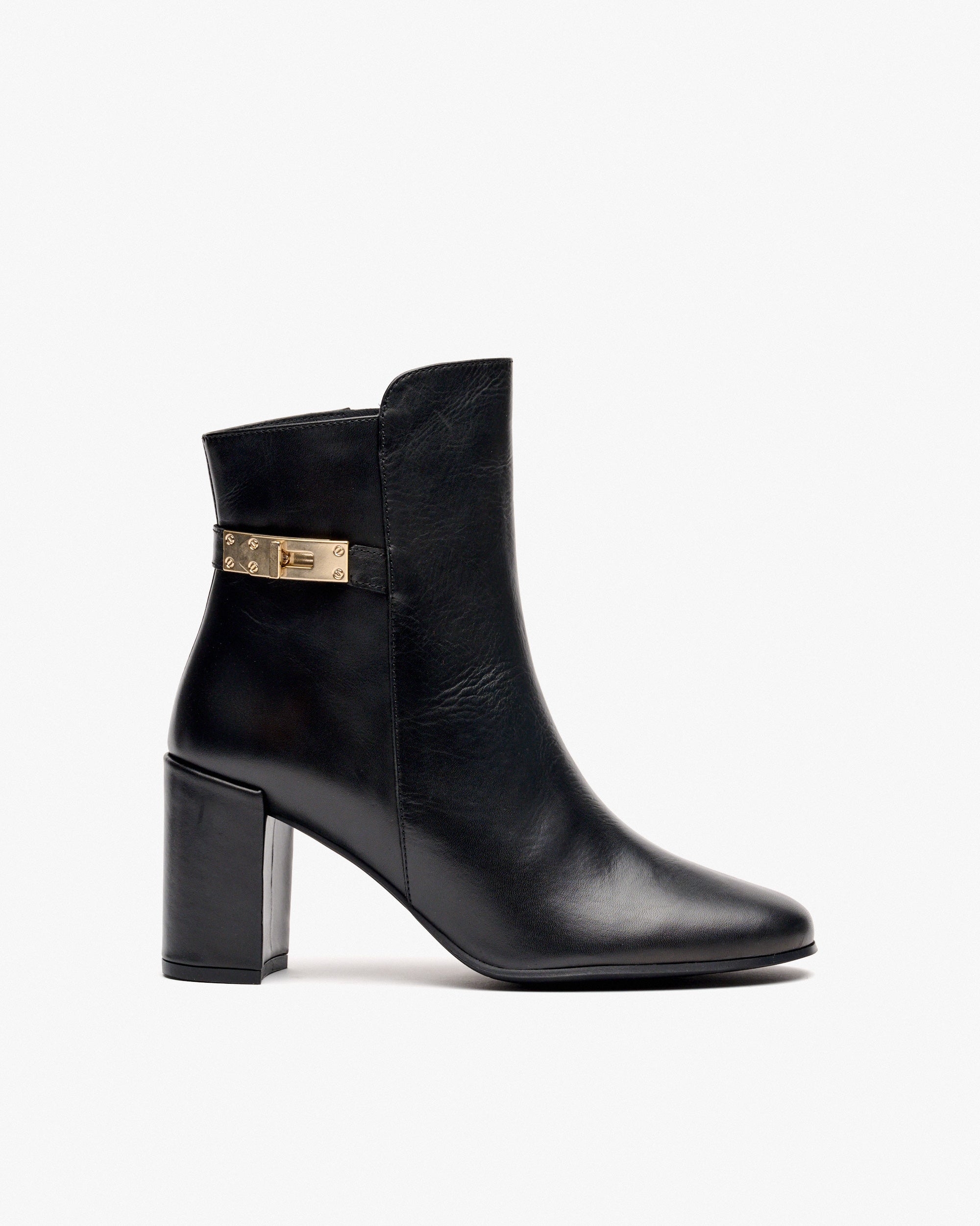 Botines de piel de color negro con adorno. Este diseño elegante y moderno agrega un toque sofisticado a tus estilismos. El detalle de la hebilla colocada en el lateral del botín marca la diferencia, al igual que la caña asimétrica, que favorece la silueta. Perfectas para cualquier ocasión.