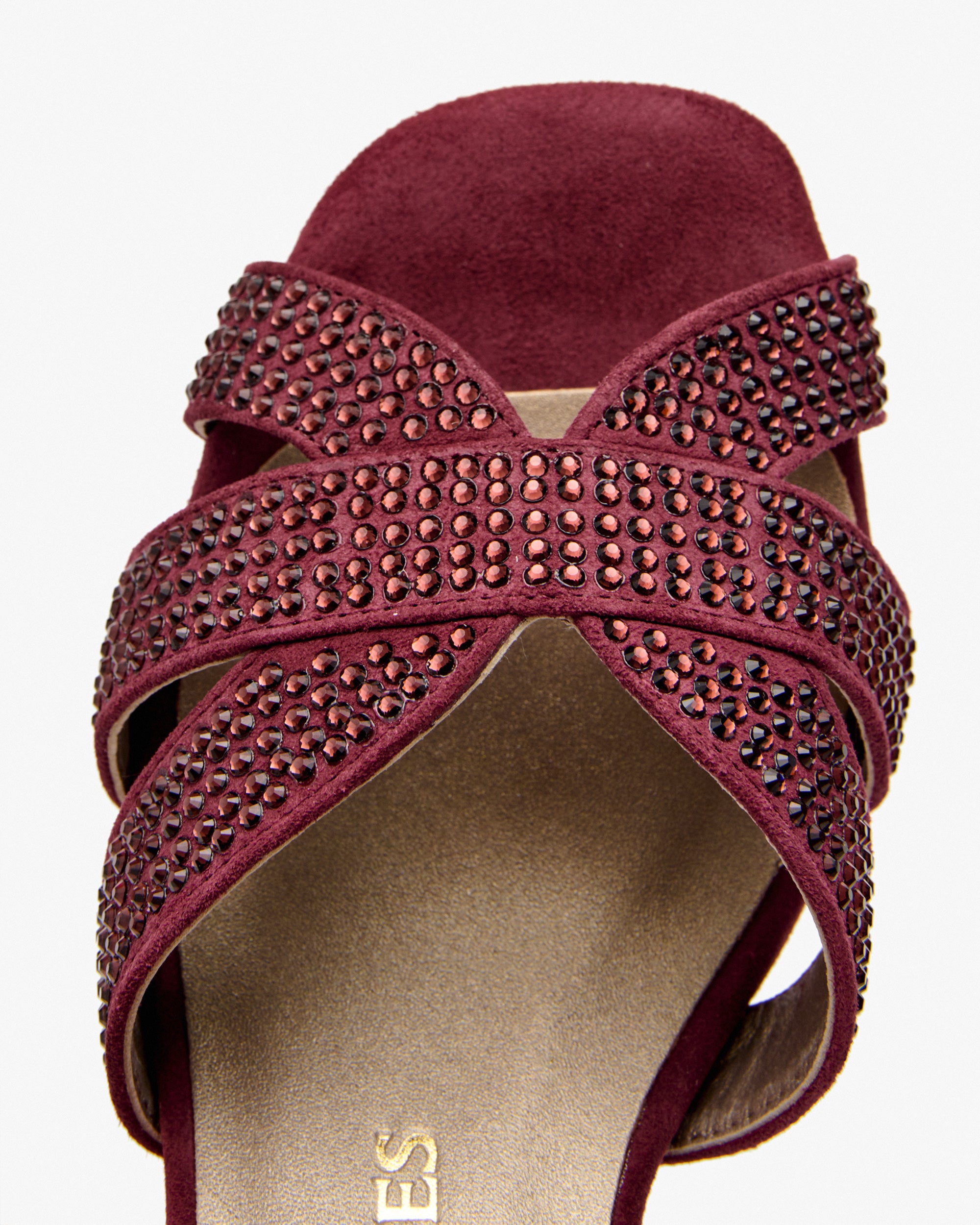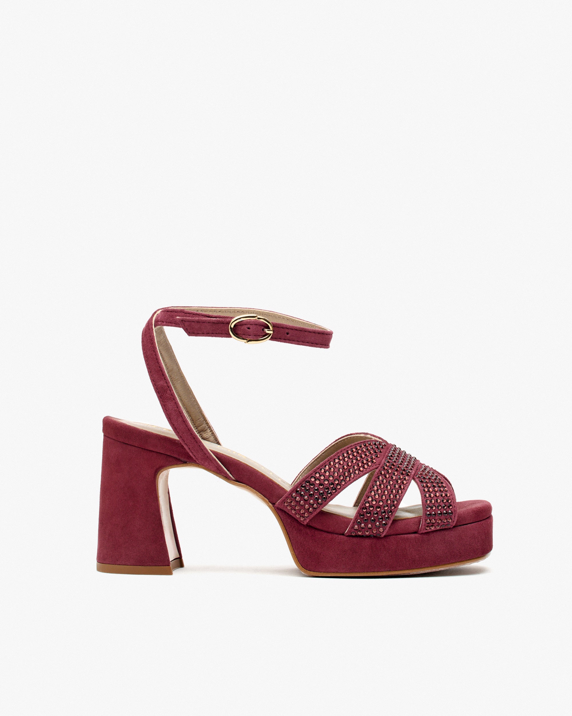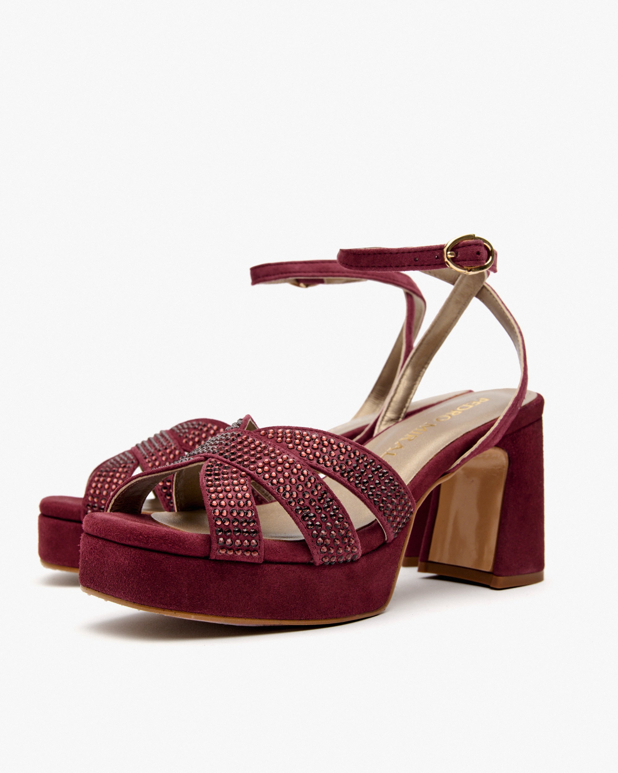 Sandalias de tacón de ante de color burdeos con brillos. Las sandalias Abrantes combinan elegancia y comodidad en un diseño sofisticado, ideal para los eventos más especiales.Estilizan la figura sin sacrificar confort, mientras que su horma ancha garantiza un ajuste espacioso y agradable incluso después de horas de uso. La plantilla ligeramente acolchada aporta una pisada suave.