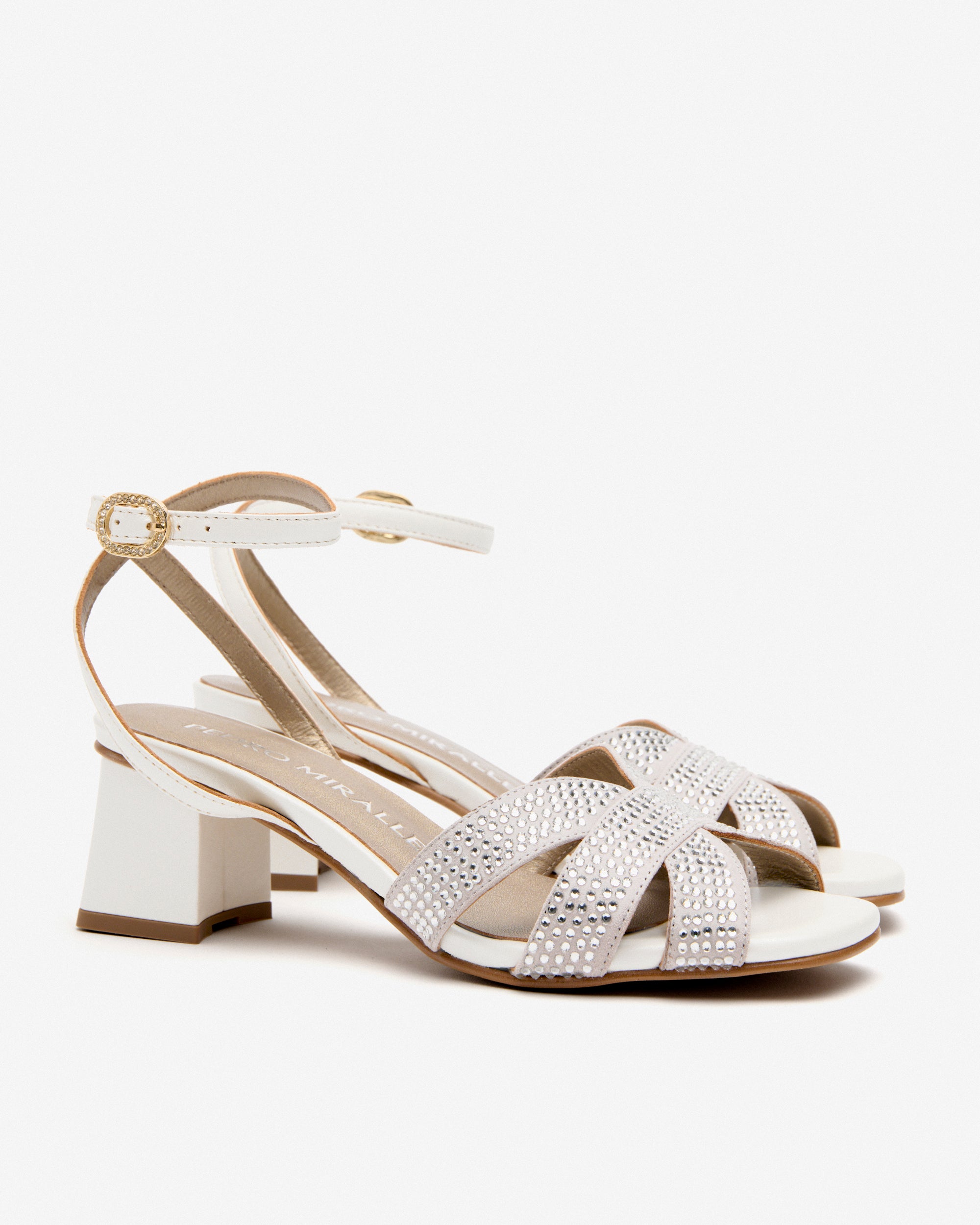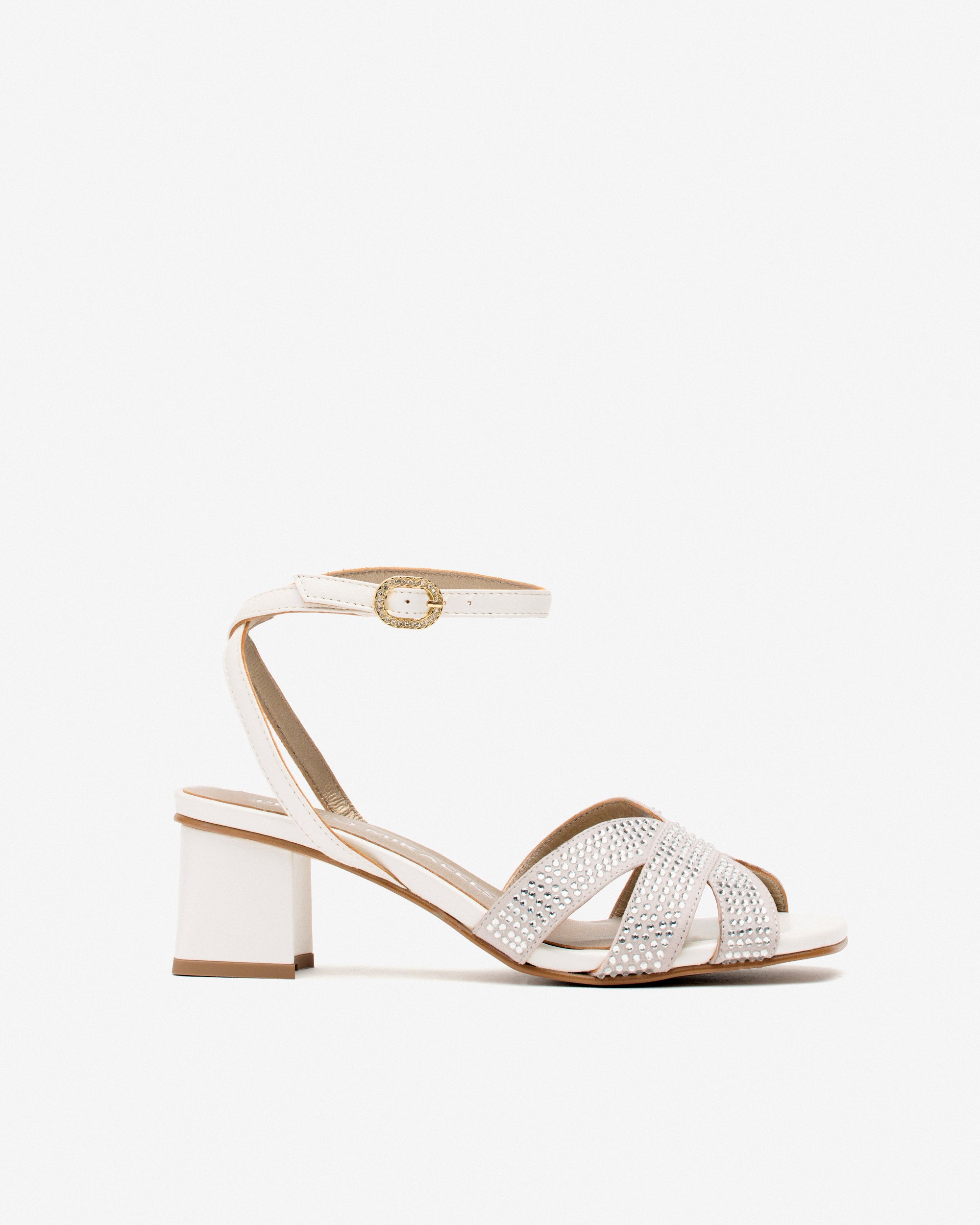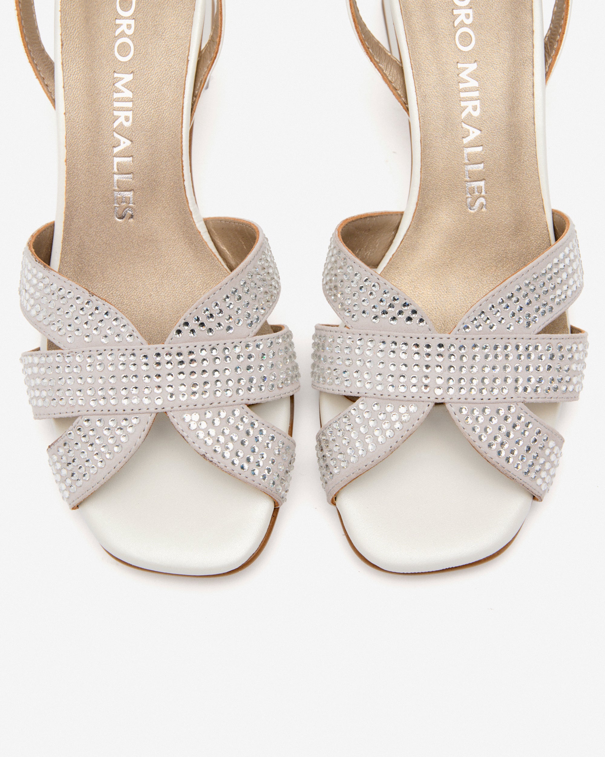 Sandalias de tacón de piel de color blanco con brillos. Un elegante diseño con tiras decoradas con brillos que componen la pala. Su pulsera al tobillo ofrece un buen ajuste al pie. La altura del tacón es perfecta para lucir cómodamente durante horas.