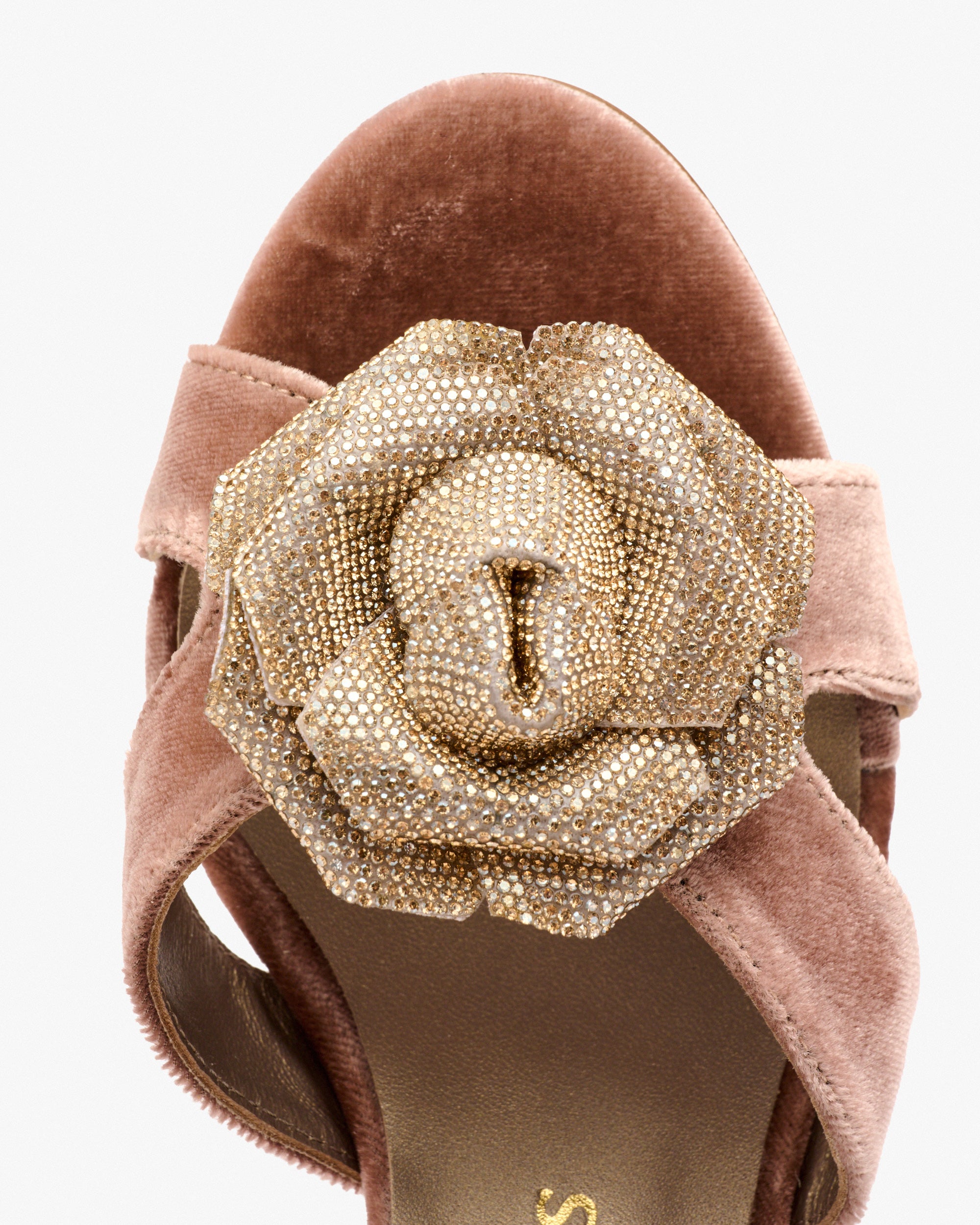 Sandalias de tacón de terciopelo de color rosa con flor. Su diseño refinado aporta un toque de romanticismo y glamour a tus outfits, gracias a al flor de brillos que se lleva toda la atención. Perfecto para ceremonias, fiestas u ocasiones especiales.