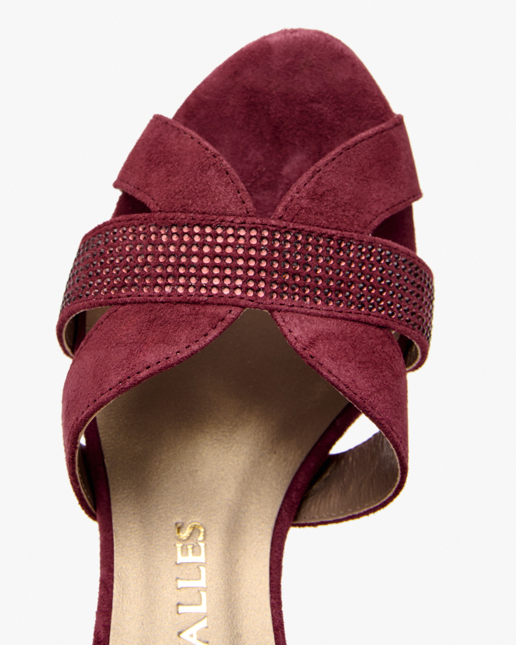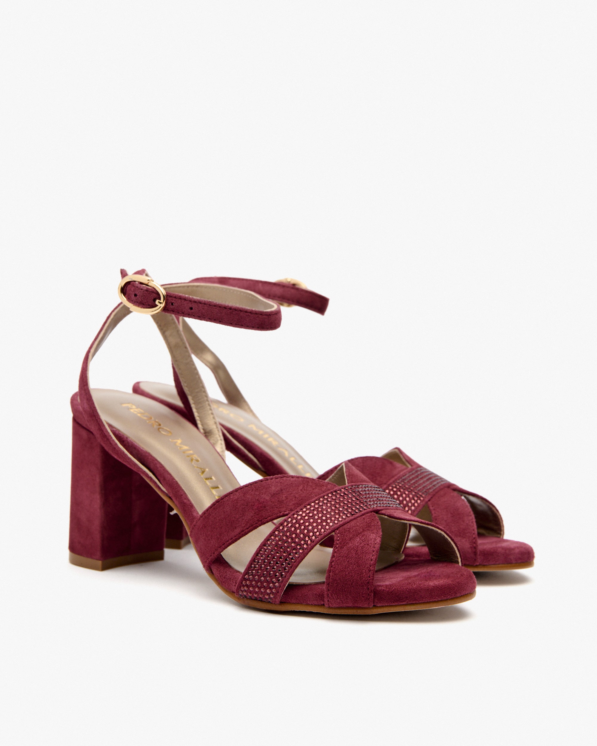 Sandalias de tacón de ante de color burdeos con brillos. Su elegante diseño realza la silueta al tiempo que garantiza una buena sujeción, gracias a la pala. La combinación del ante con el detalle de los brillanes eleva la sofisticación del modelo. Cuenta con pulsera cruzada al tobillo para favorecer el ajuste y el movimiento del pie.