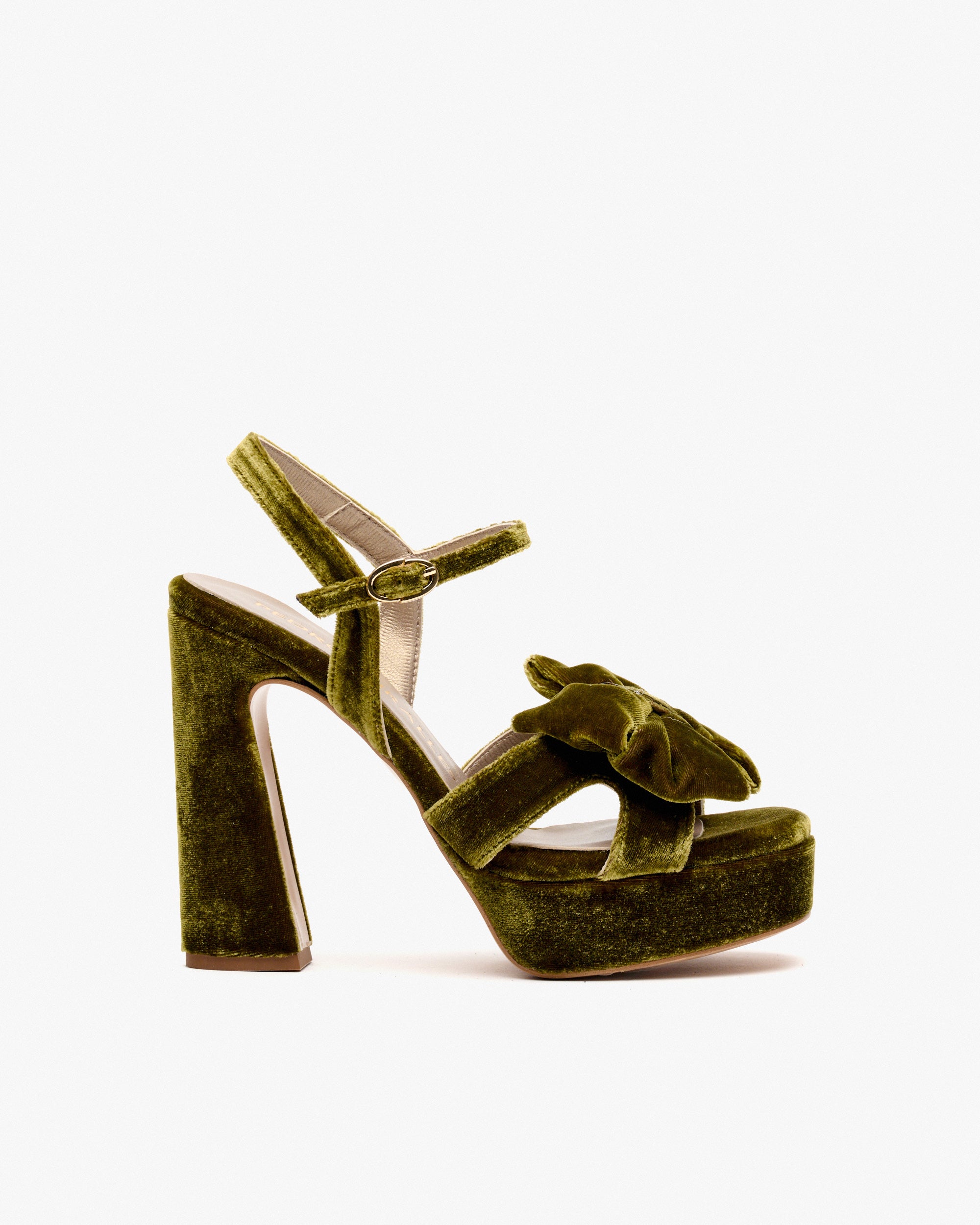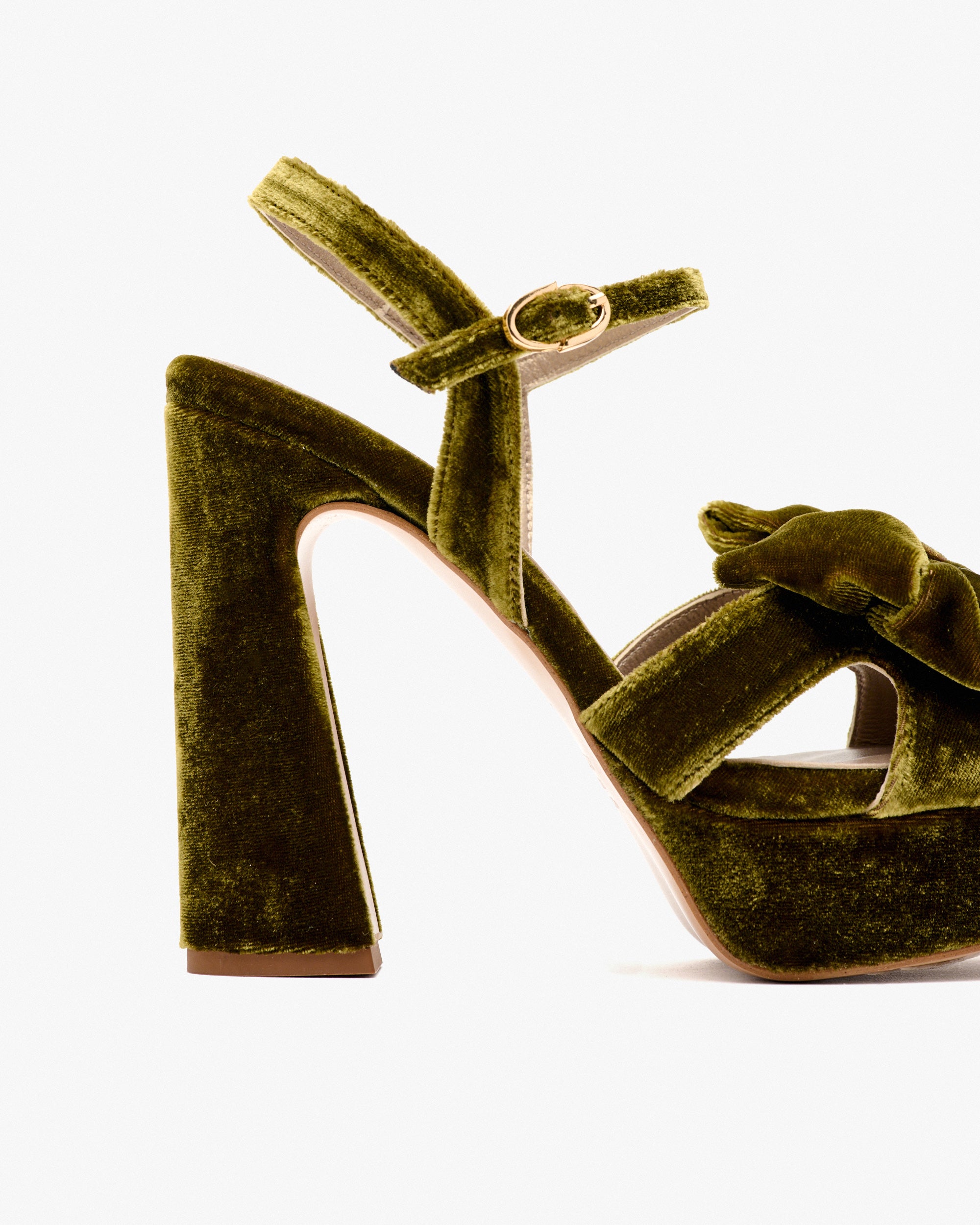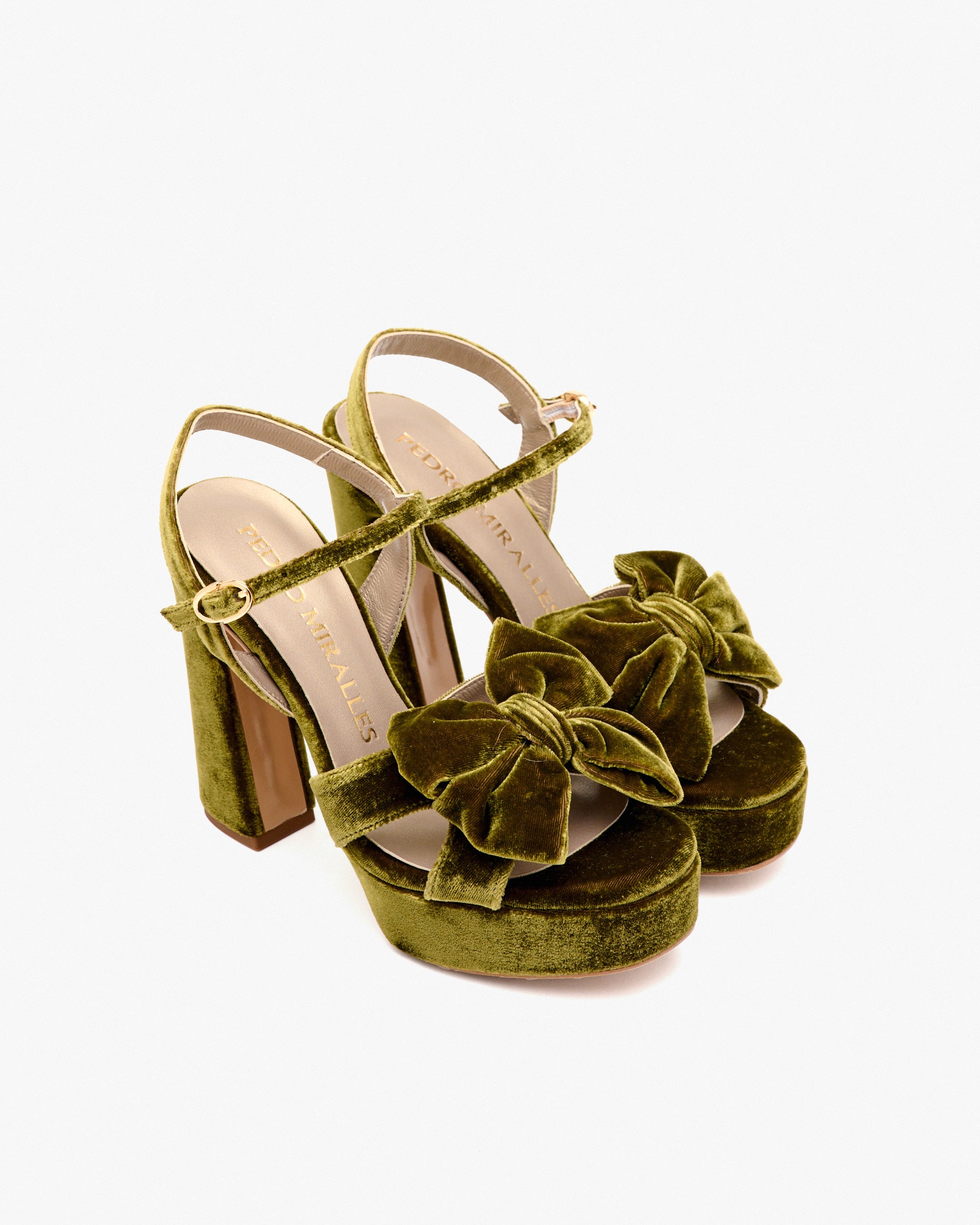 Sandalias de tacón de terciopelo de colo verde. Este sofisticado modelo realza la silueta del pie, combinando elegancia y modernidad. Un diseño que destaca por el lazo que adorna el empeine y capta toda la atención. Ideal para realzar tus outfits en los eventos más especiales de la temporada. La silueta del modelo ofrece un ajuste óptimo y una sujeción perfecta..