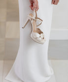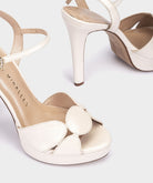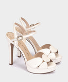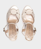Sandalias de tacón con plataforma de piel nacarada. Realza la silueta del pie por la confección de la pala con figuras geométricas. Cierre con pulsera al tobillo y hebilla de brillantes.