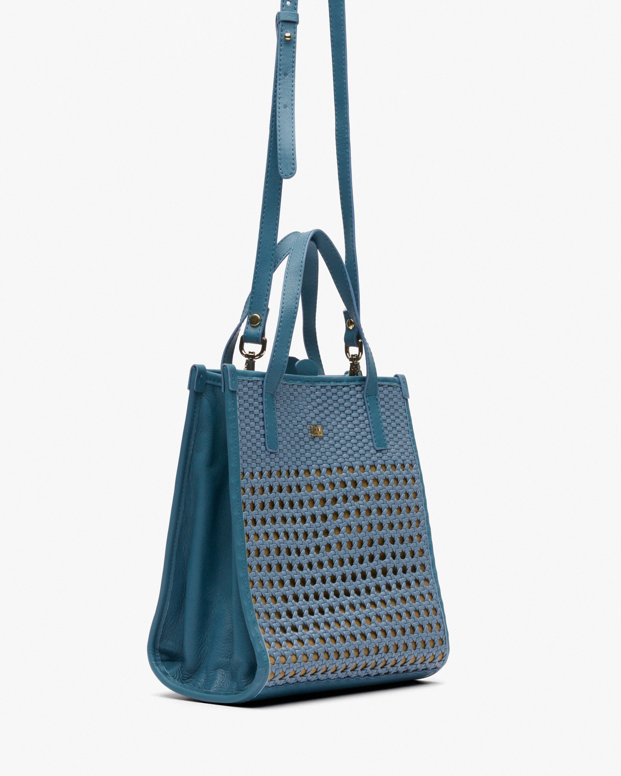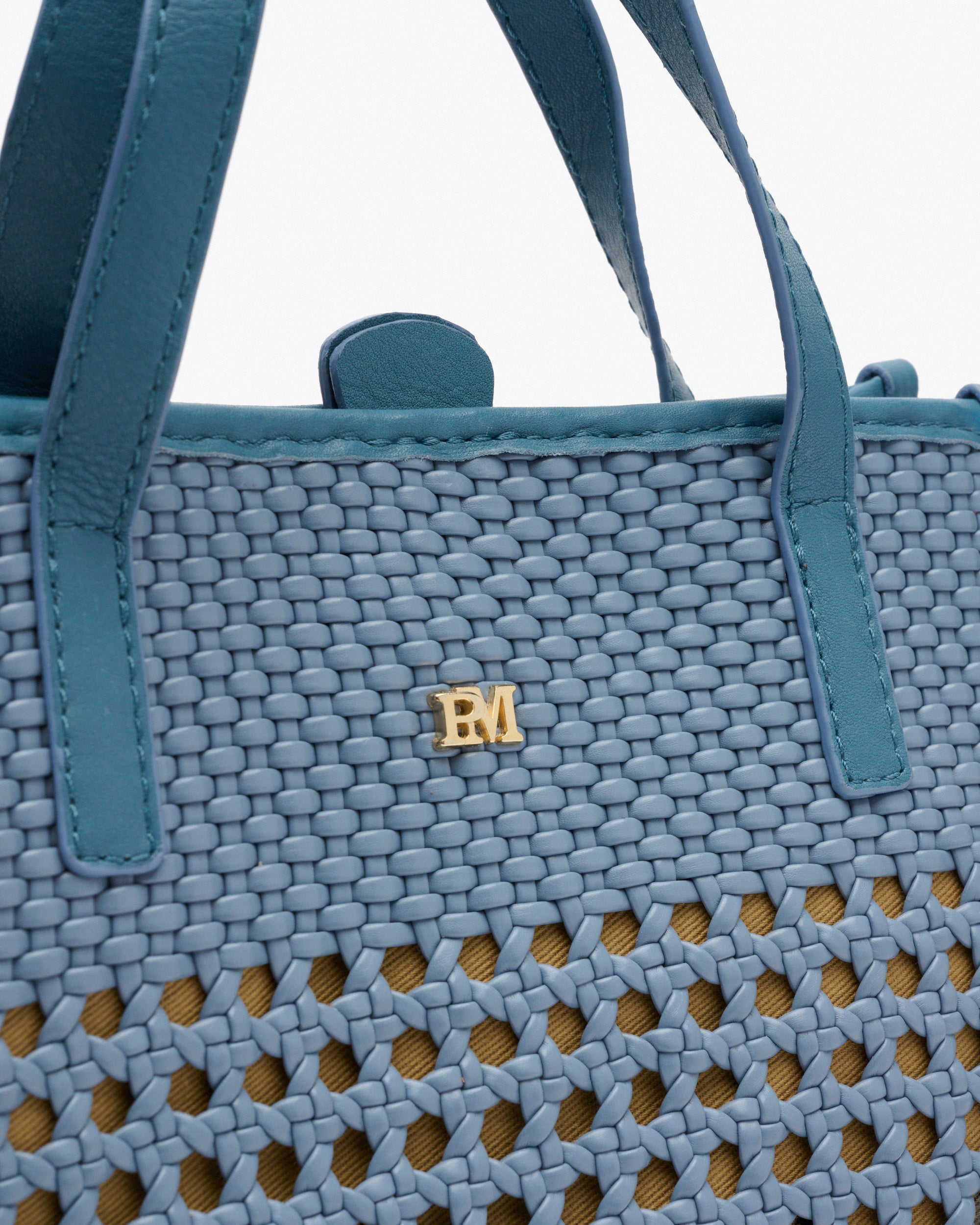 Bolso de hombro de piel trenzada de color azul. Un modelo perfecto para guardar todo lo que necesites en tu día a día. El bolso VISALIA destaca por su versatilidad. Cuenta con un asa de 9 cm. Puedes utilizar su asa larga para llevarlo como bandolera. Cuenta con cierre con imán y con un pequeño compartimento interior.