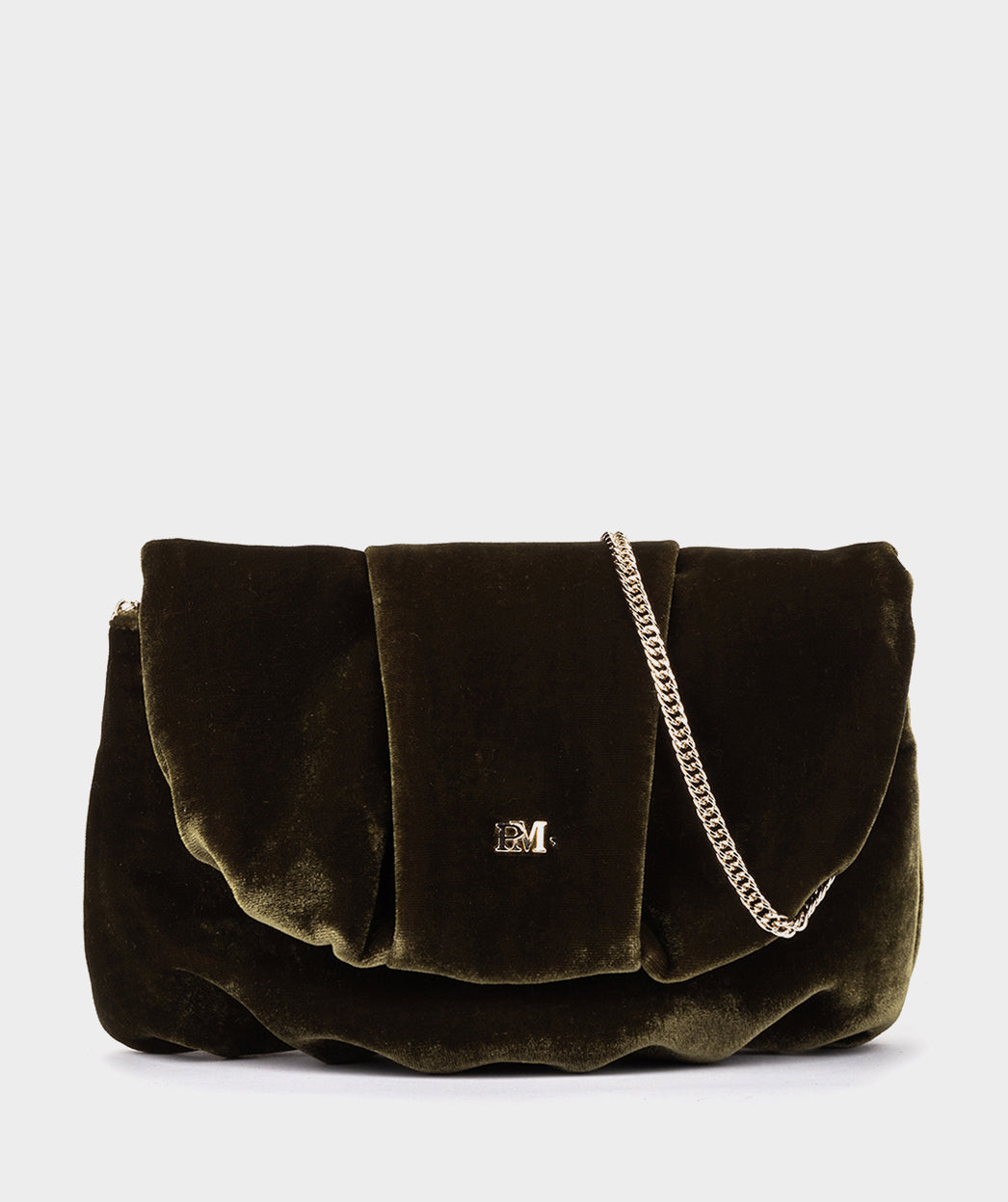 Bolso de mano de terciopelo de color verde. Este modelo destaca por su silueta fruncida, creando un efecto acolchado. El terciopelo eleva la sofisticación del modelo y lo convierte en perfecto para los eventos de la temporada. Cuenta con una cadena dorada para llevarlo cruzado o colgado. Tiene cierre de imán.