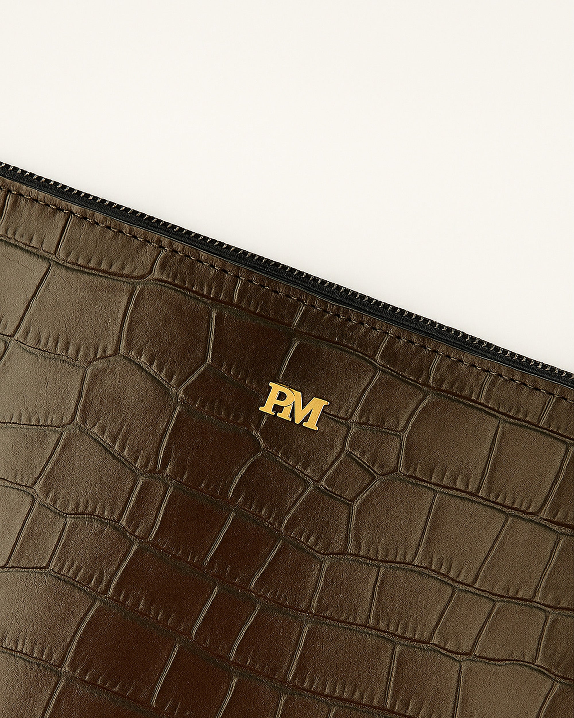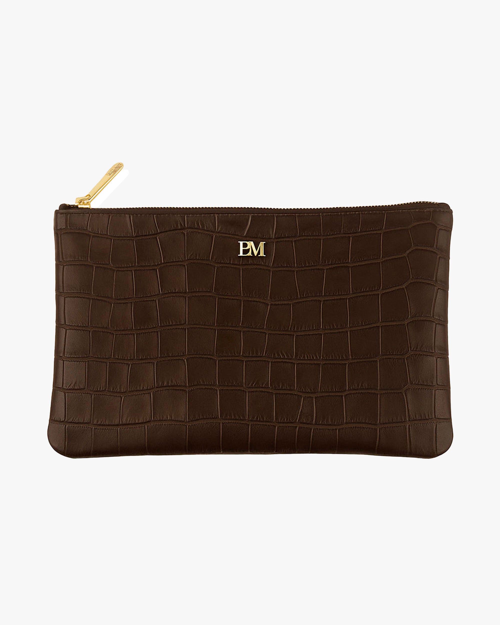 Bolso de mano de piel grabada de color marrón. Nuestro bolso COVADONGA se convertirá en tu mejor complemento esta temporada. Su diseño compacto y práctico lo convierten en una pieza especial con la que querrás combinar todos tus looks. Cierre con cremallera. No tiene asa.