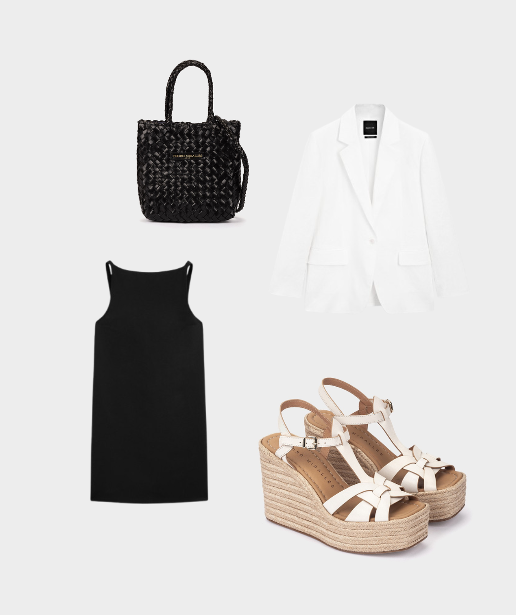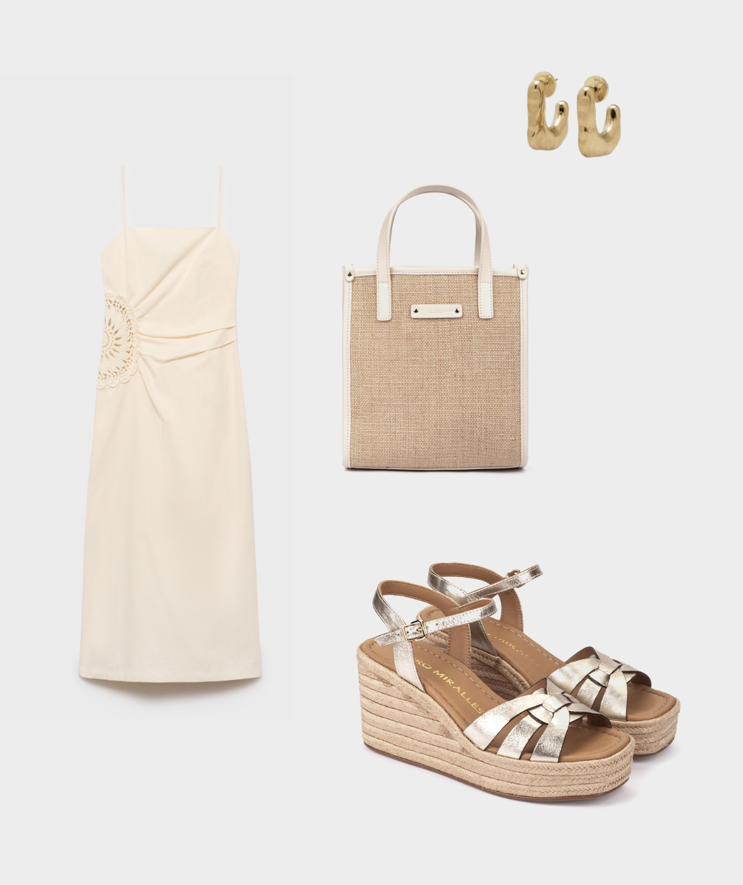 Las cuñas de esparto y los vestidos de lino forman un tándem perfecto. Un vestido midi con tirantes finos, en tonos neutros como beige o blanco, potenciará ese toque mediterráneo que nos transporta al verano. Acompaña este look con un bolso de rafia y unos pendientes dorados discretos.