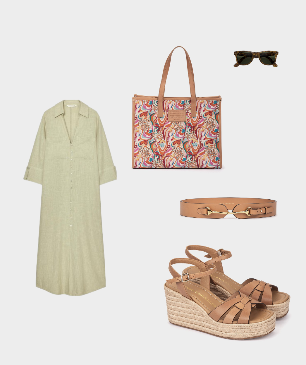 El vestido camisero es una opción comodín que puedes adaptar a distintas ocasiones. Con unas cuñas de esparto, lograrás un look sofisticado casi sin esfuerzo. Si quieres marcar la cintura, añade un cinturón fino de cuero.