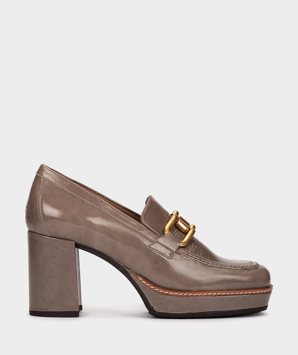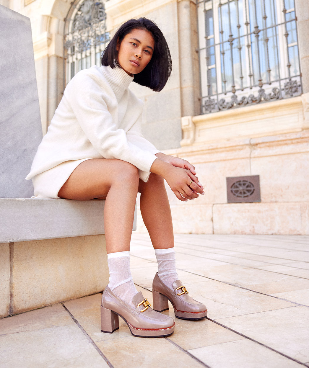 Un conjunto de punto en tonos neutros combinará a la perfección con los mocasines de tacón MANHEIM. Esta combinación permitirá que la atención recaiga en los zapatos. Aporta un toque trendy al look añadiendo calcetines o medias tobilleras de color blanco.