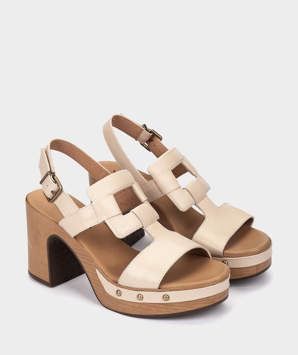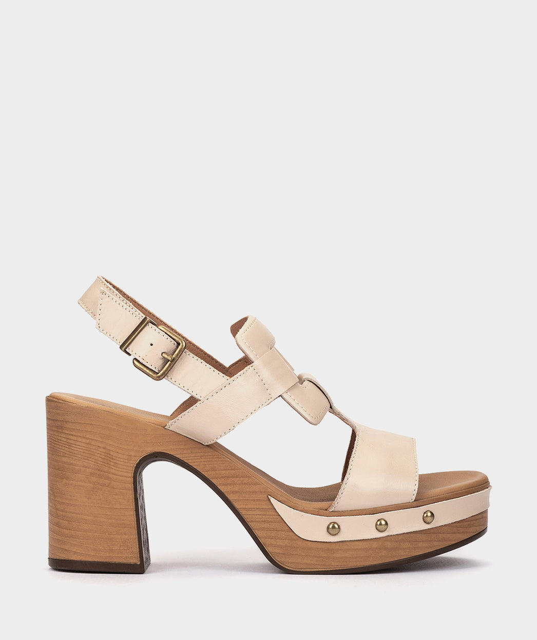 Sandálias de couro cor de areia com salto com efeito madeira. O detalhe do cabedal geométrico aliado às tachas na plataforma conferem originalidade e distinção ao modelo. Modelo da coleção Weekend by Pedro Miralles.