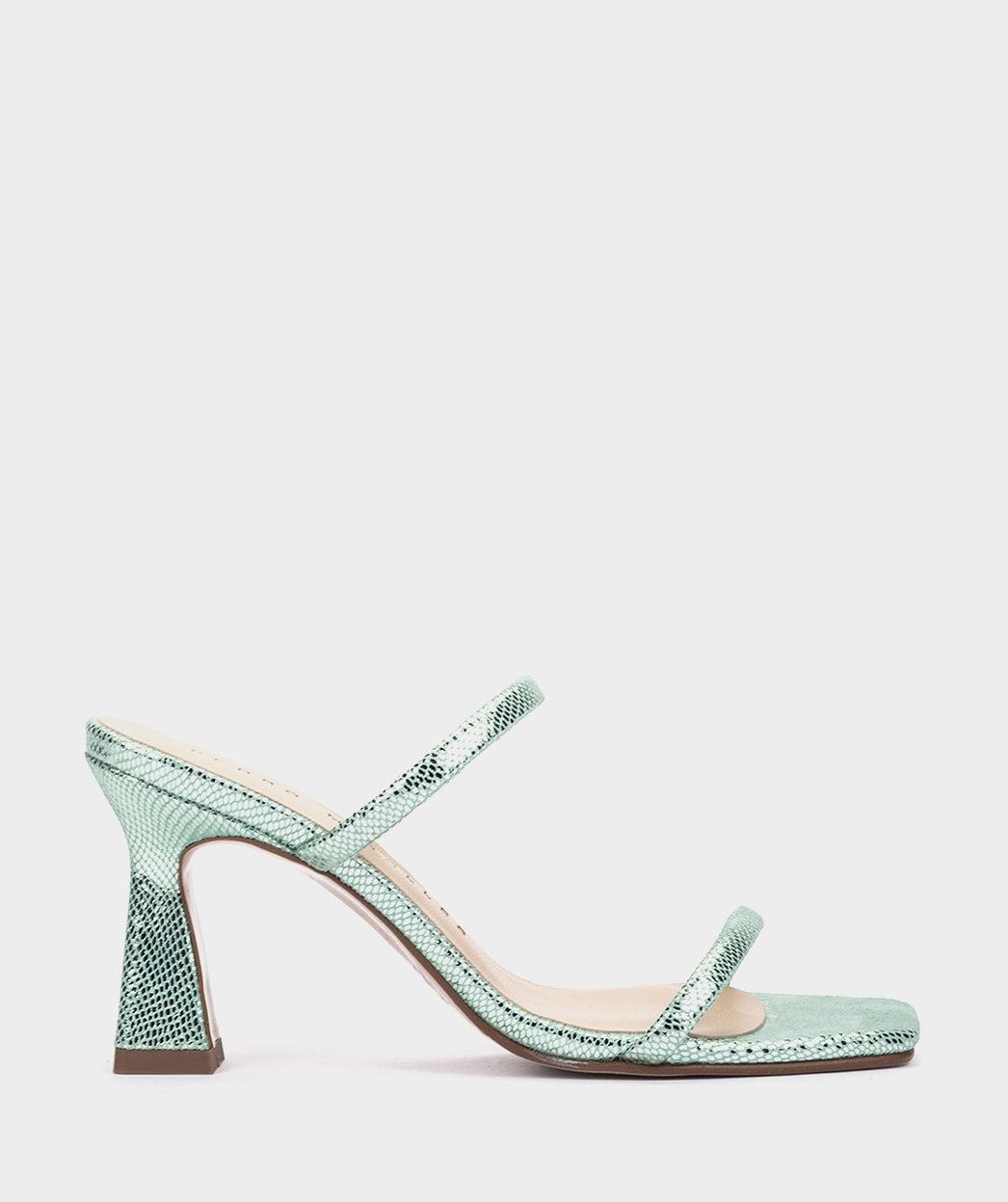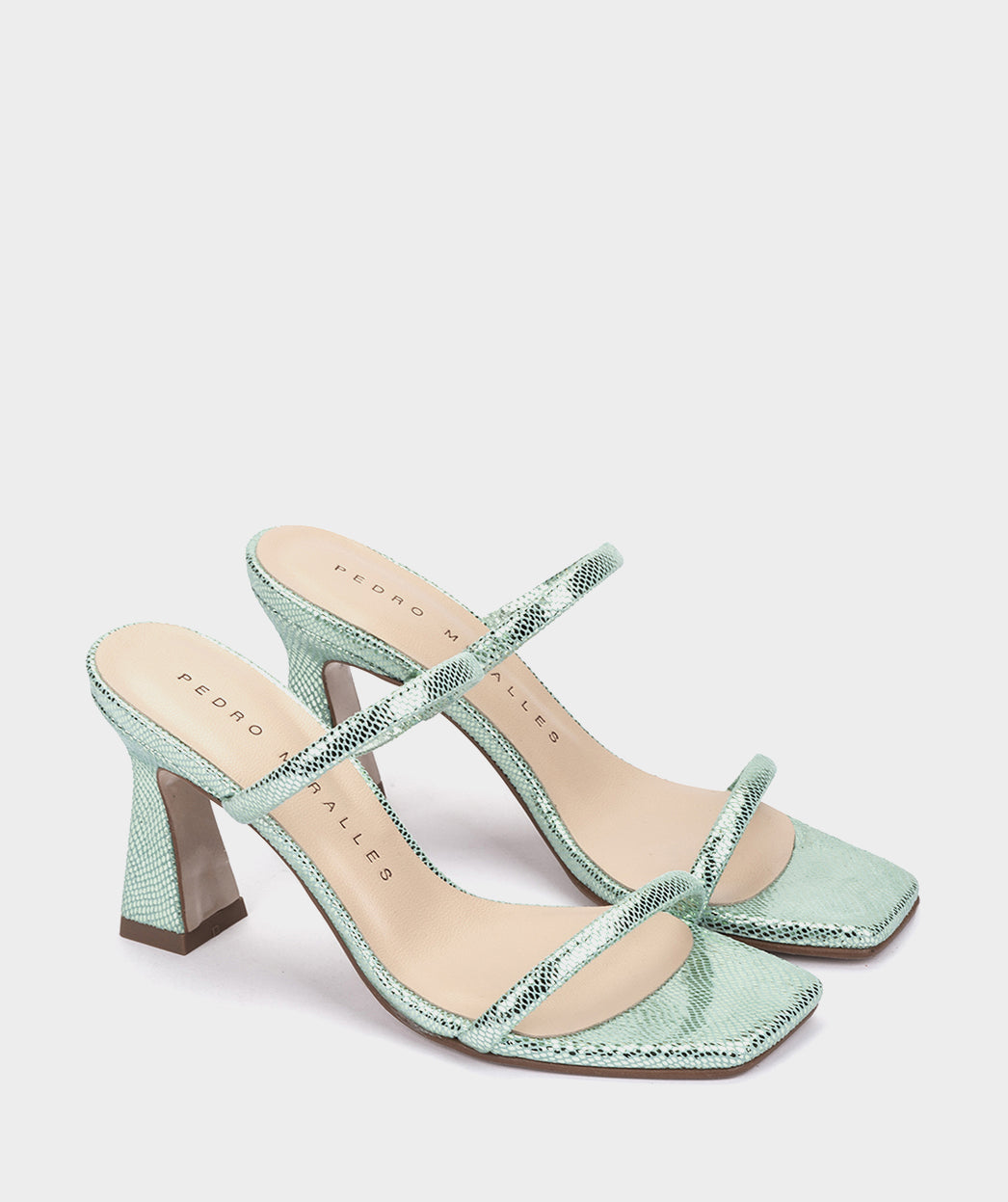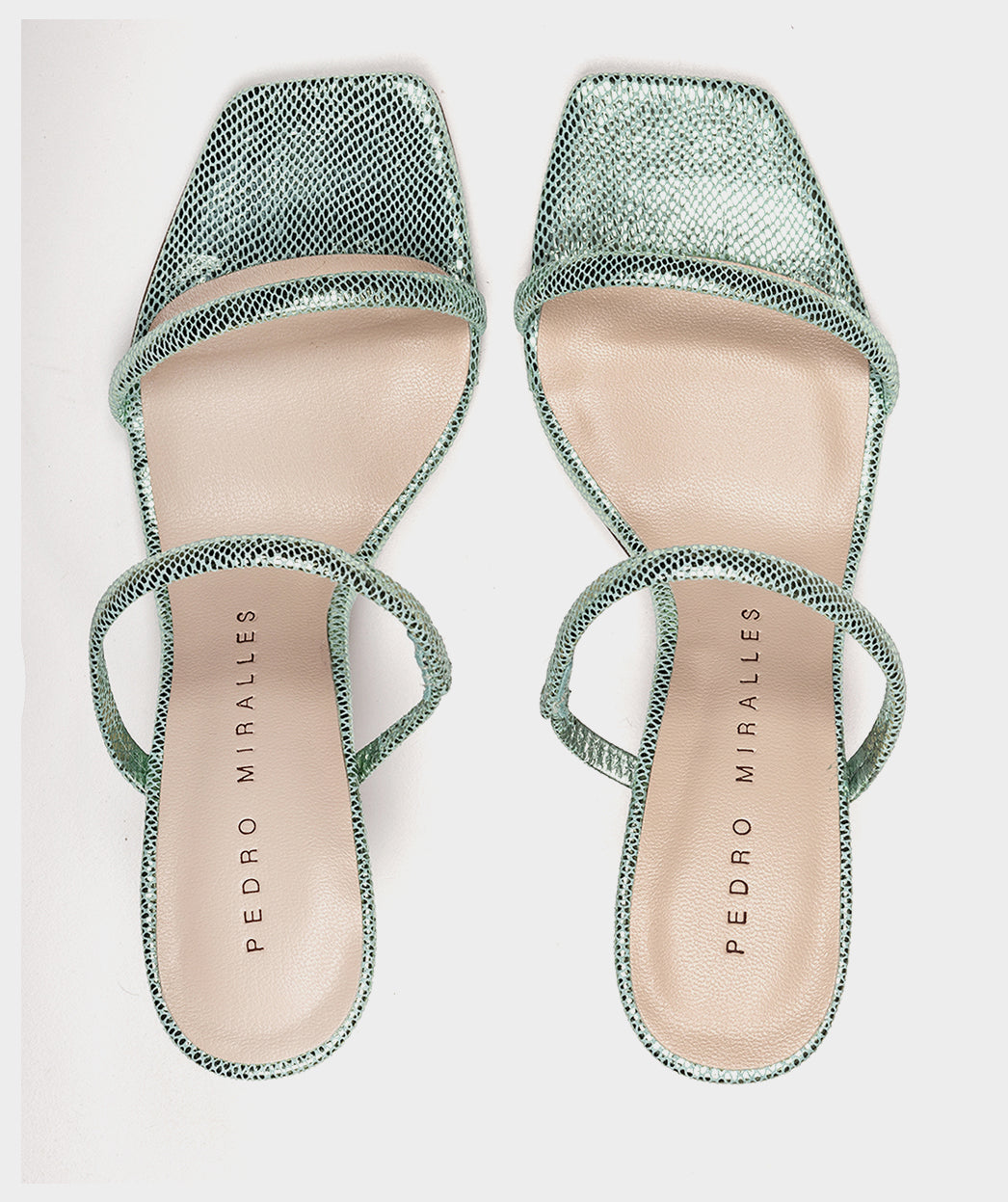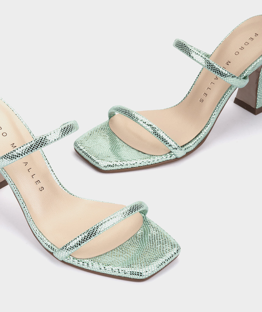 Sandálias de tacão em pele verde metálico. Estas sandálias têm um design minimalista e requintado, são uma combinação única que se destaca pela sofisticação e estilo intemporal.
