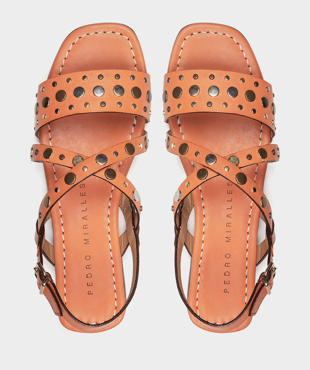Sandálias rasteiras de couro laranja. Este modelo foi confeccionado com tachas redondas de diversos tamanhos que proporcionam um toque único e glamoroso. Fique fabuloso nesta temporada com as sandálias Alcudia!
