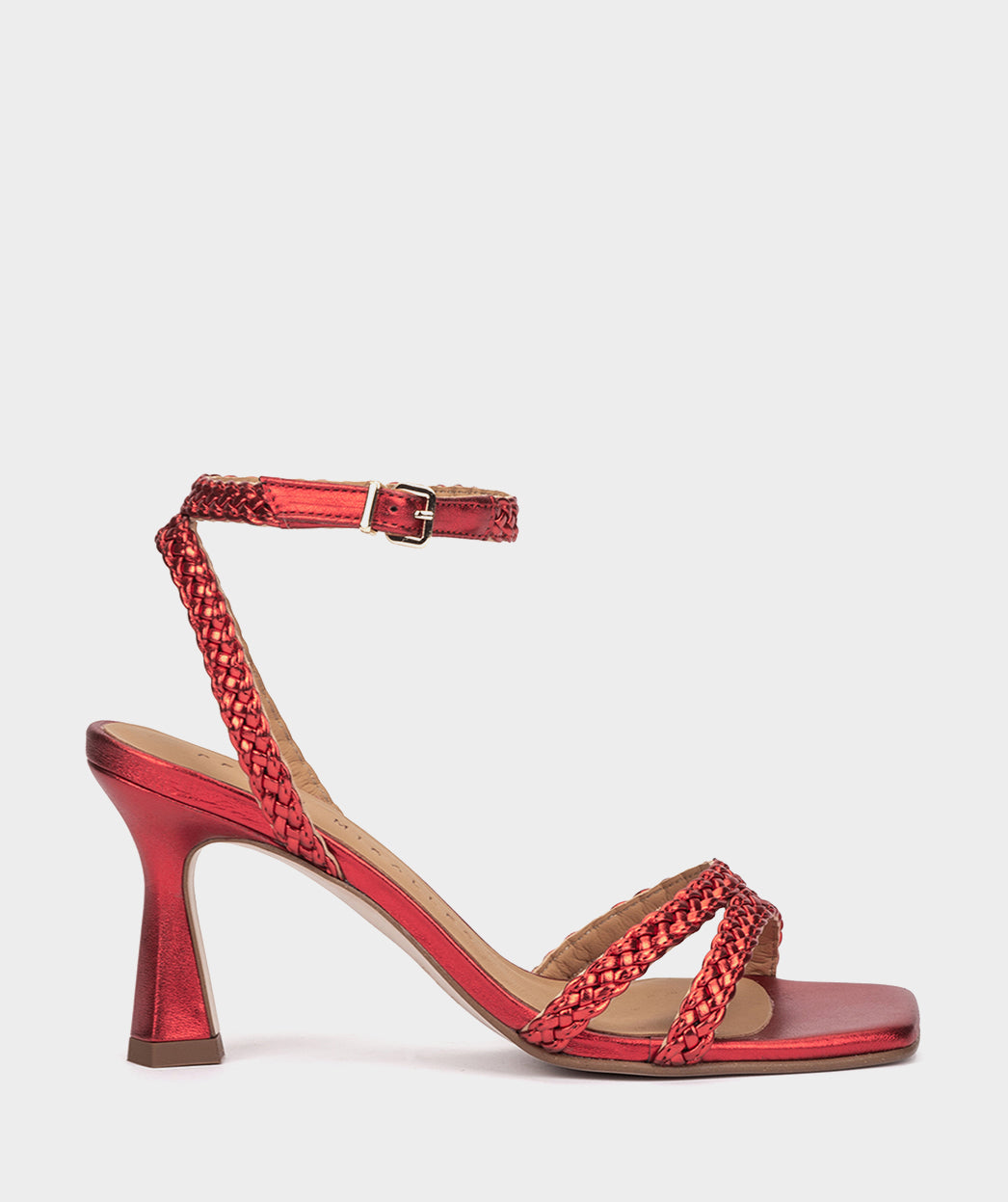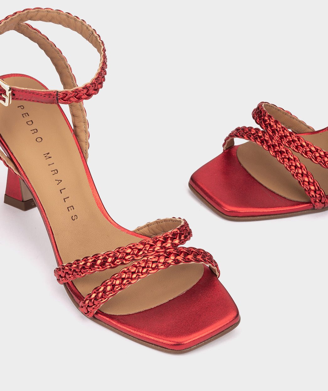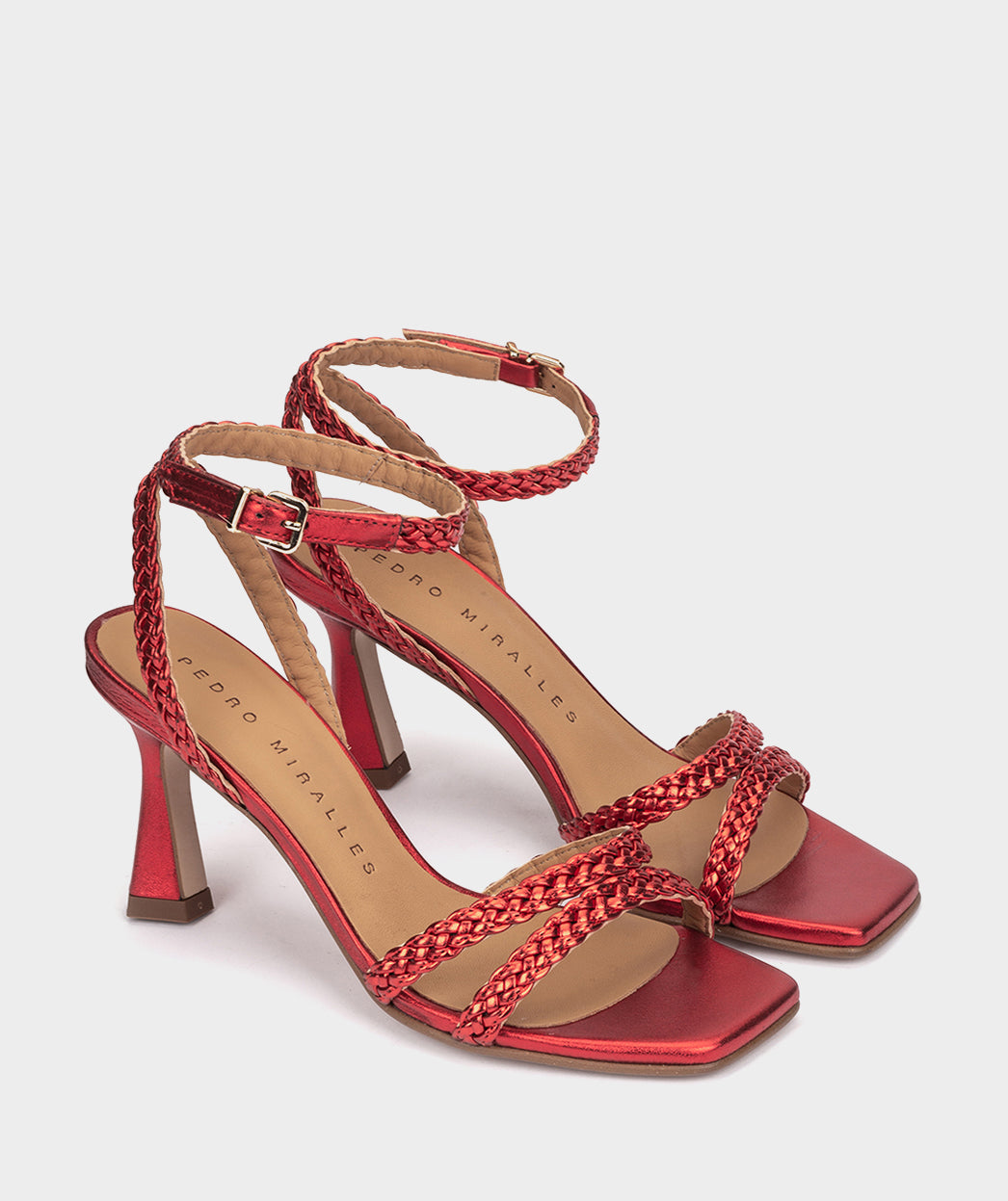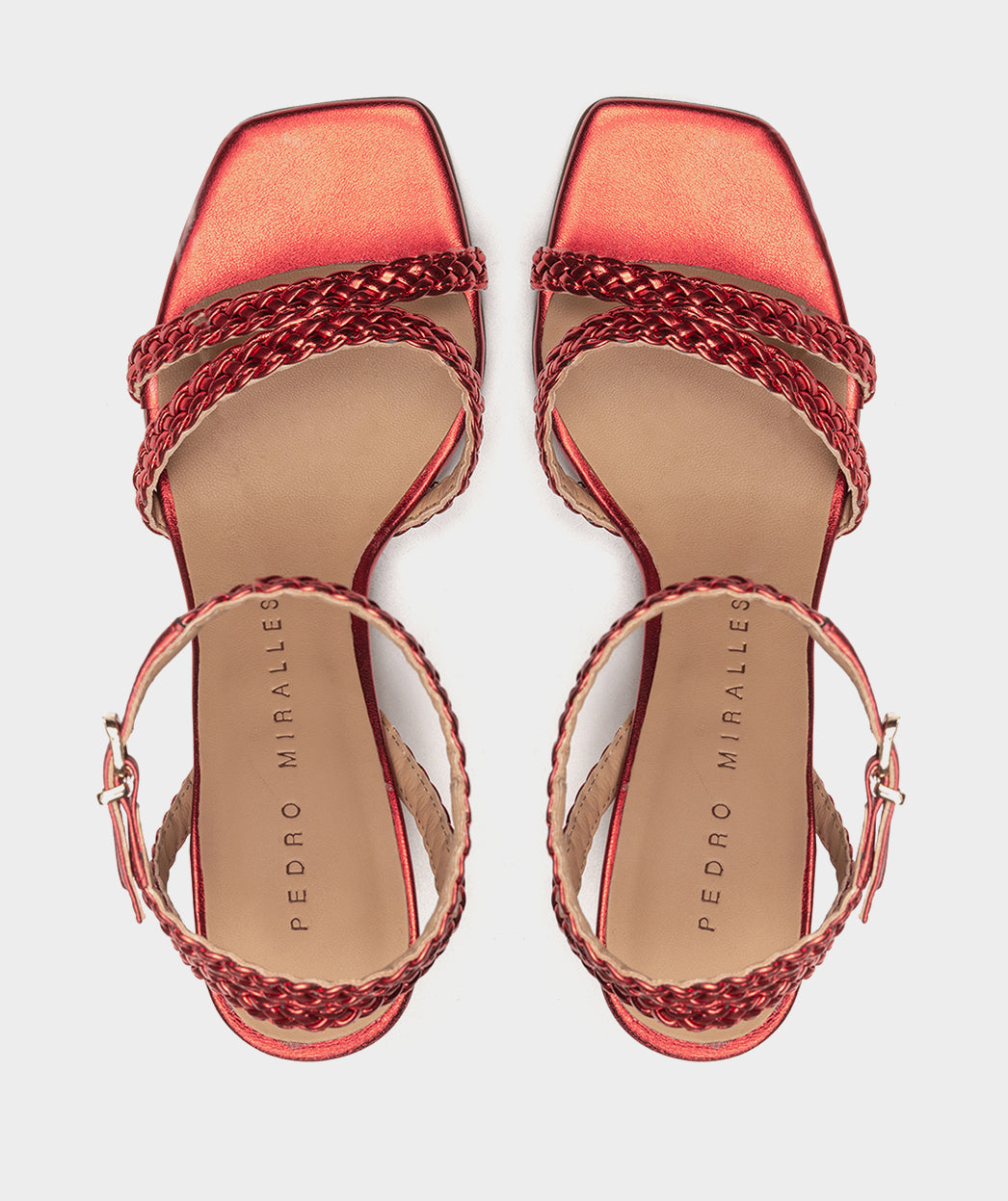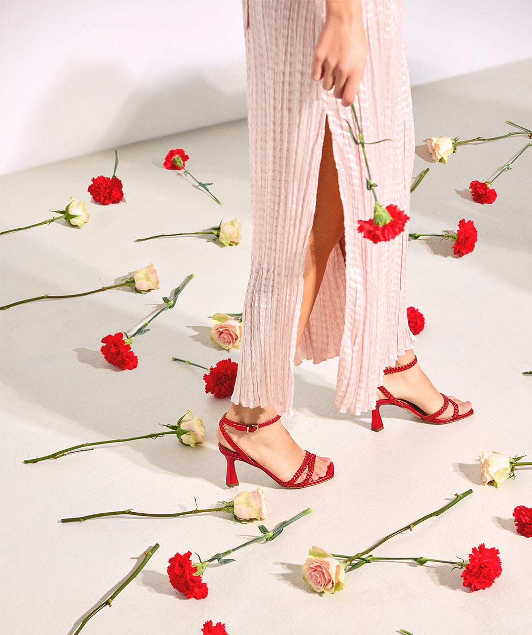 Sandálias de salto vermelho metalizado. O modelo Mogán destaca-se pelo seu design minimalista e original que consegue um ajuste único e confortável. Com estas sandálias você vai atrair a atenção de todos.