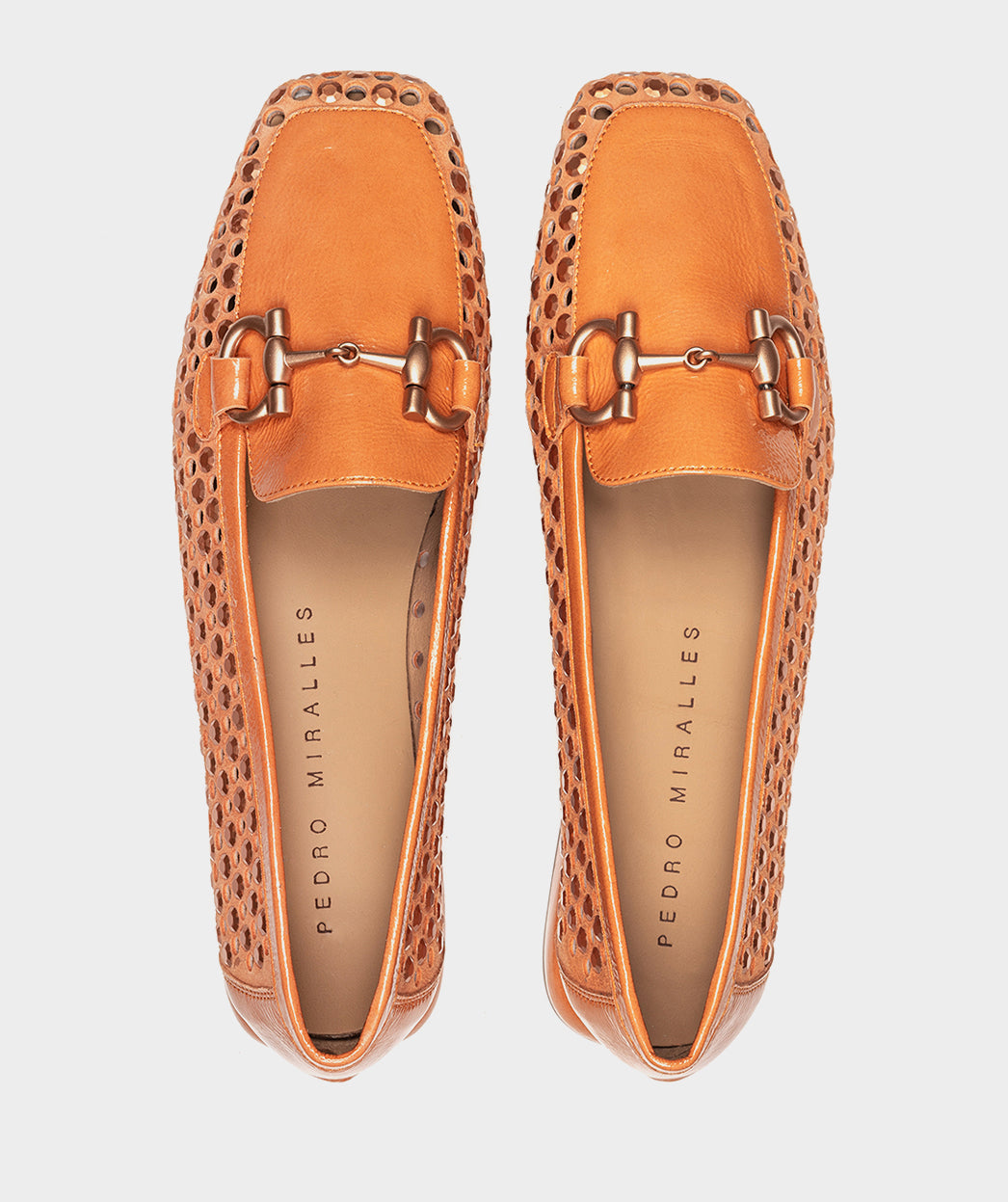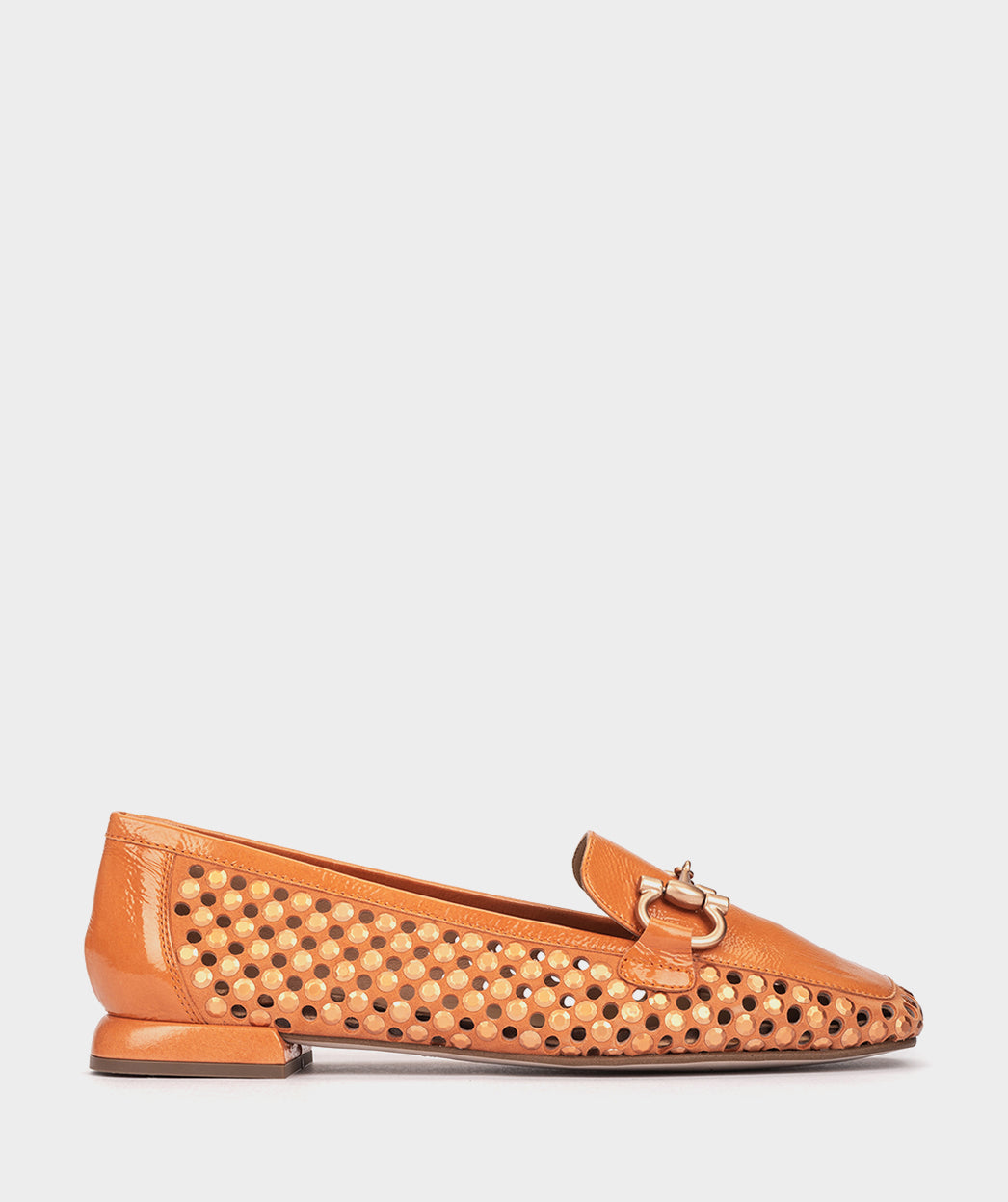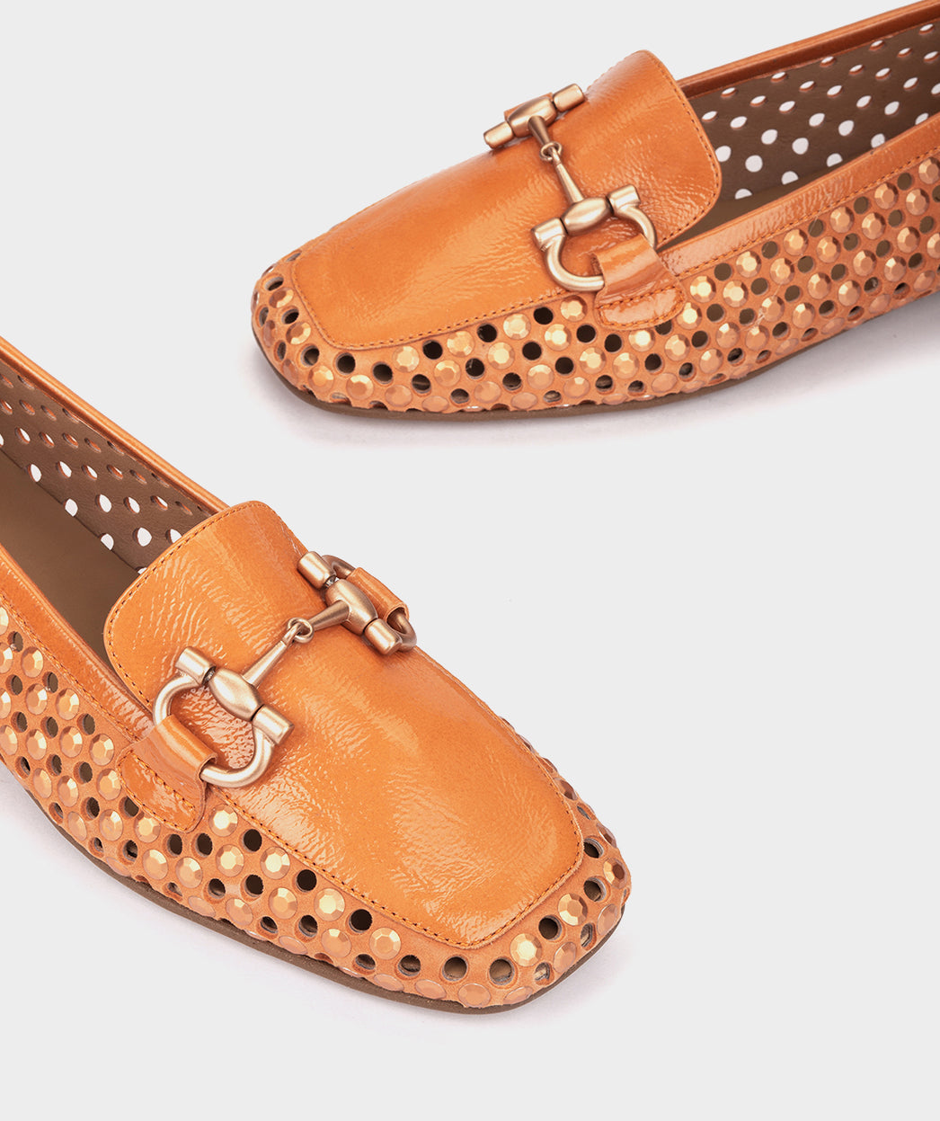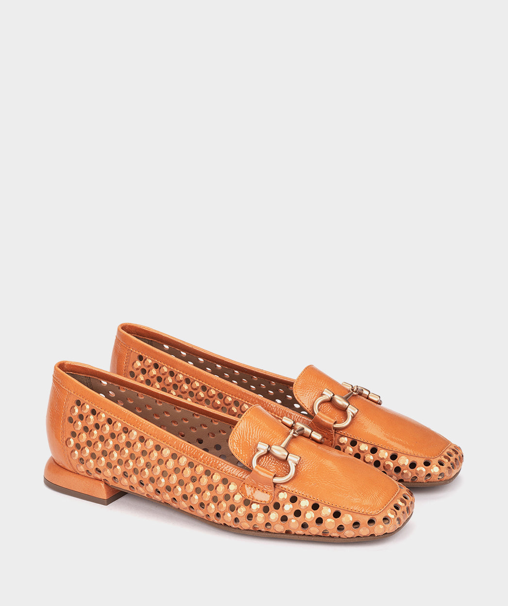Mocassins recortados em laranja com tachas e decoração. Os mocassins mais verão da coleção. Graças ao seu design recortado, torna-o um modelo adequado para usar no verão. Um modelo que combina estilo clássico com modernidade.