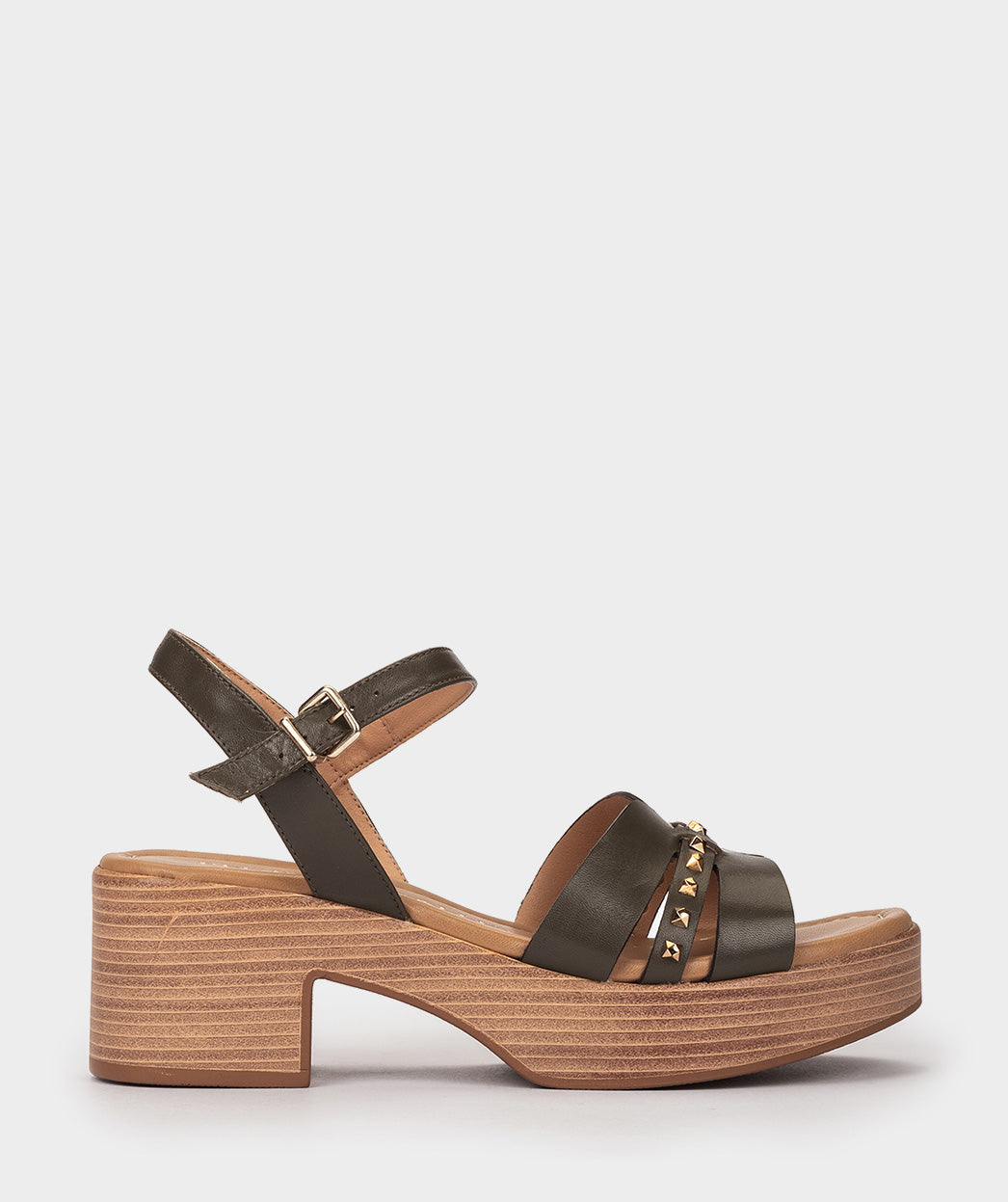 Sandálias de couro verde cáqui. Este modelo se tornará um dos seus favoritos para usar nesta temporada primavera-verão. A combinação de tachas confere-lhe grande personalidade, o que tornará esta sandália única. Você não pode perder o modelo NEILA neste verão.