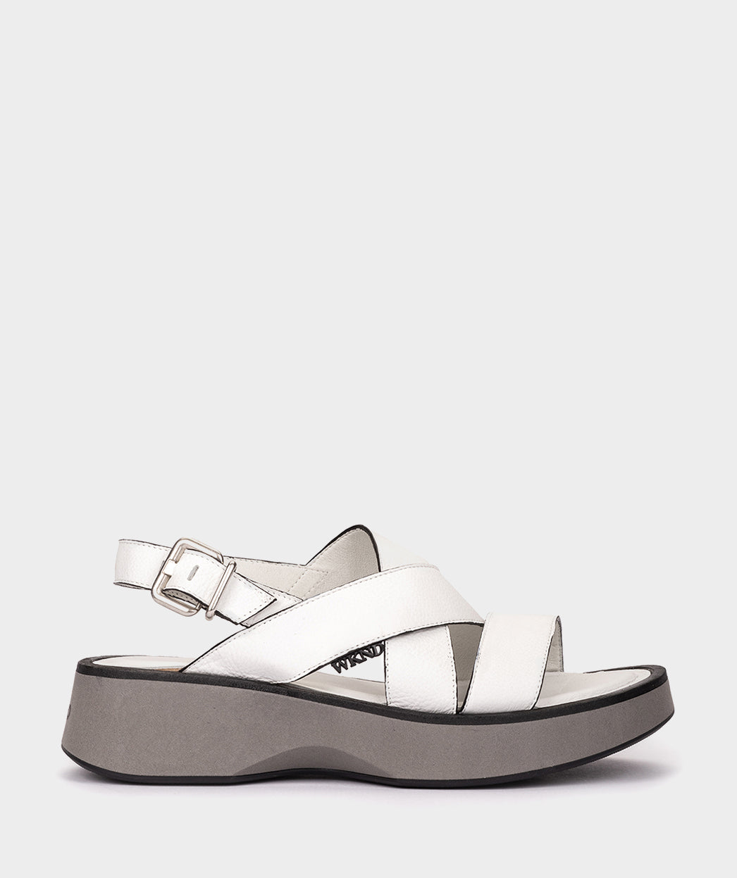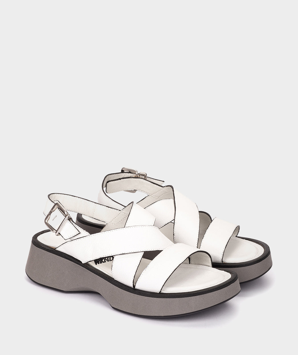 Sandálias de couro branco com sola cinza. Um modelo pensado para ser usado diariamente com looks casuais. A espessura do solado aumenta o conforto do modelo, garantindo uma pisada correta. Modelo da coleção Weekend de Pedro Miralles.