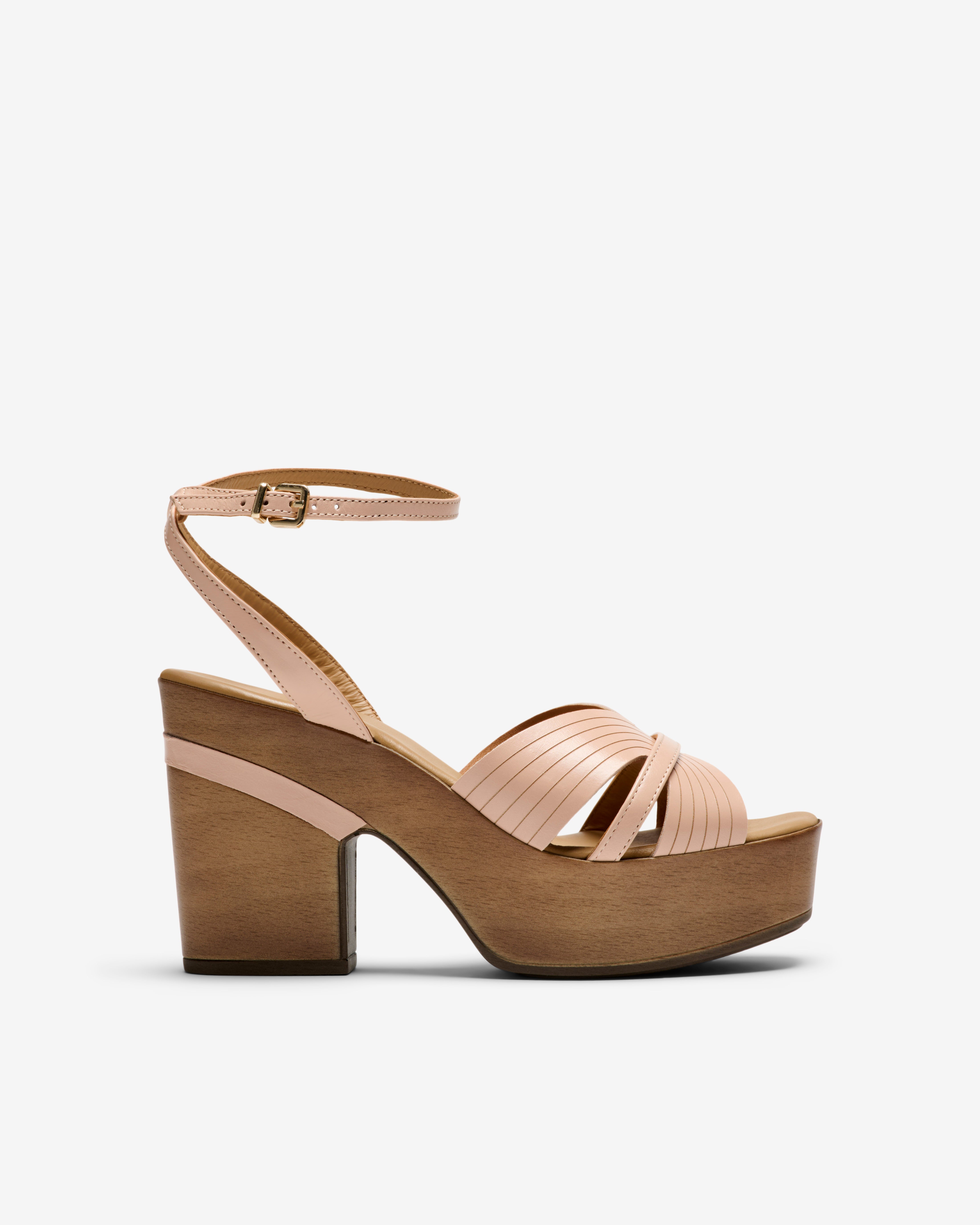Sandálias de couro rosa com plataforma. Projetado para proporcionar altura e conforto. Ele possui alças plissadas cruzadas na parte superior que adicionam textura. Inclui tornozeleira ajustável com fivela metálica para suporte seguro. Um modelo versátil e elegante. Modelo da coleção Weekend de Pedro Miralles.