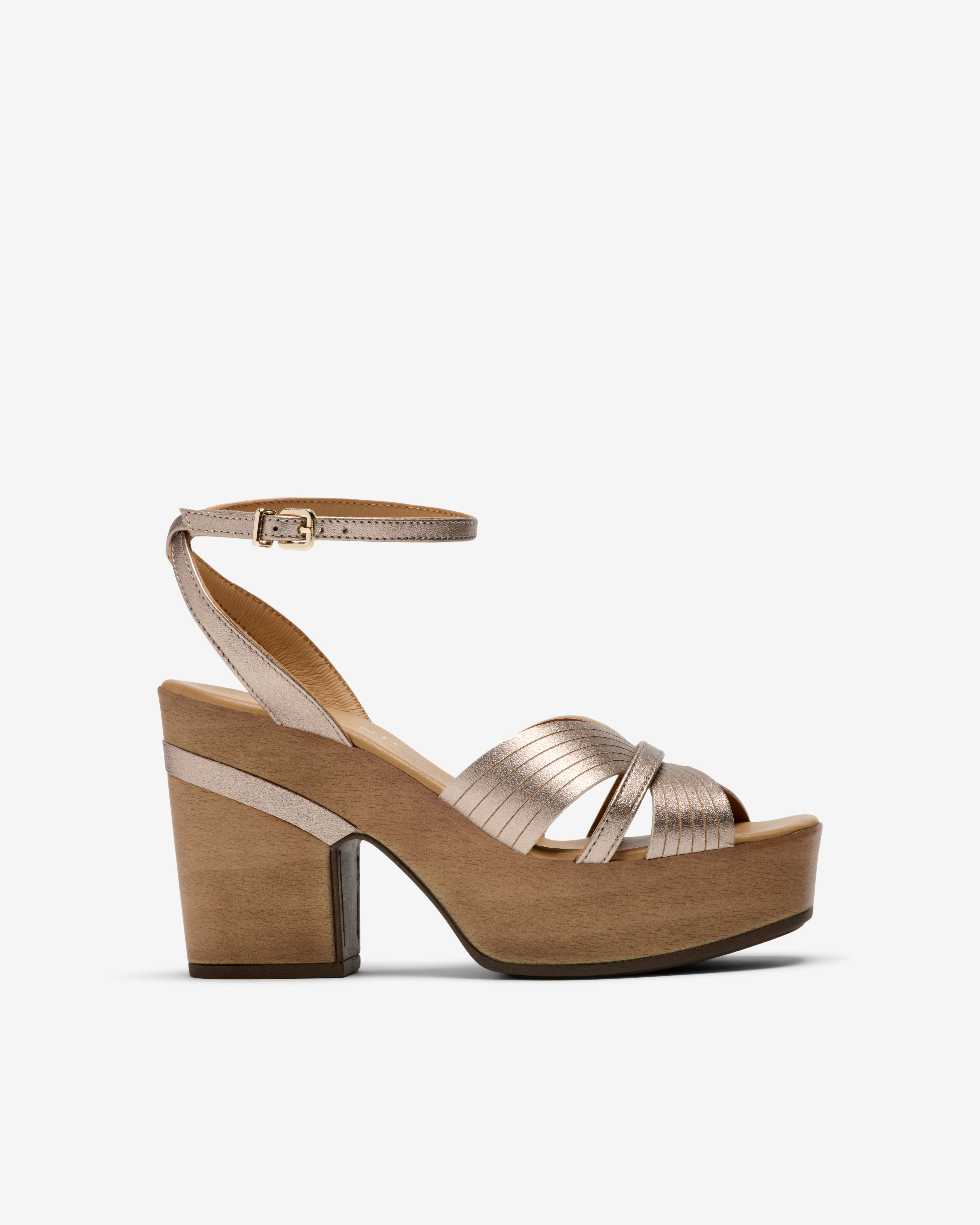 Sandálias de couro metálico com plataforma. Projetado para proporcionar altura e conforto. Ele possui alças plissadas cruzadas na parte superior que adicionam textura. Inclui tornozeleira ajustável com fivela metálica para suporte seguro. Um modelo versátil e elegante. Modelo da coleção Weekend de Pedro Miralles.