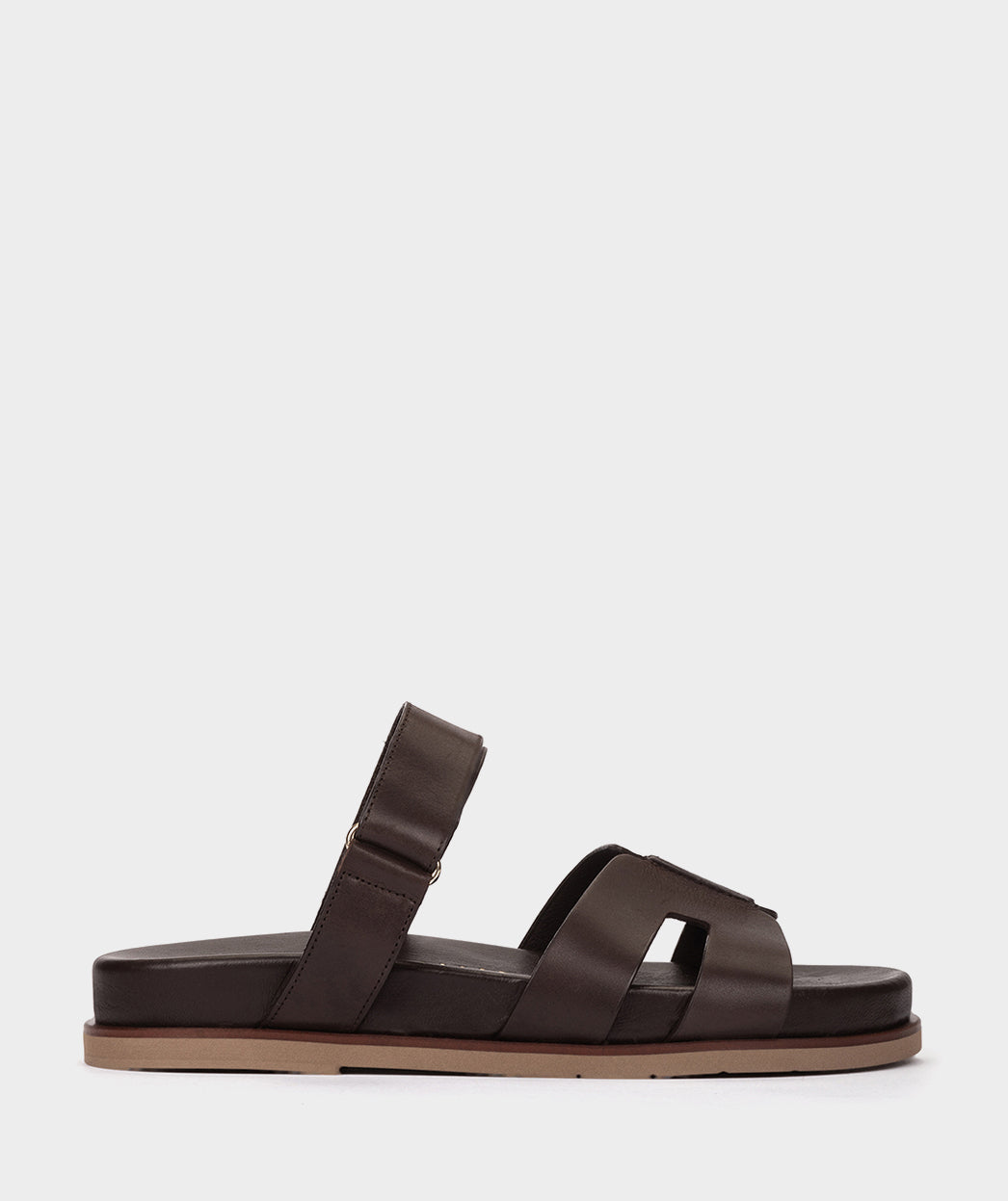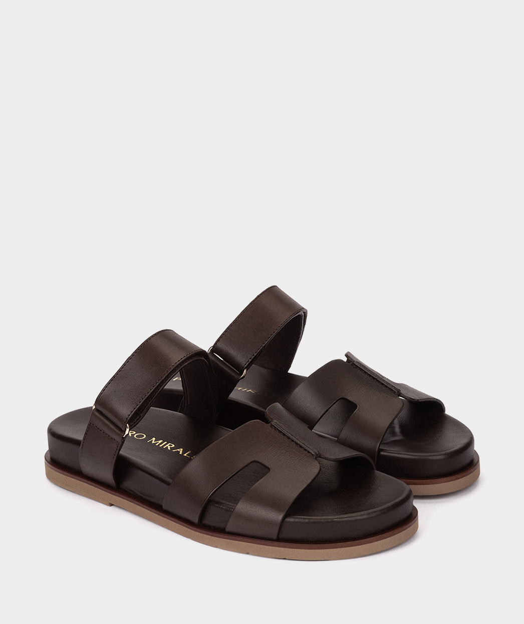 Sandálias rasteiras de couro marrom. Uma opção perfeita para uso diário e um compromisso com o estilo sem sacrificar o conforto. Sua silhueta proporciona suporte ideal aos pés para uma caminhada confortável.