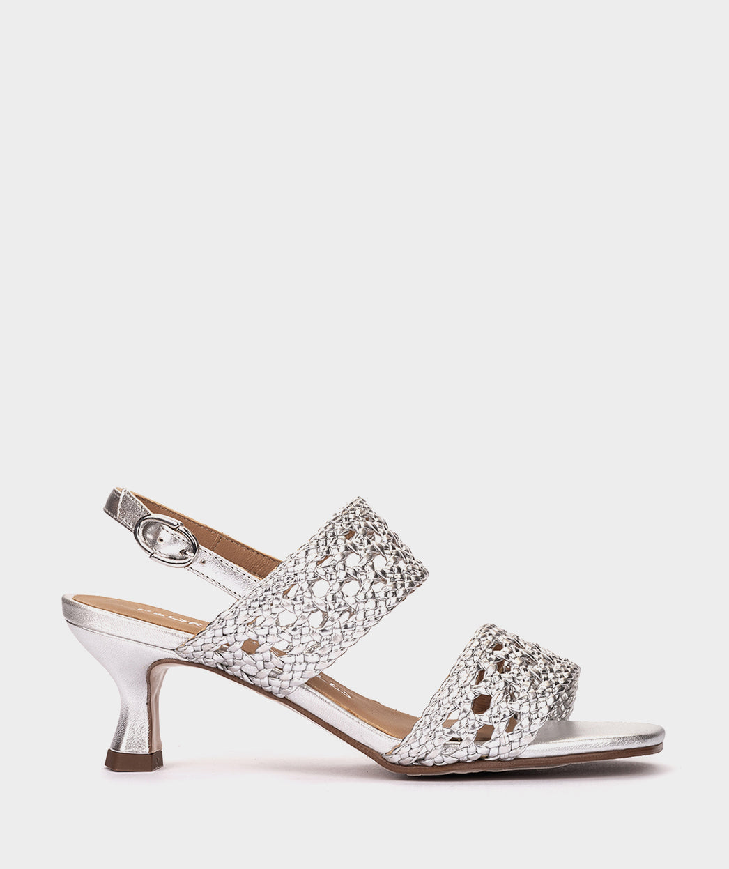 Sandálias de salto trançadas prateadas. Um modelo de estilo mediterrâneo, perfeito para os dias de verão. Um design que se adapta ao pé e oferece suporte ideal.