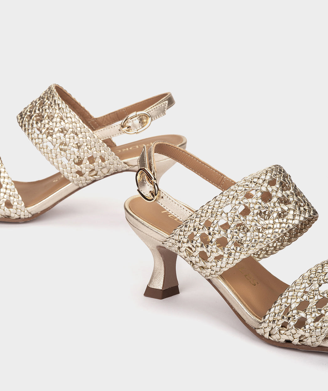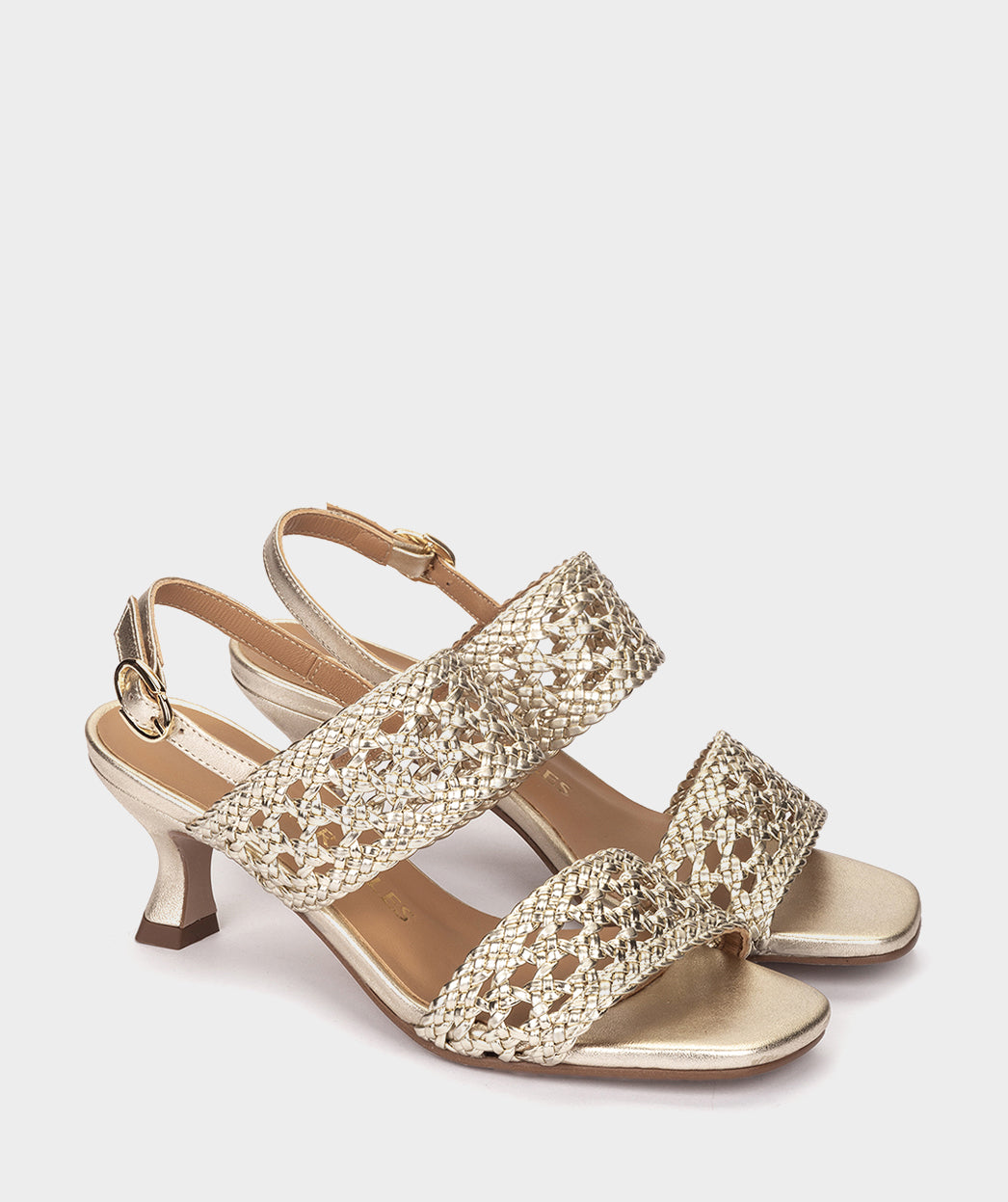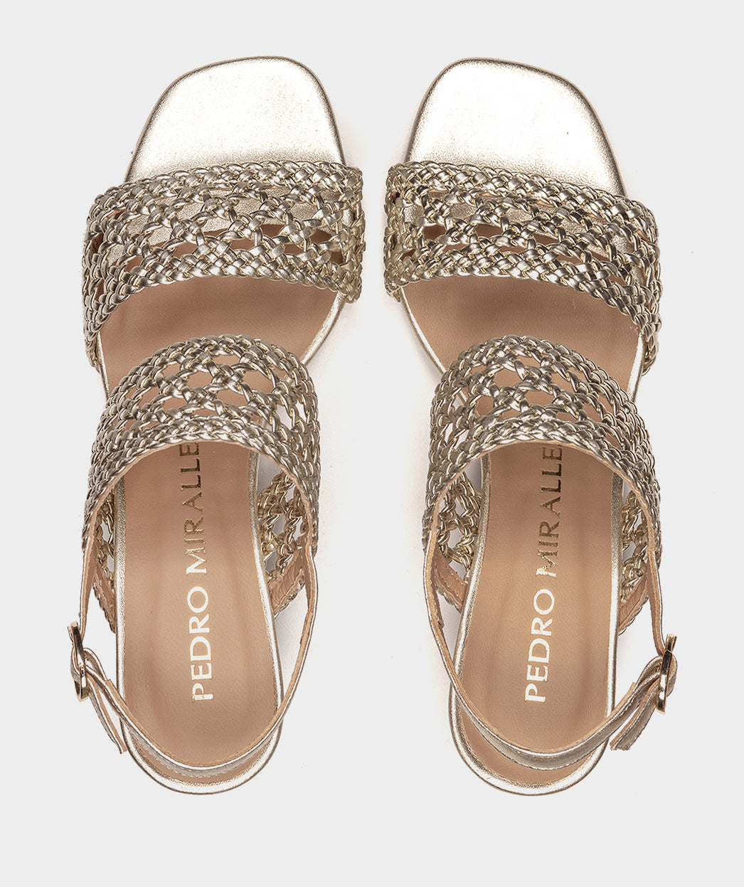 Sandálias de salto trançado na cor platina. Um modelo de estilo mediterrâneo, perfeito para os dias de verão. Um design que se adapta ao pé e oferece suporte ideal.