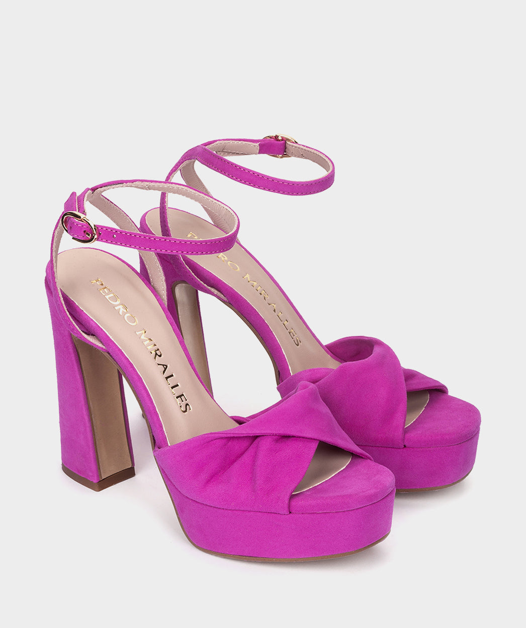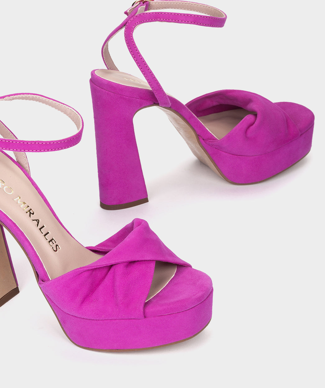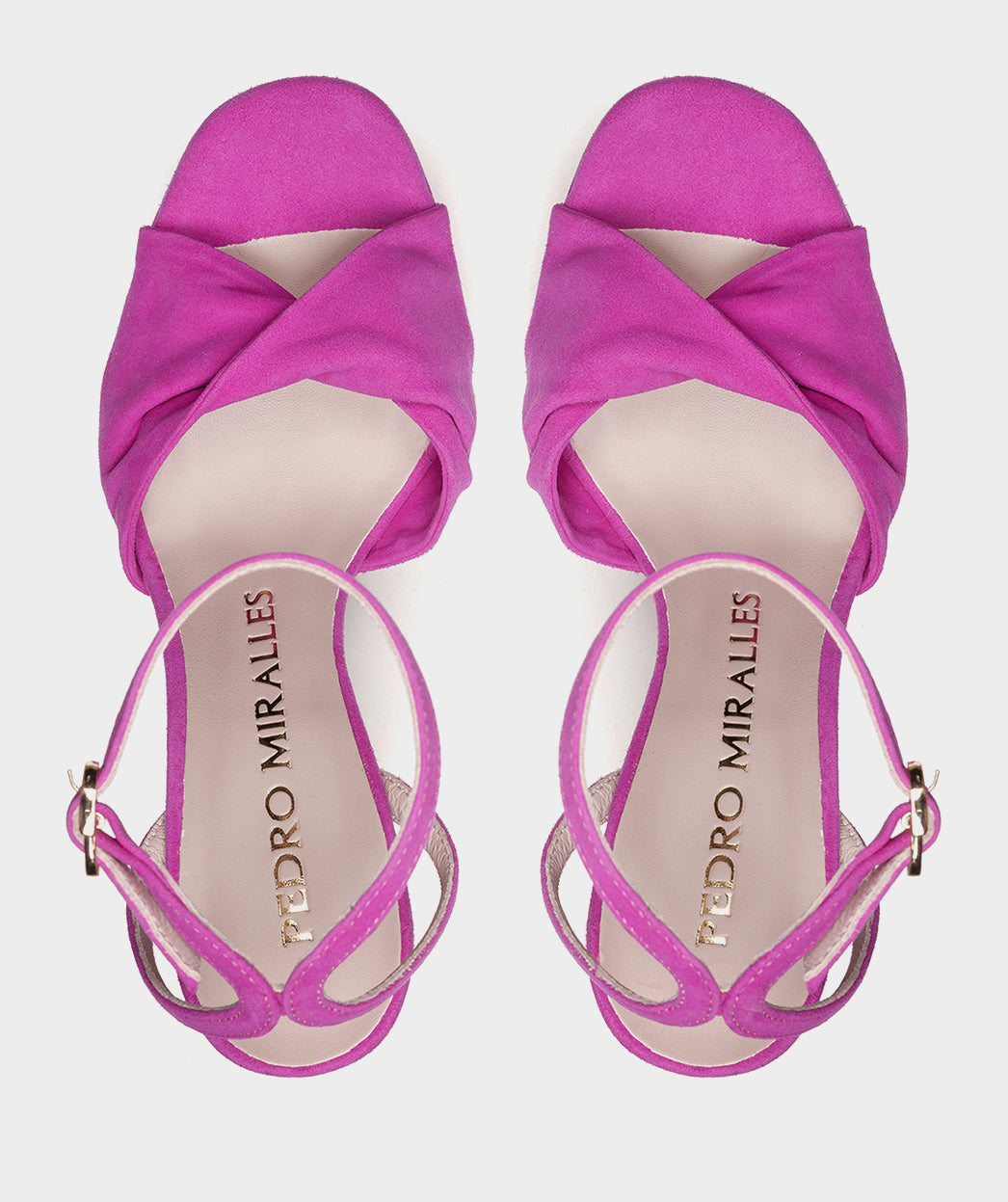 Sandálias de salto alto feitas de camurça cor de buganvília. As sandálias SABUGO combinam estilo e conforto para que possa usá-las durante os seus eventos. Escolha sandálias que sejam uma aposta segura.