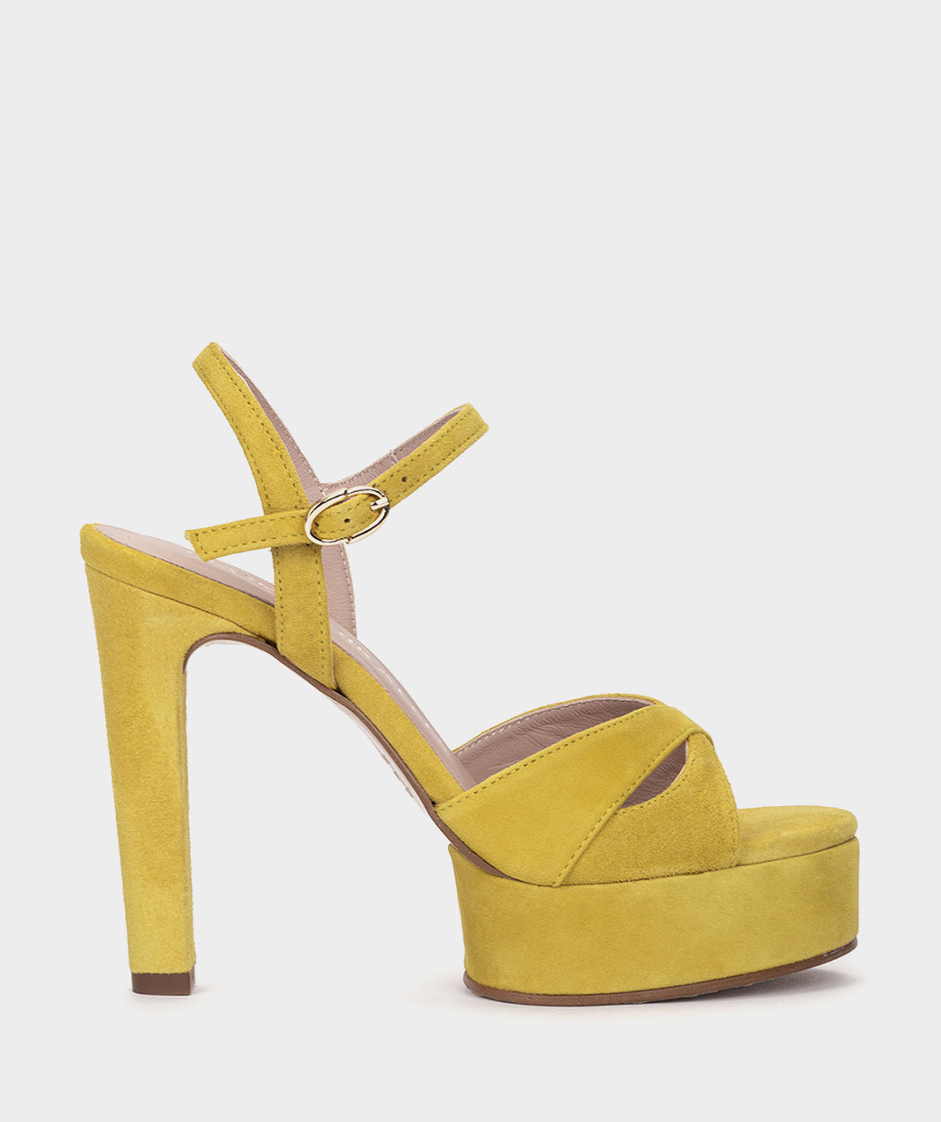 Sandálias de plataforma em camurça com salto em cor de limão. Trazem consigo uma combinação perfeita de conforto e estilo que não passa despercebida.