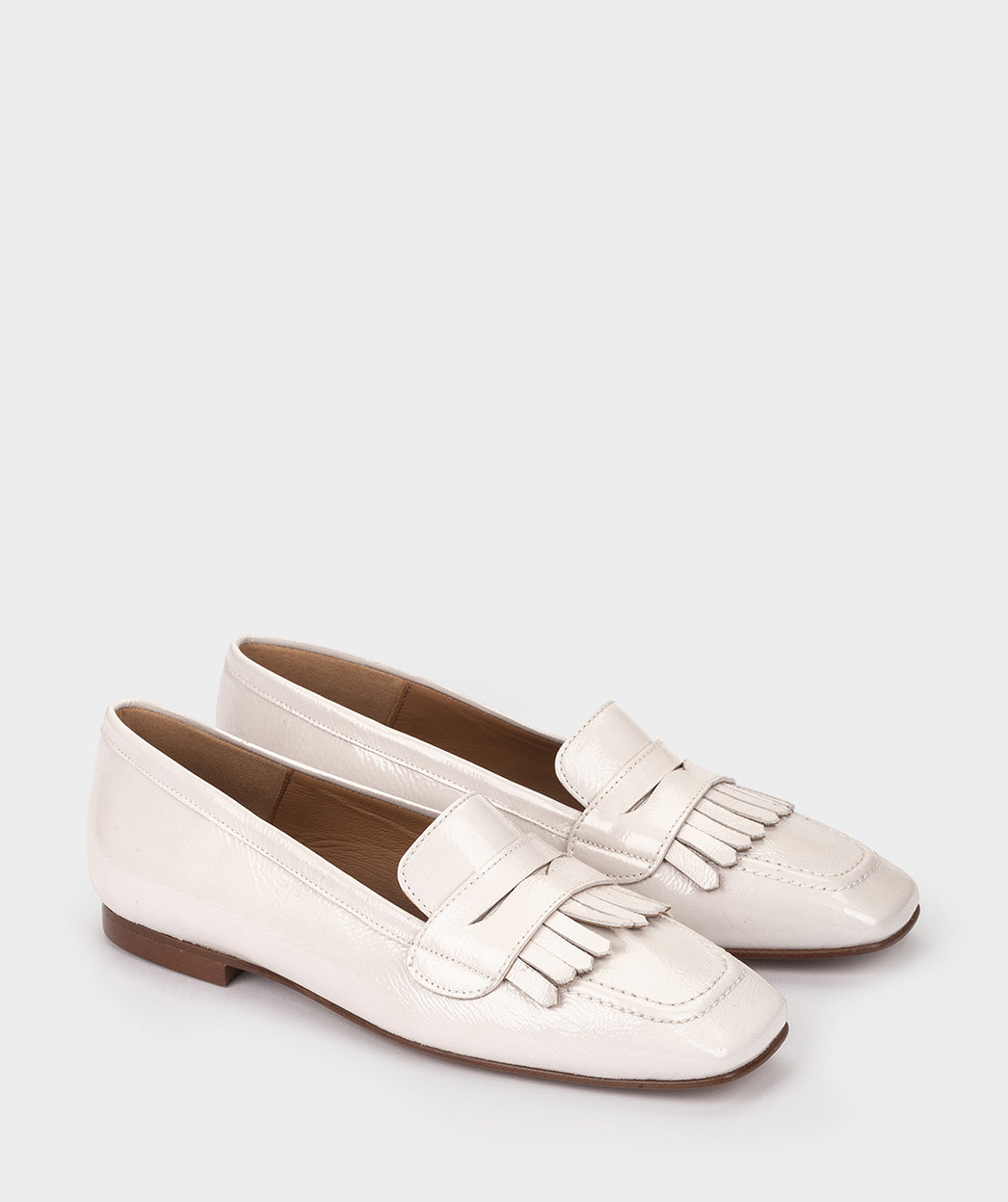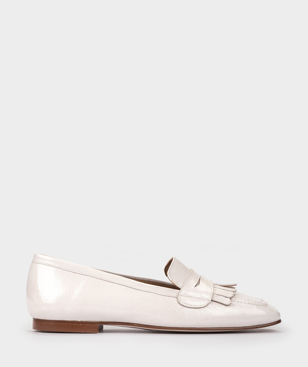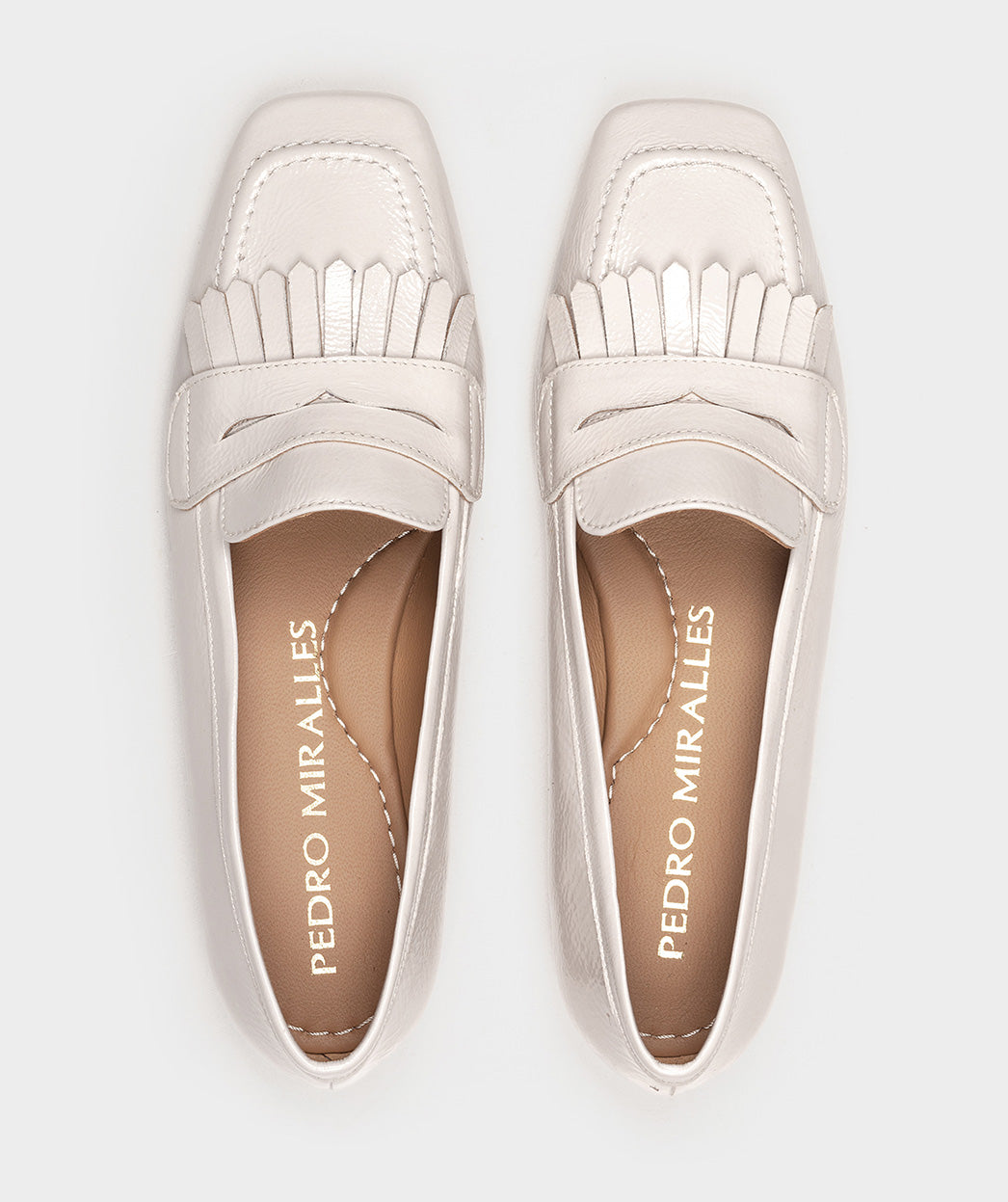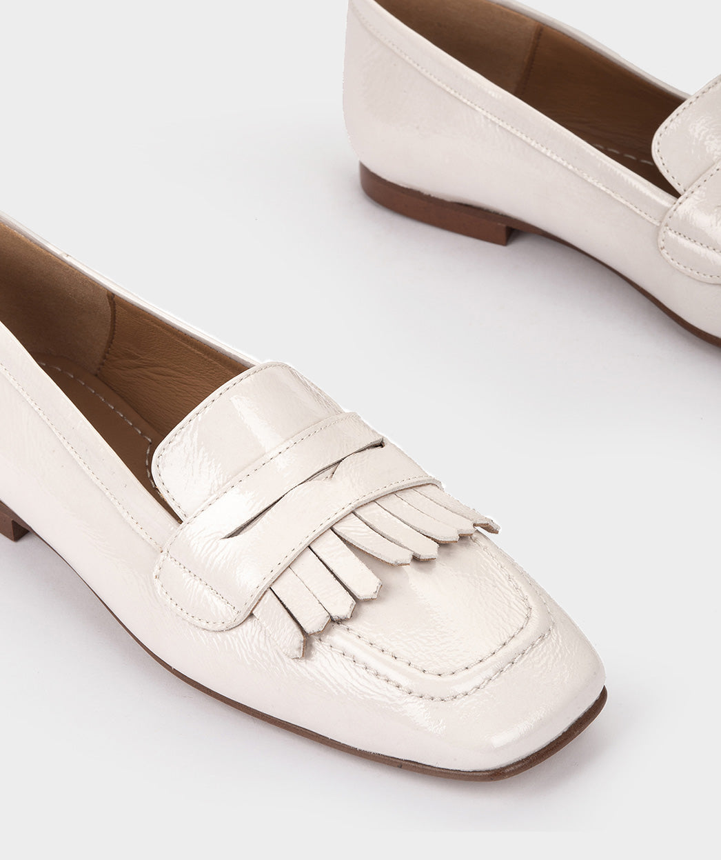 Mocassim branco em verniz. Um design elegante para usar nesta nova estação. Para os amantes dos clássicos, mas com um toque diferente graças às franjas, que dão um toque característico e muito original.