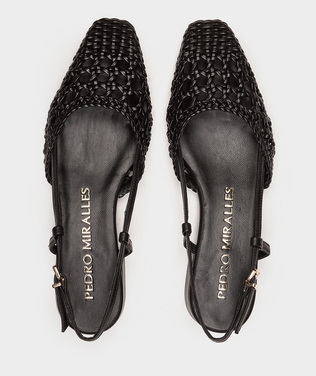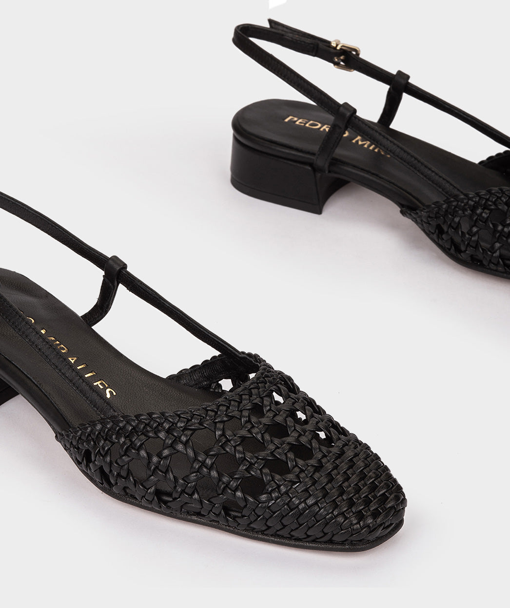 Salto alto trançado preto. A altura ideal para usar confortavelmente o dia todo no escritório ou em uma data especial. Por ser um modelo slingback, é perfeito para usar na primavera-verão.