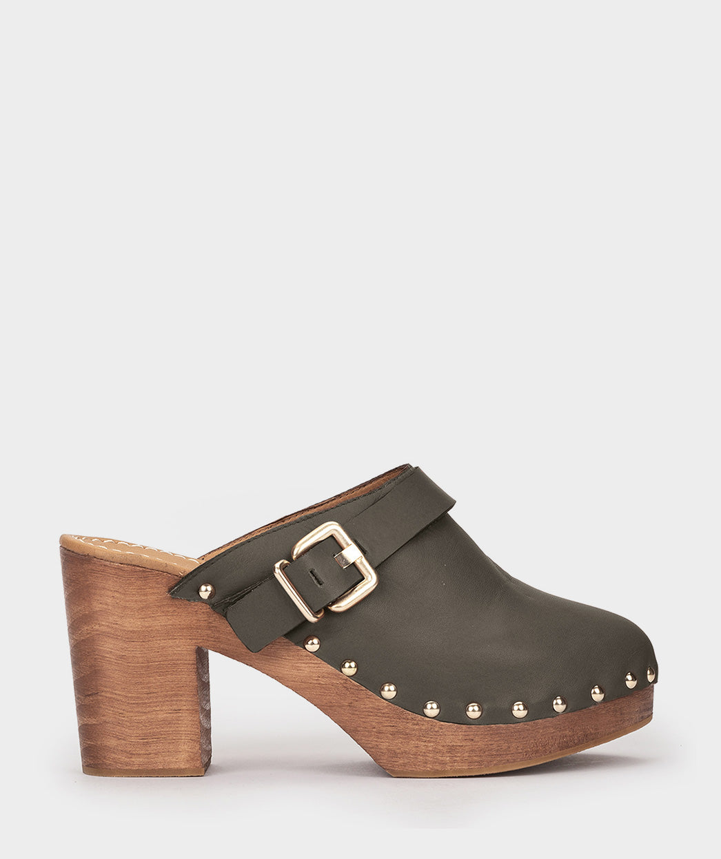 Tamancos de couro verde com fivela. Um design boho-chic que se destaca graças aos tachas que envolvem a silhueta, bem como à fivela lateral. Opte por tamancos nesta temporada.