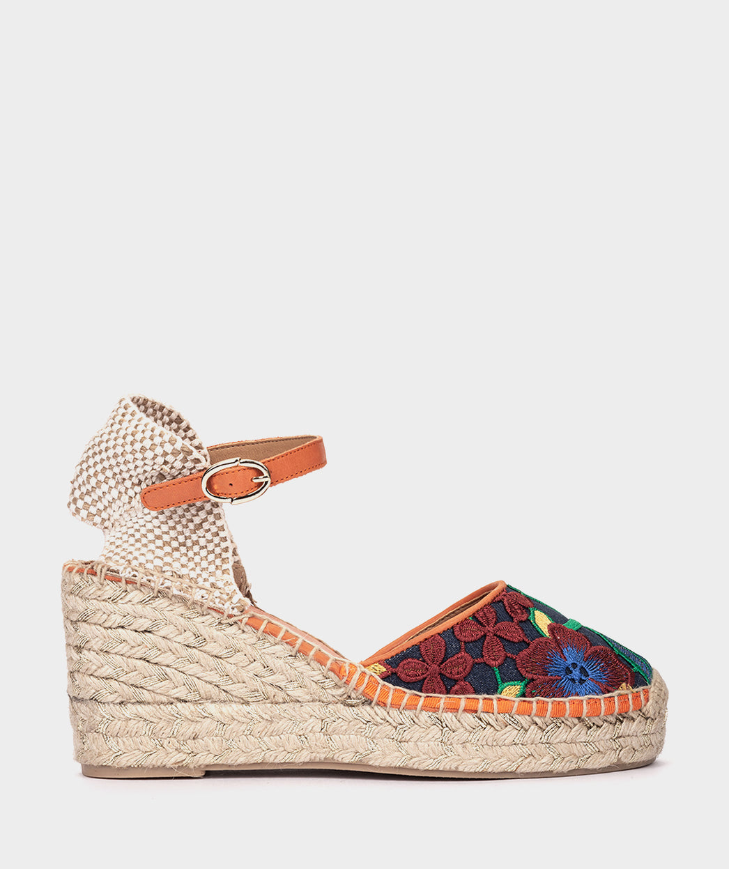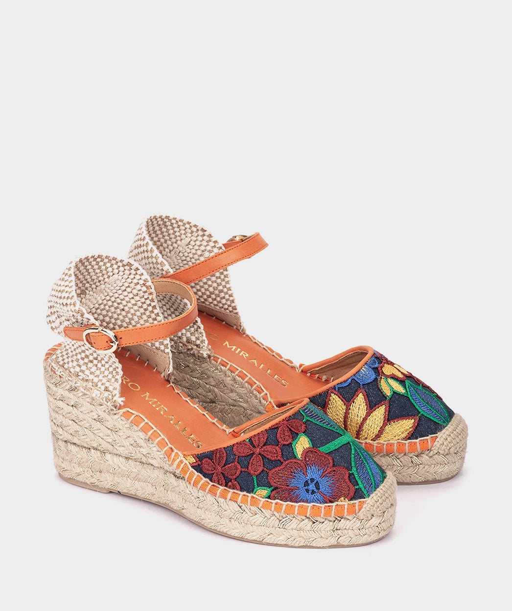 Cunhas de ganga com bordados florais. Um design especial e original para brilhar neste verão. O modelo oferece um suporte ideal, além de ter um fecho de fivela que permite ajustá-lo ao tornozelo.