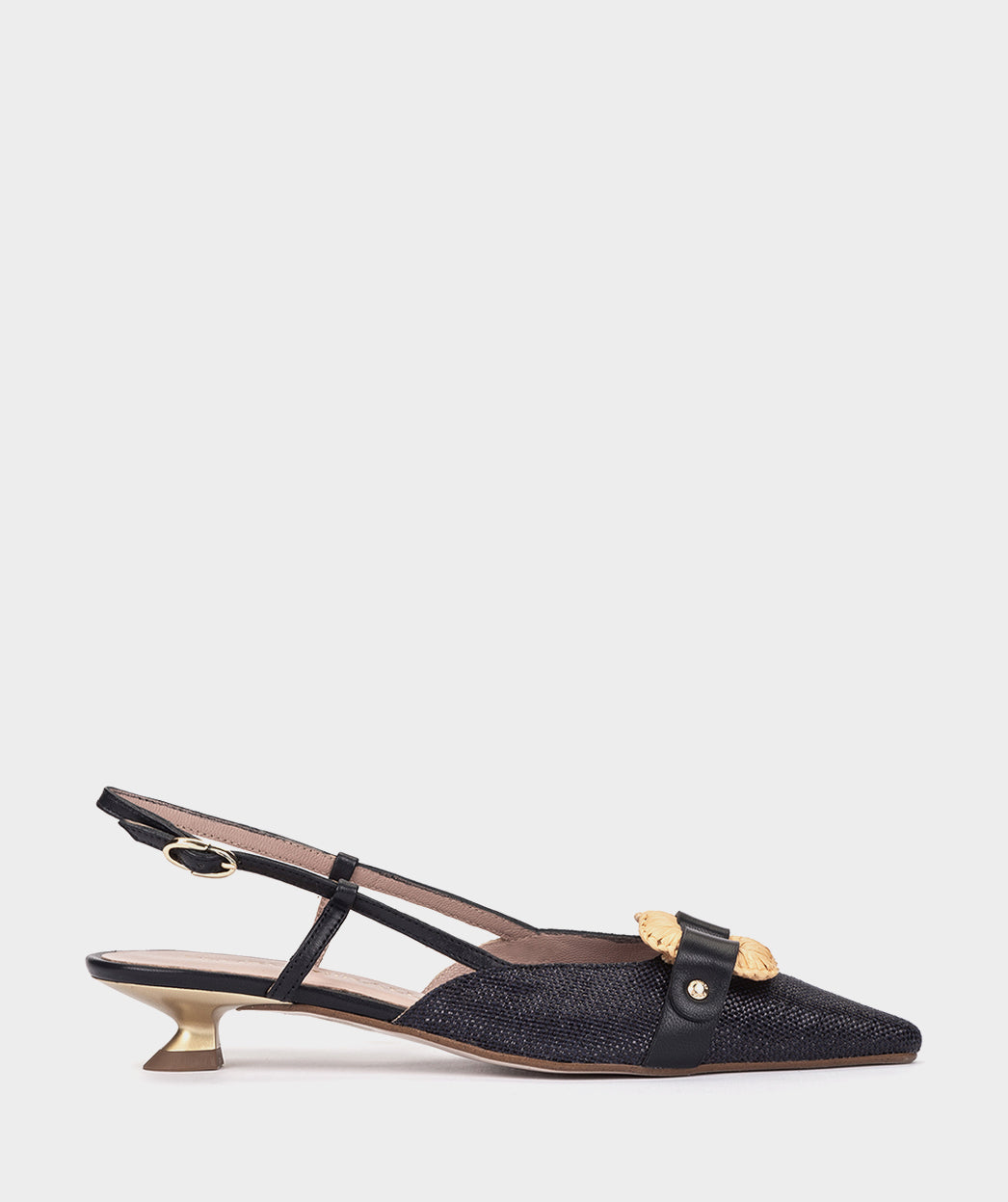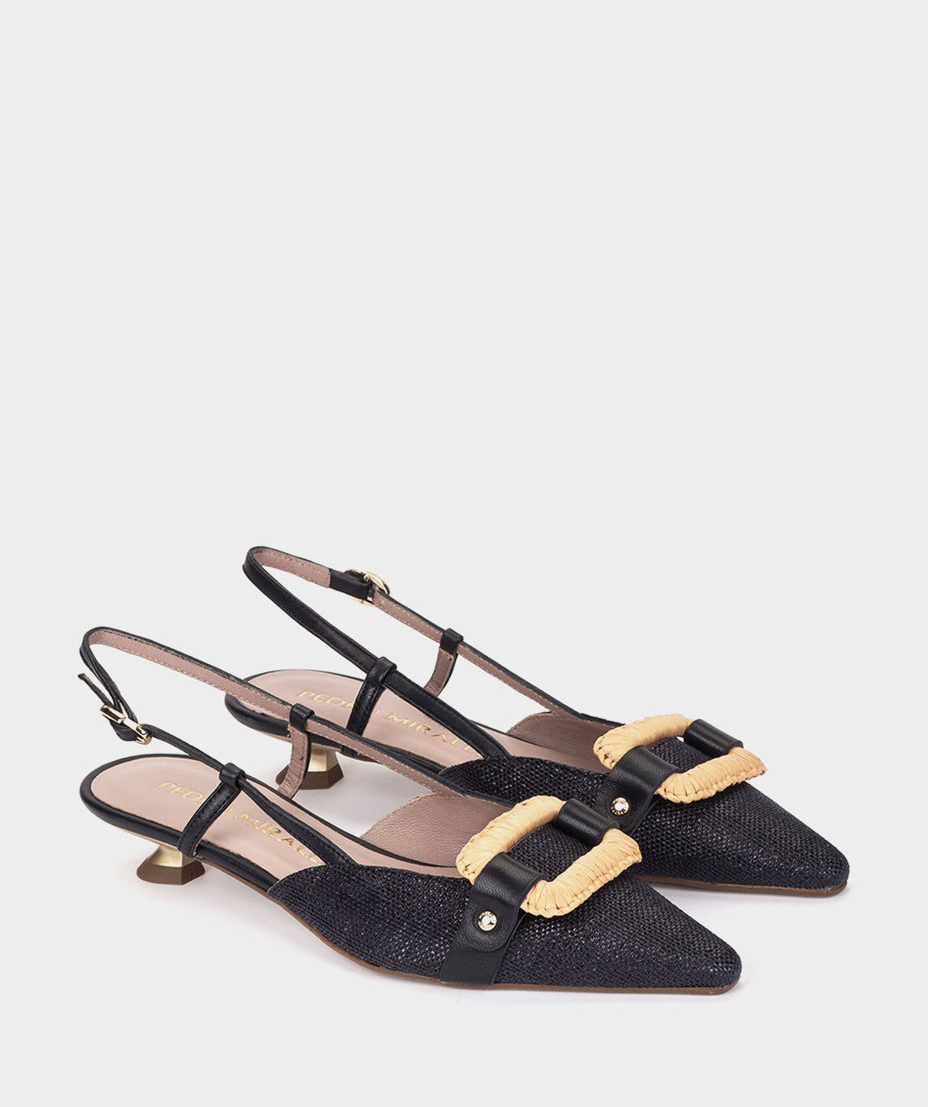 Saltos sem costas em ráfia azul. A versão mais confortável do nosso modelo ZURITA. A combinação de ráfia e uma decoração em forma de fivela confere a este sapato grande personalidade e um estilo único. Ele tornar-se-á o aliado perfeito para quem procura aliar conforto e elegância.
