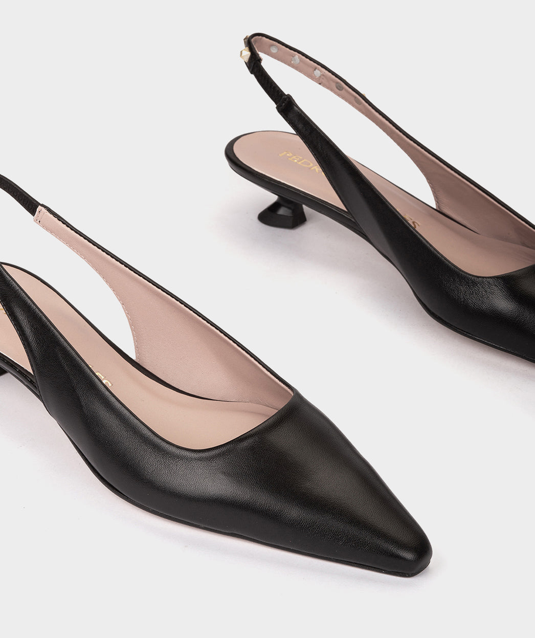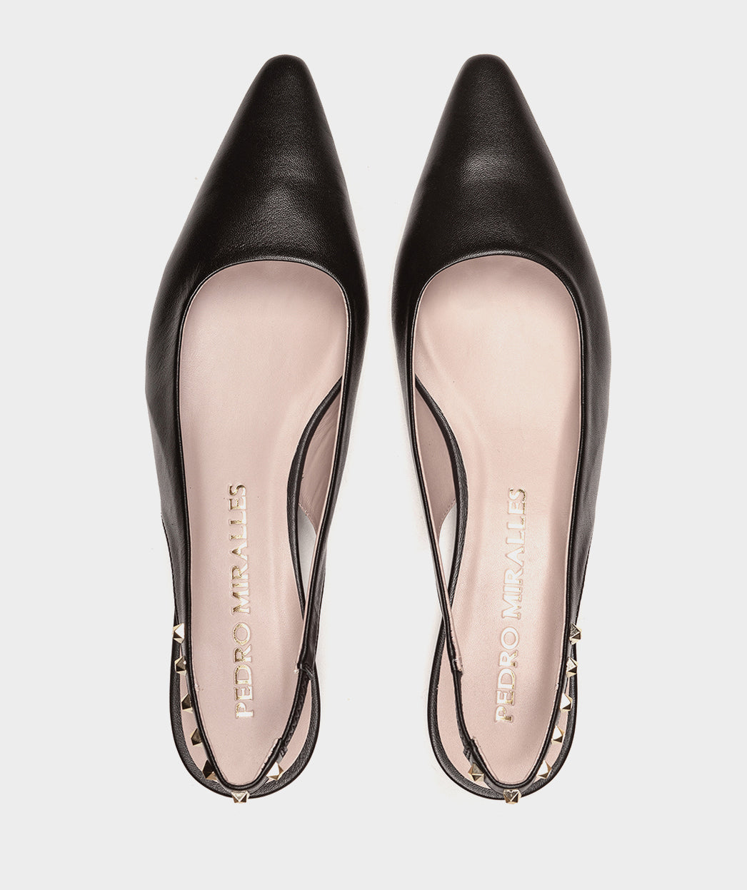 Sapatos de couro preto com salto baixo. A altura da moda também se adapta às silhuetas mais clássicas. Um modelo que se adapta a qualquer ocasião. O detalhe das tachas traseiras no elástico faz a diferença.
