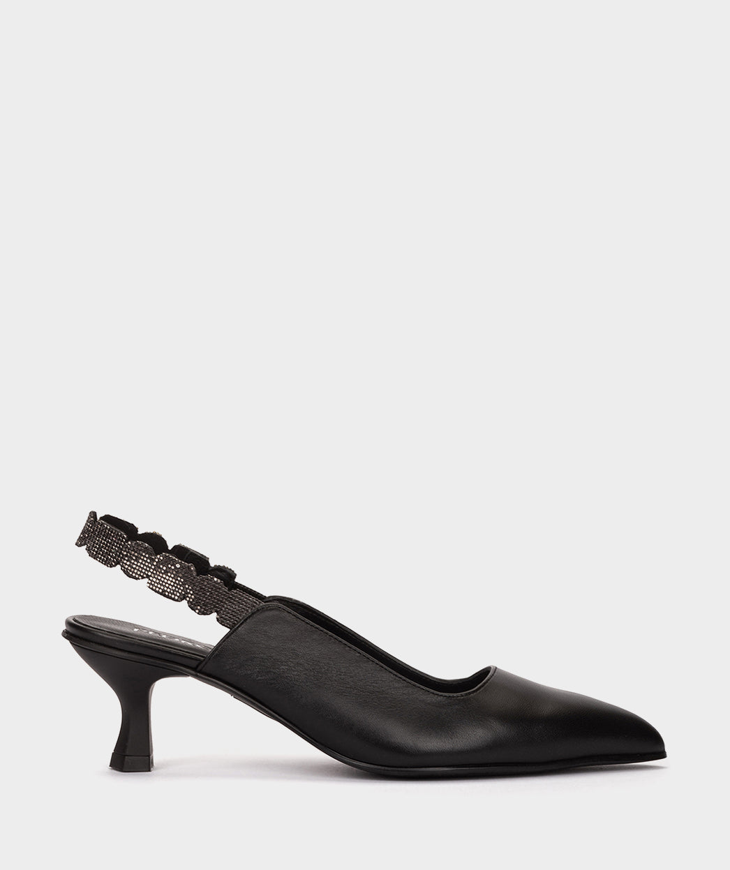 Sapatos de salto aberto em pele preto. Conforto e estilo unem-se para criar o modelo ESLIDA. Se procura um sapato elegante, mas a sua prioridade é o conforto, esta opção é ideal para si.