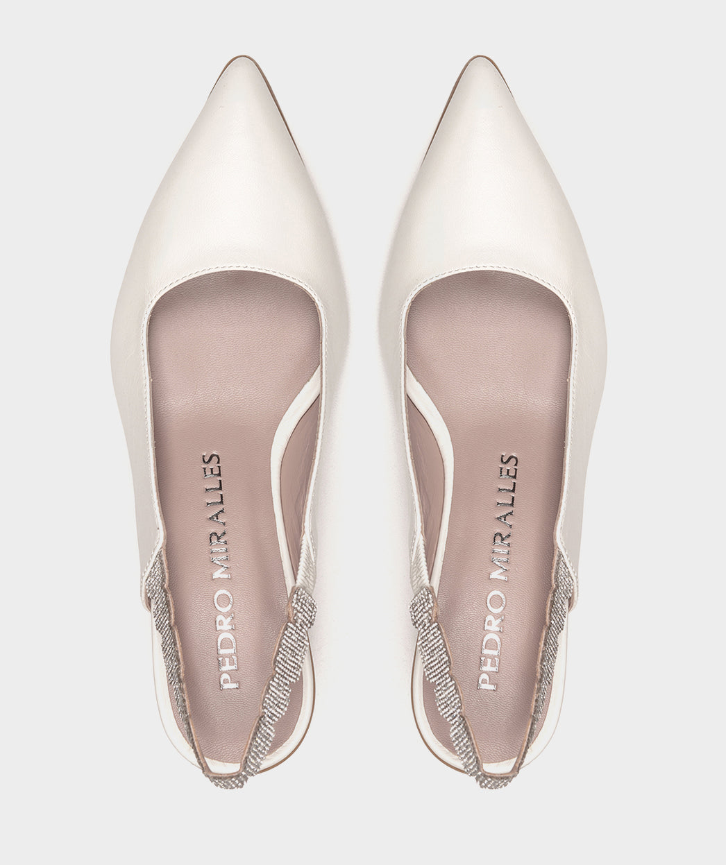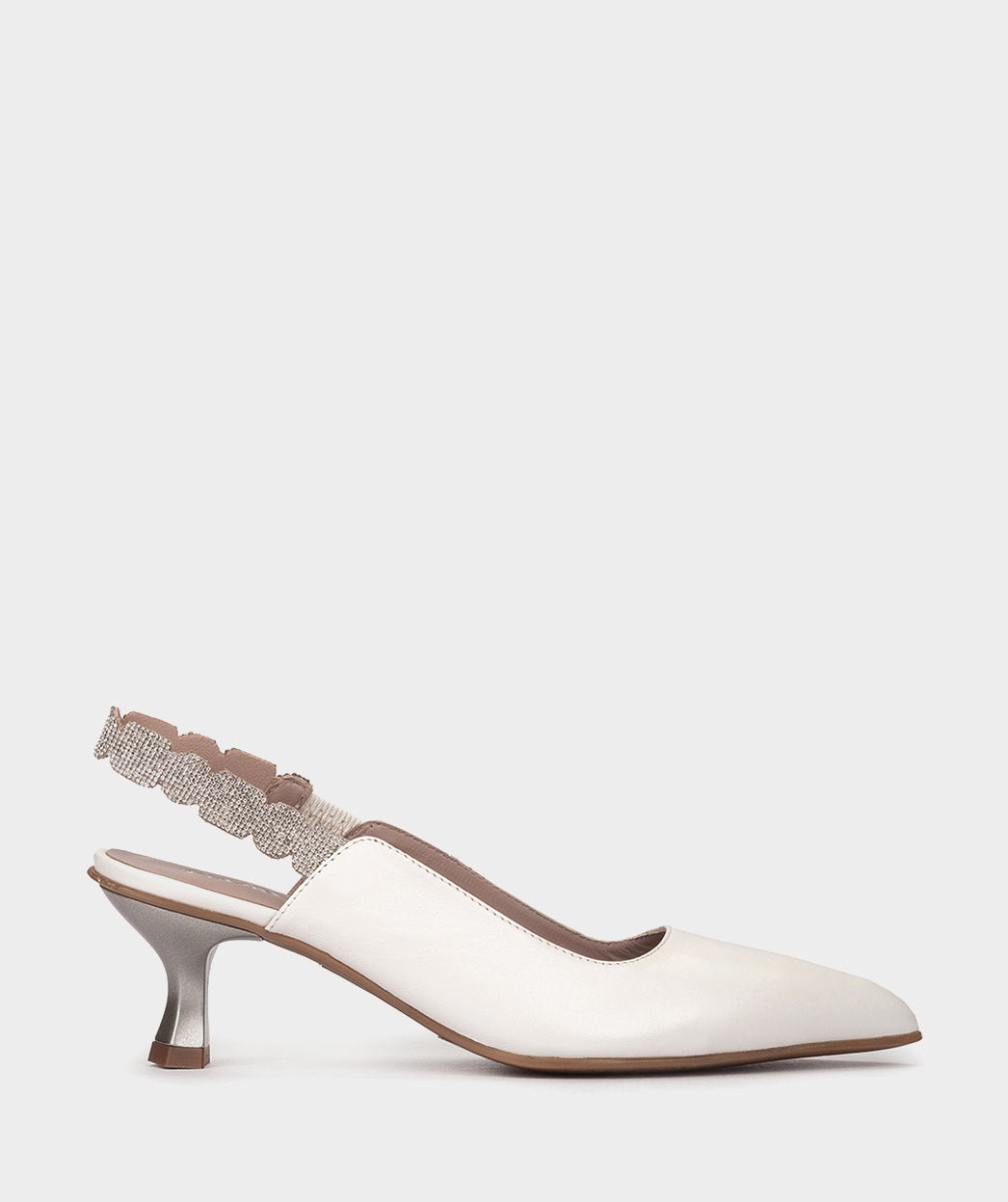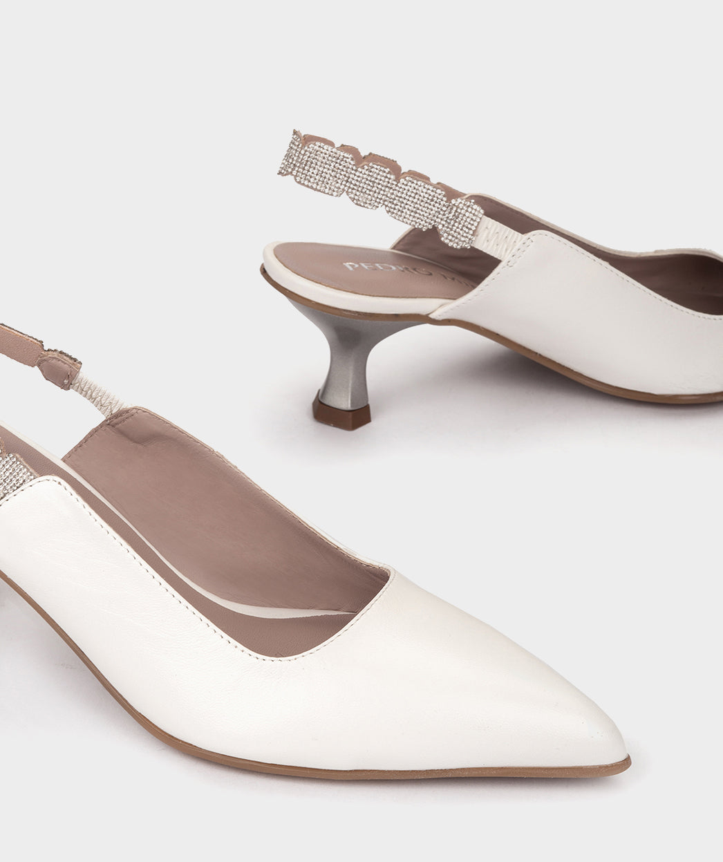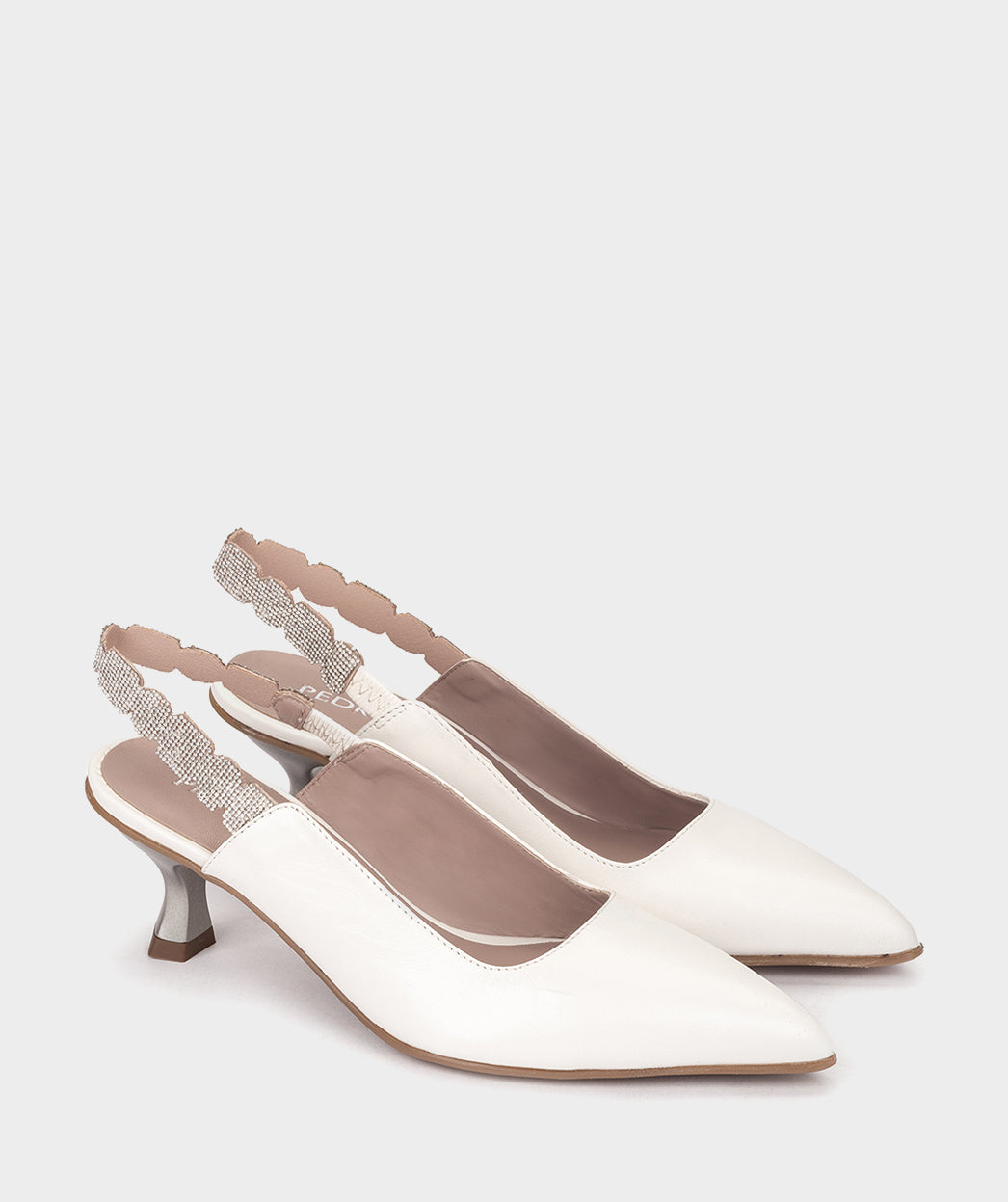 Sapatos de salto aberto em pele branca. Conforto e estilo unem-se para criar o modelo ESLIDA. Se procura um sapato elegante, mas a sua prioridade é o conforto, esta opção é ideal para si.