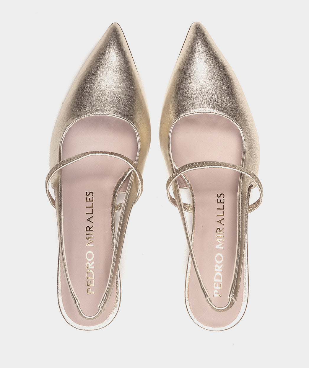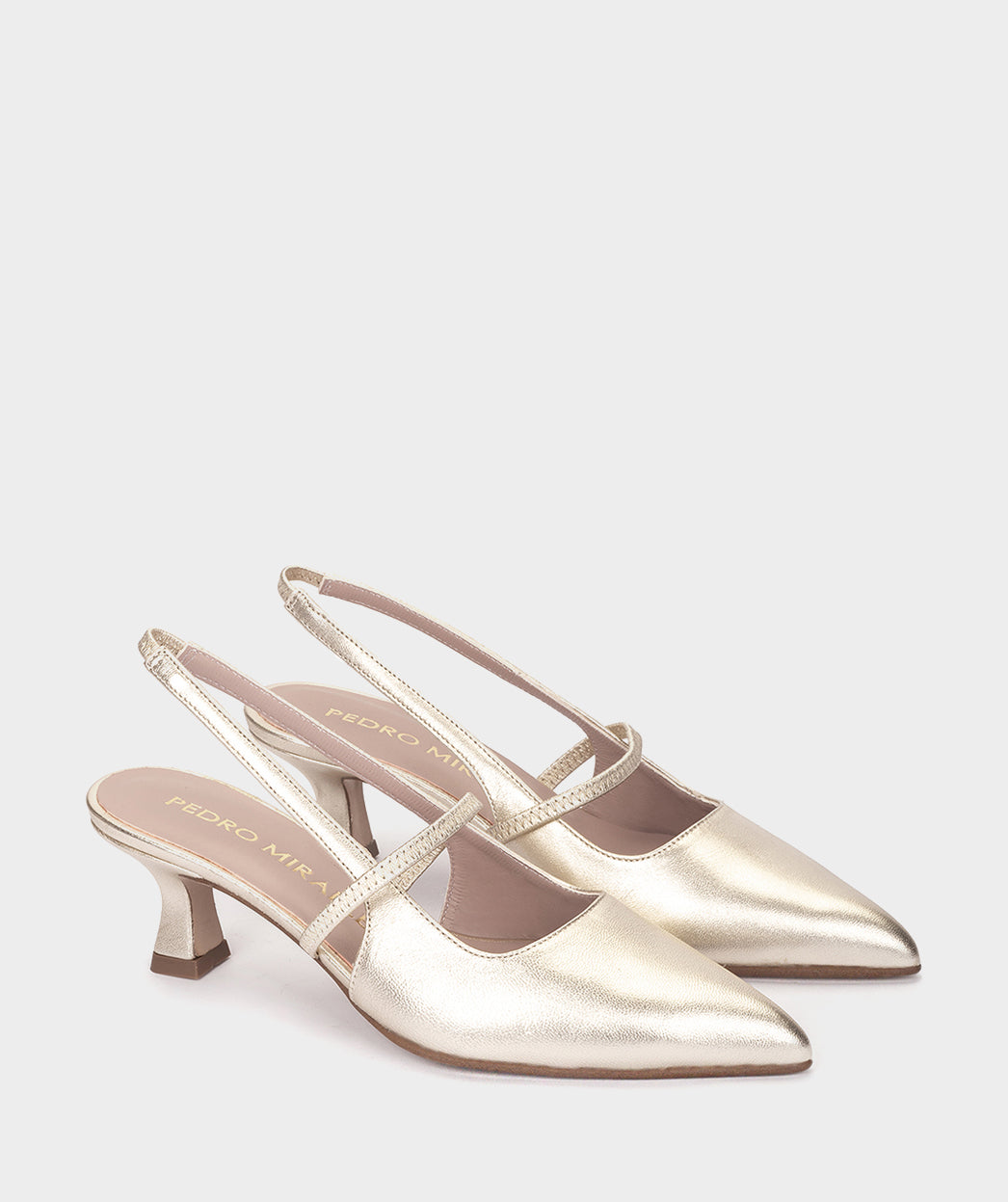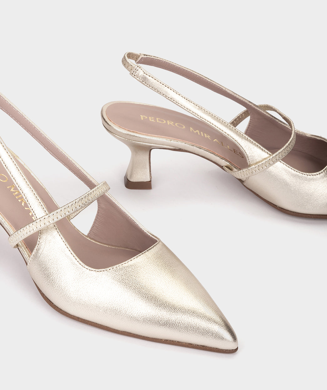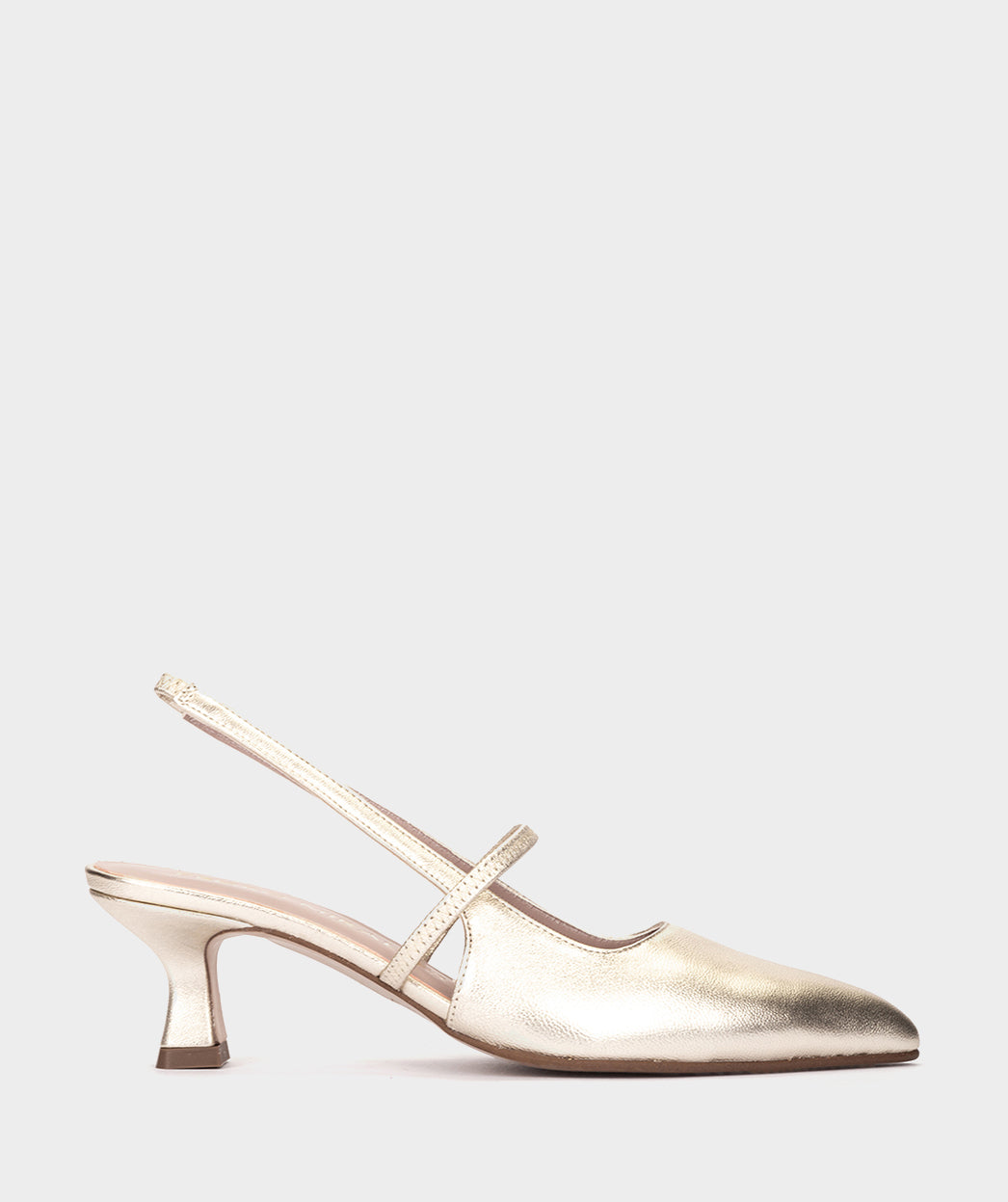 Salto slingback em pele metalizada na cor platina. O conforto e o estilo unem-se para criar o modelo PINA. Se procura um calçado elegante, mas a sua prioridade é o conforto, esta opção é ideal para si._x000D_
