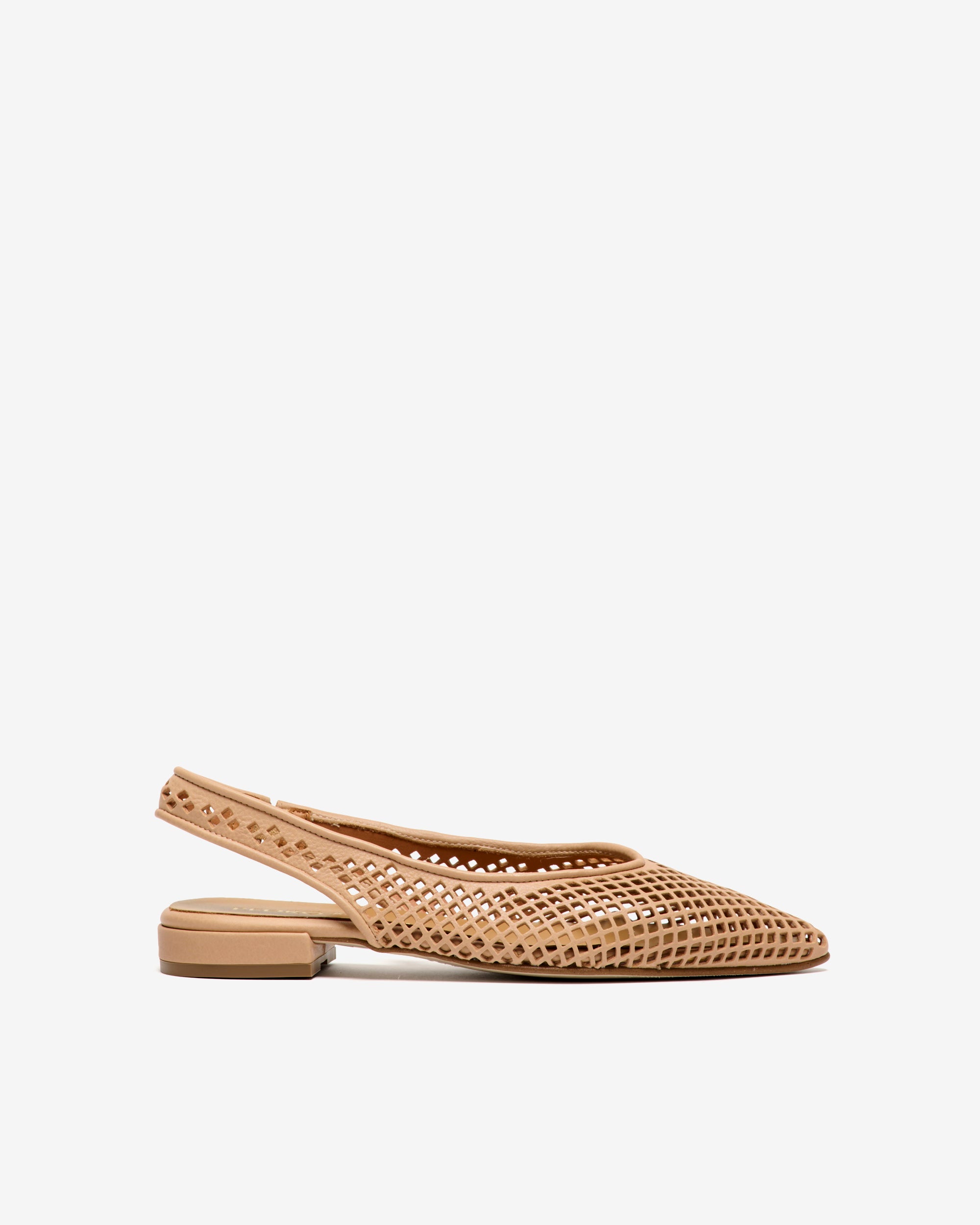Sapatos planos de couro bege tipo slingback. Um design que se destaca pelo seu efeito de silhueta. O elástico lateral permite que o tênis seja colocado confortavelmente, além de um ajuste ideal.